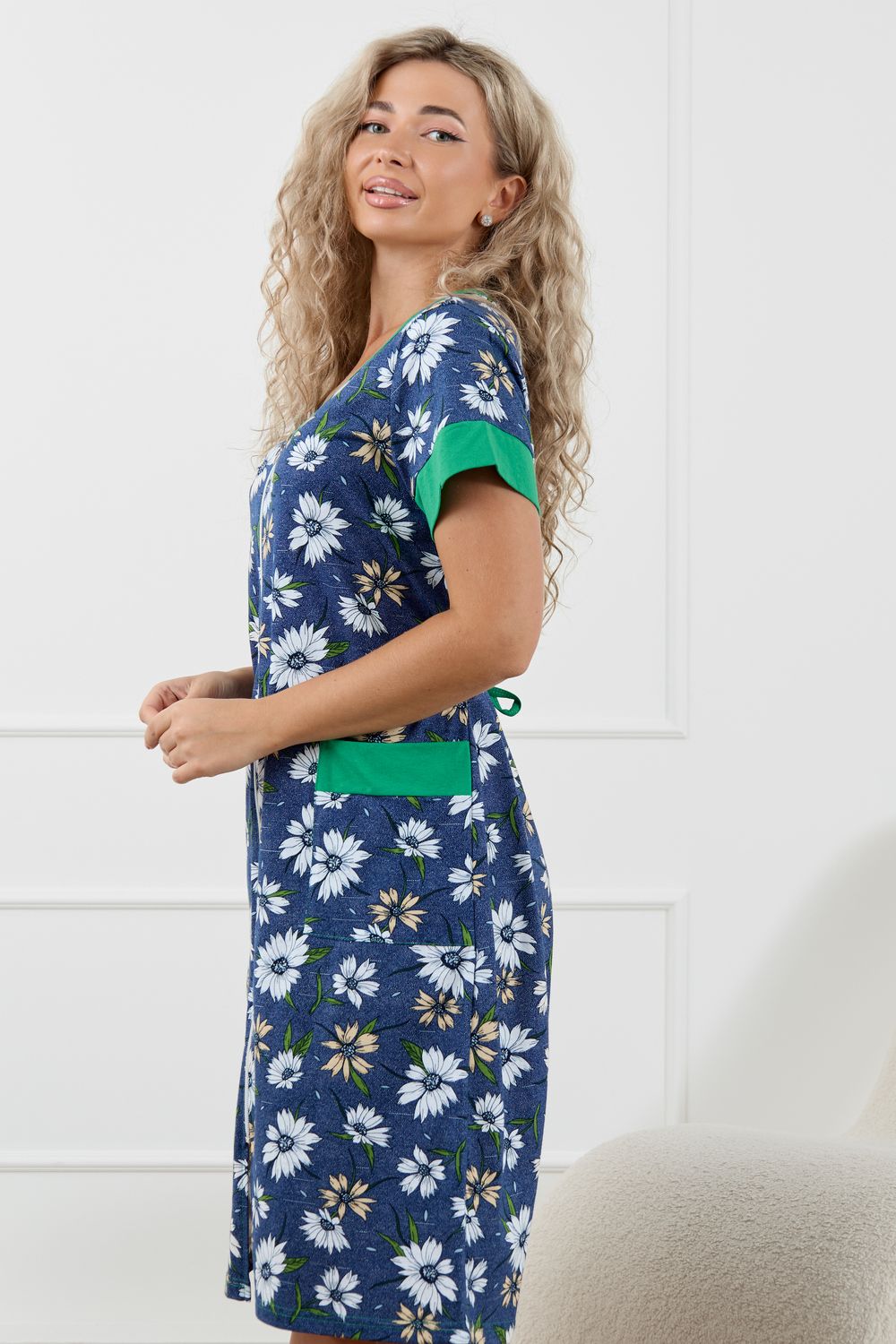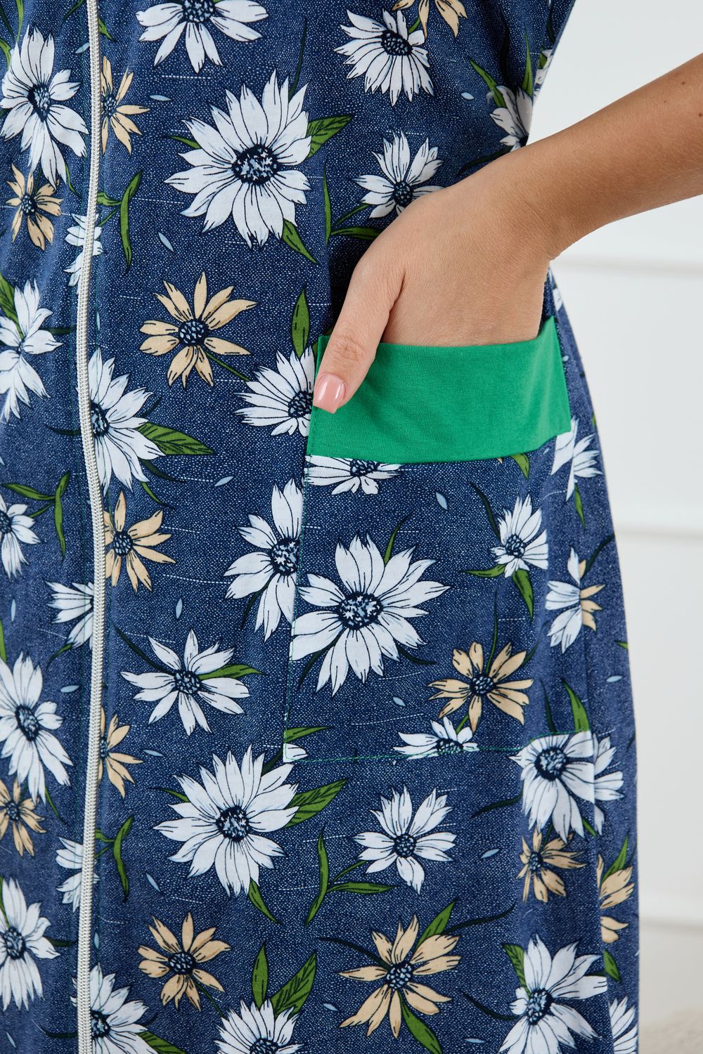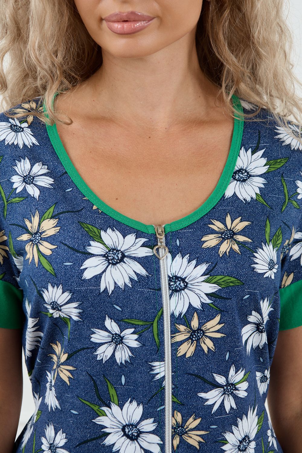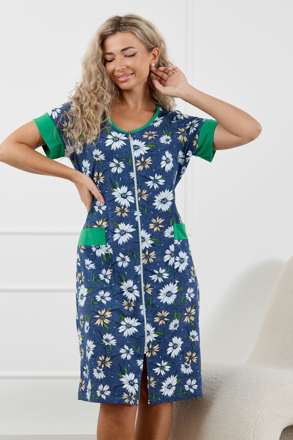 Женский халатик на молнии – самая распространенная и универсальная одежда для домашнего отдыха и хозяйственных хлопот. После трудного рабочего дня, приходя домой, первым делом хочется переодеться. И данная модель это идеальный вариант среди представительниц прекрасной половины человечества. Модель выполнена из 100% хлопчатобумажной ткани. Халат так же дополняет яркая отделка по рукавам и карманам. А пояс на линии талии поможет легко смоделировать женственный силуэт и при этом Вы будете чувствовать себя легко и непринуждённо. Данная модель прекрасно подойдёт для дома, дачи и отдыха, создавая по-настоящему яркий образ и хорошее настроение! Рост модели на фото 165см.
