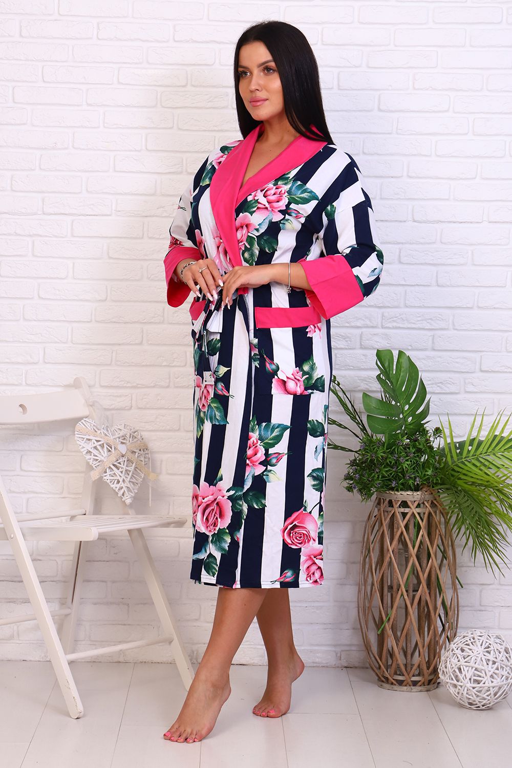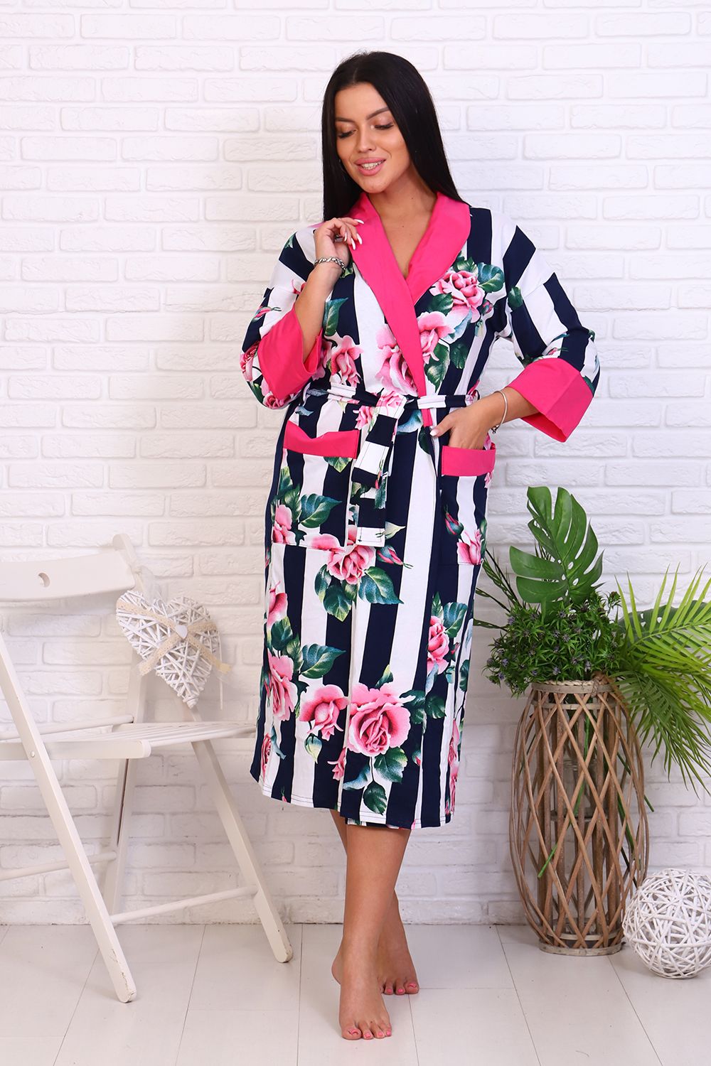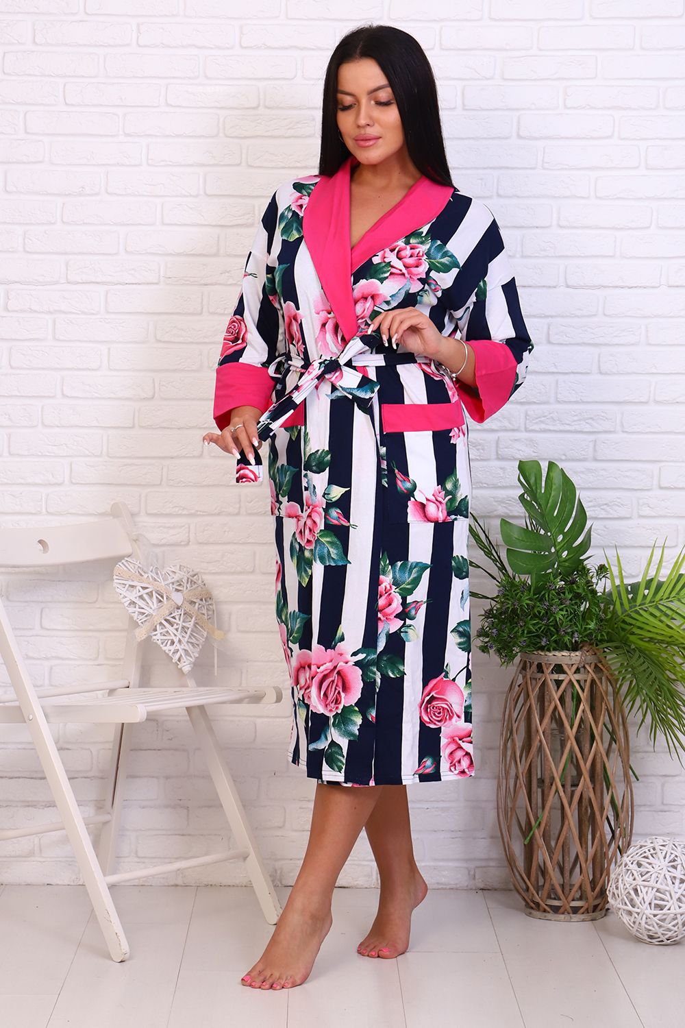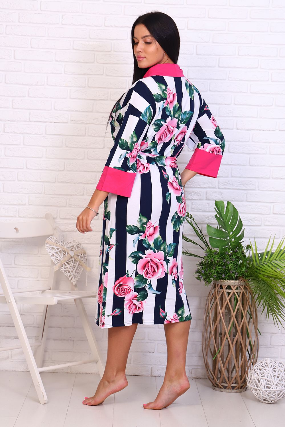 Оригинальный женский халат с красивым принтом на ткани в виде полос и роз. Застегивается на запах с поясом, длина ниже колена