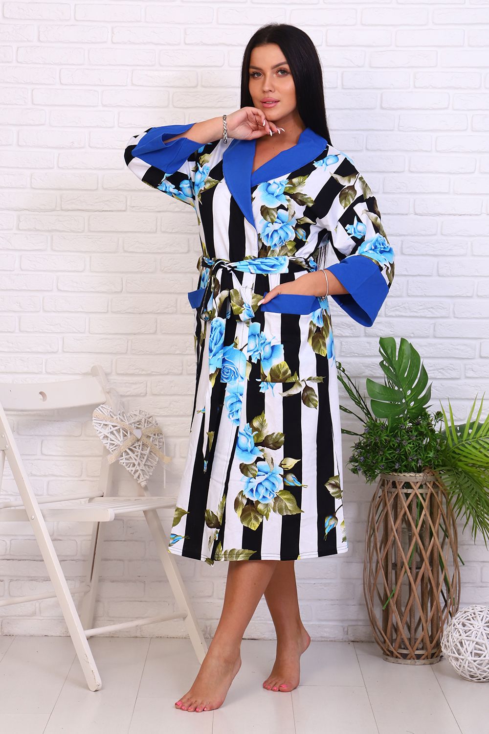 Оригинальный женский халат с красивым принтом на ткани в виде полос и роз. Застегивается на запах с поясом, длина ниже колена