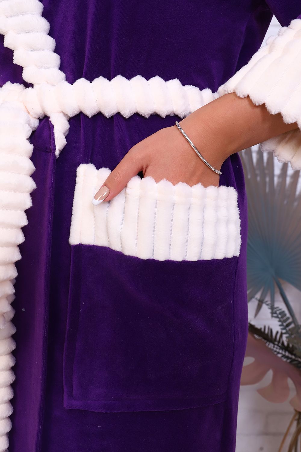 Очень теплый и уютный халат из качественного велюра. По бокам накладные карманы, общая длина приблизительно ниже коленей, воротник, пояс и манжеты рукавов из контрастной ткани молочного цвета