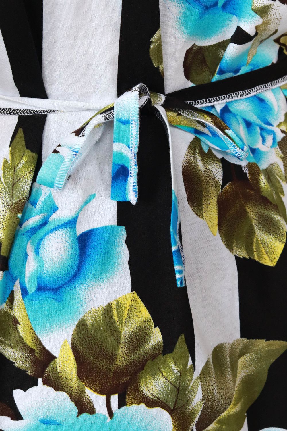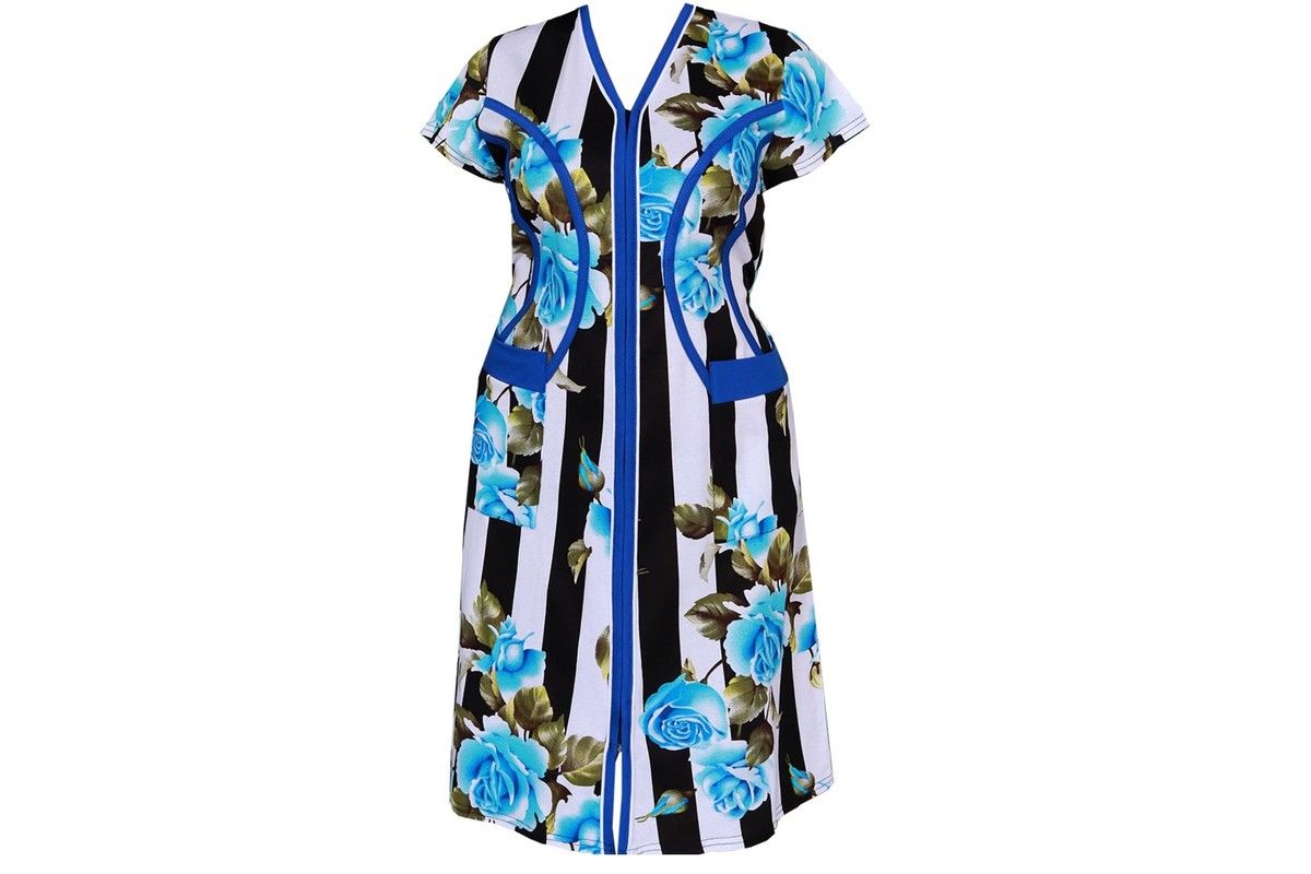 Женский халат средней длины на молнии, с красивым принтом на ткани в виде полос и роз. Общая длина приблизительно до коленей.