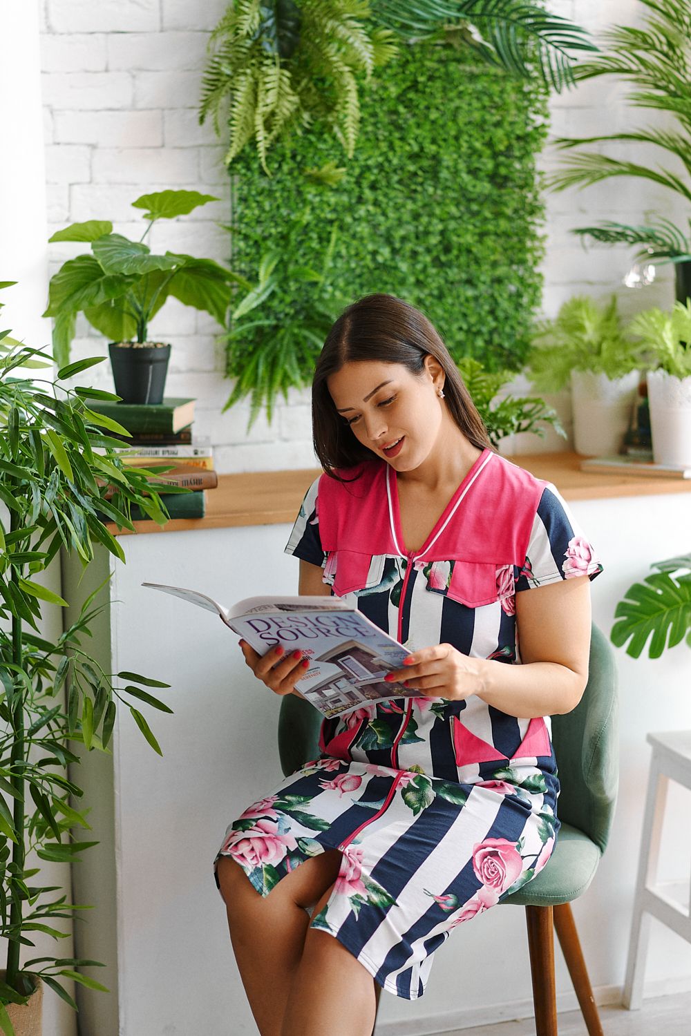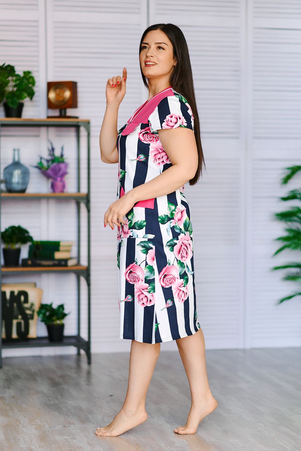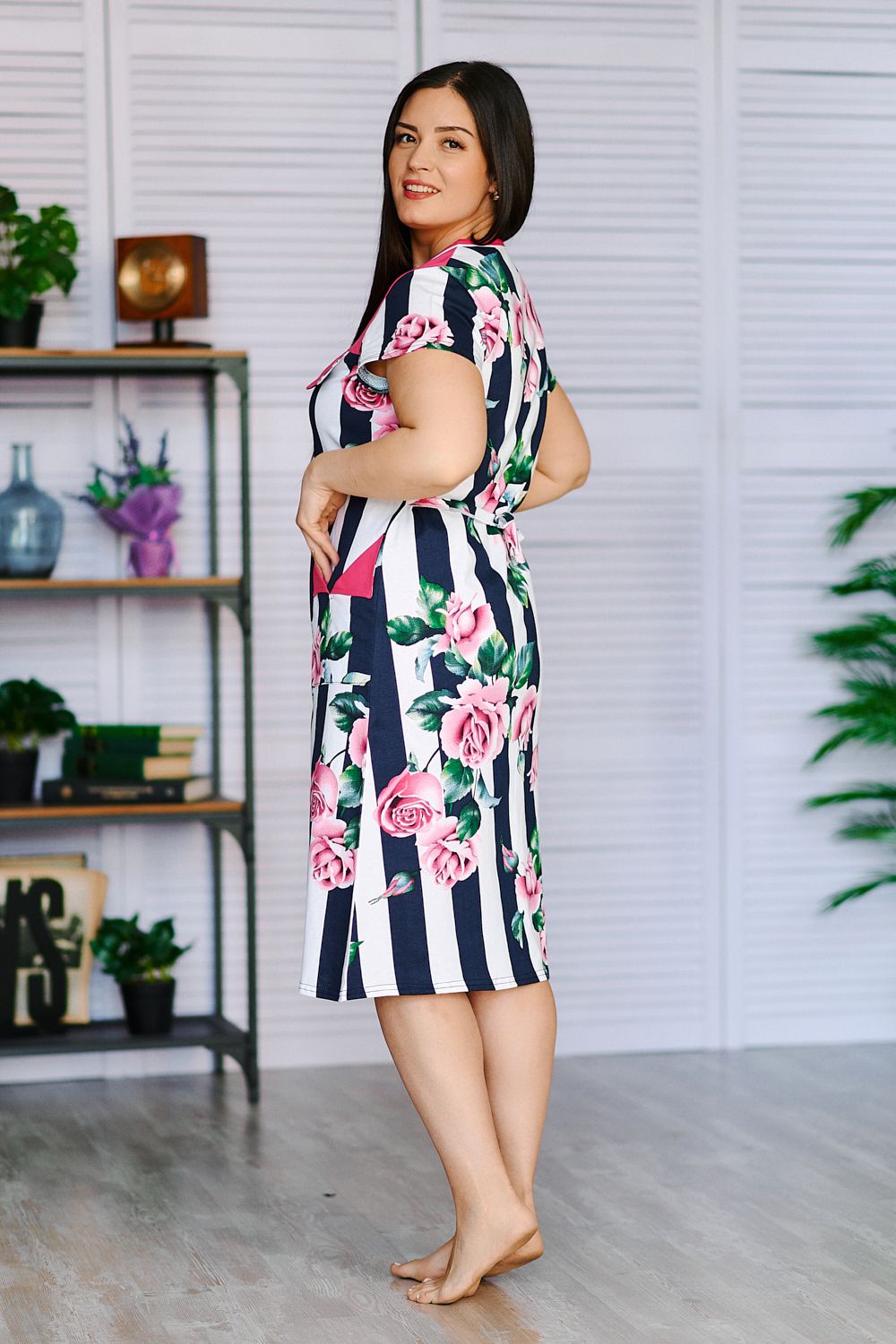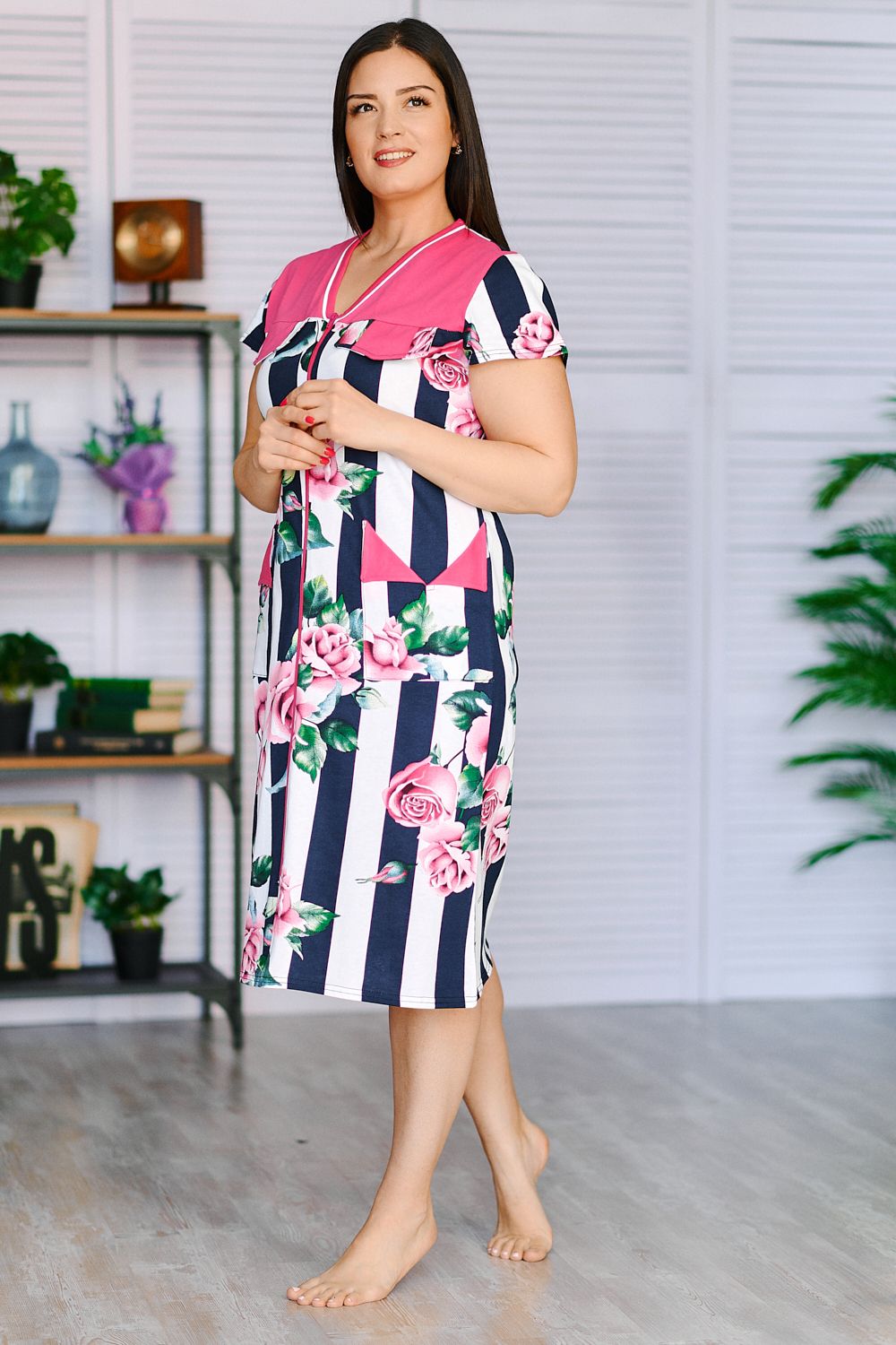 Оригинальный женский халат средней длины на молнии, с красивым принтом на ткани в виде полос и роз. Выполнен из кулирки, с двумя карманами, с поясом.