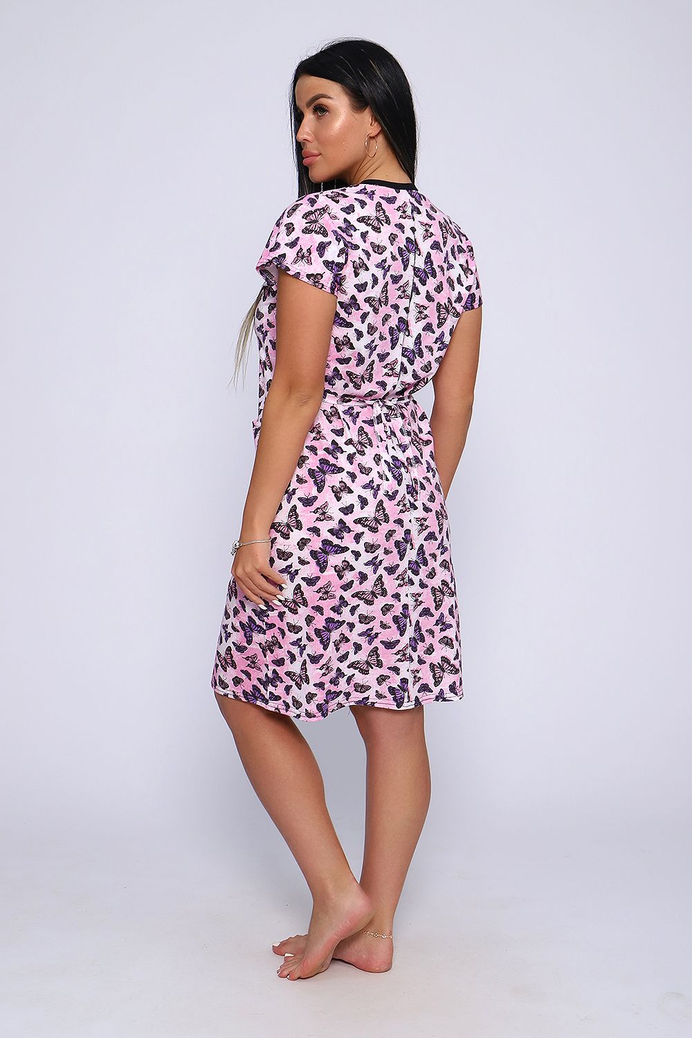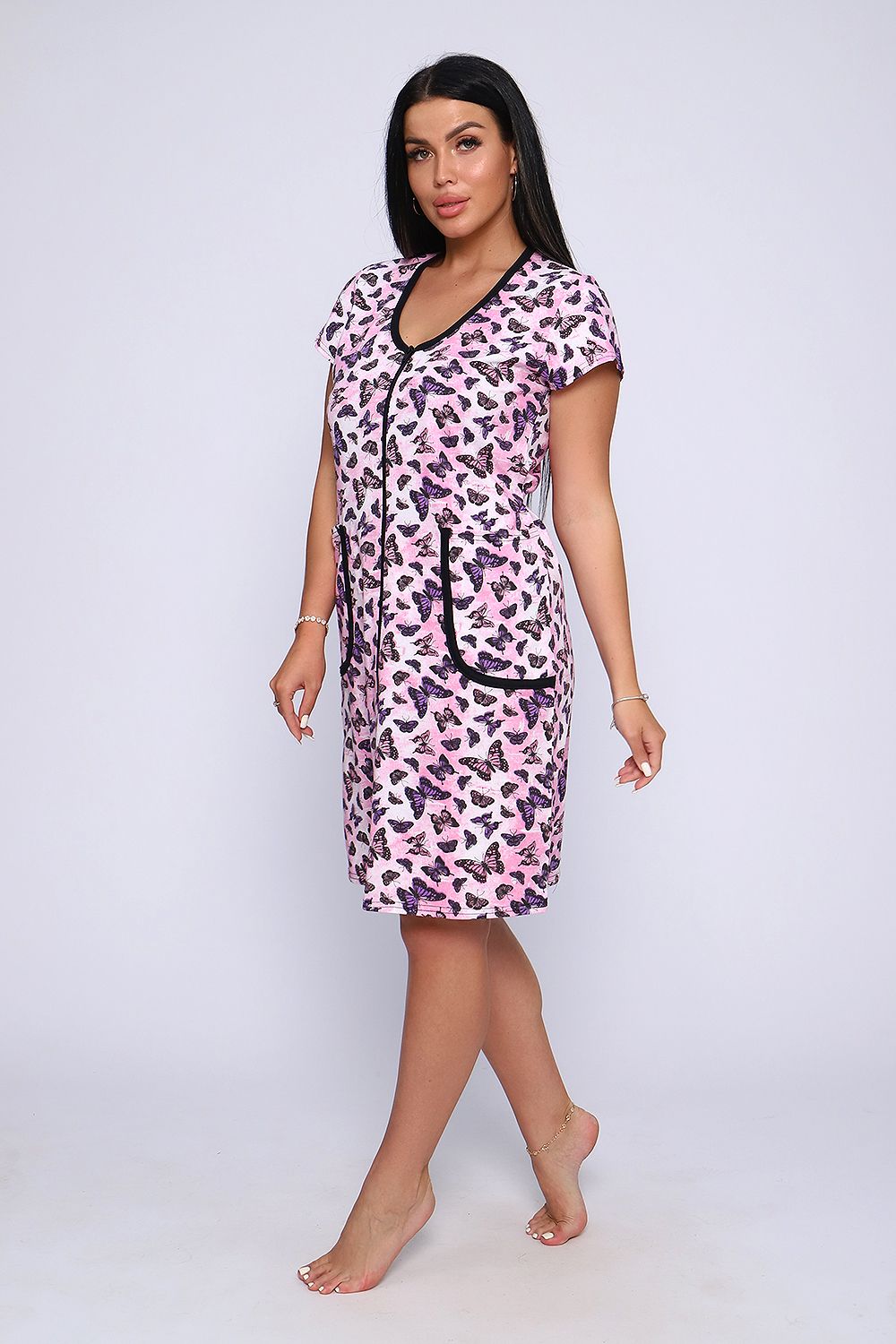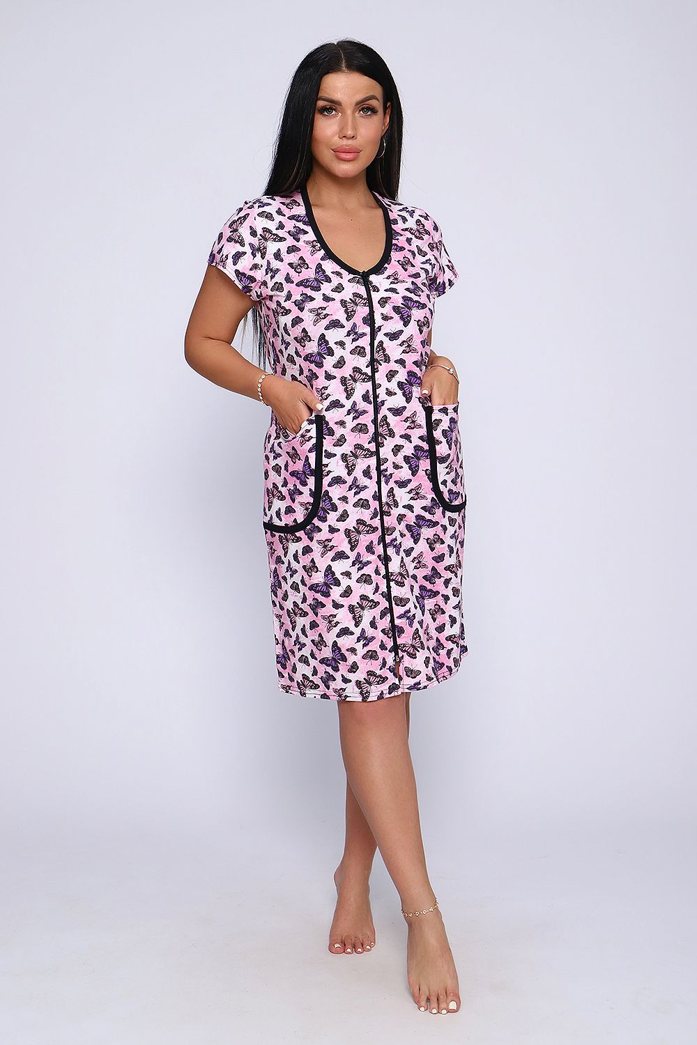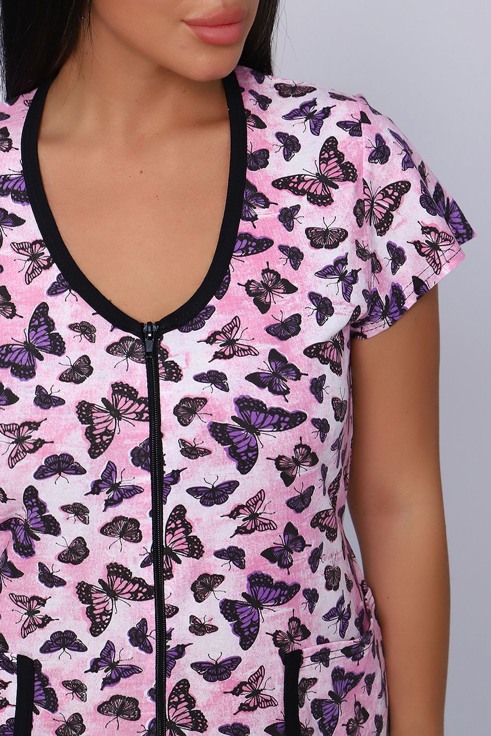 Халат женский оригинальной летней расцветки, на молнии, с боковыми карманами, с коротким рукавом, изготовлен из трикотажного полотна кулирка выполнен из 60% хлопка, 40% полиэстера. Выполнен из кулирки. Общая длина приблизительно до коленей, очень приятный к телу.