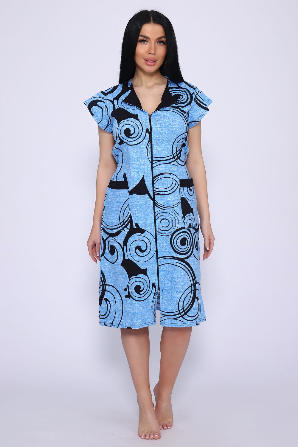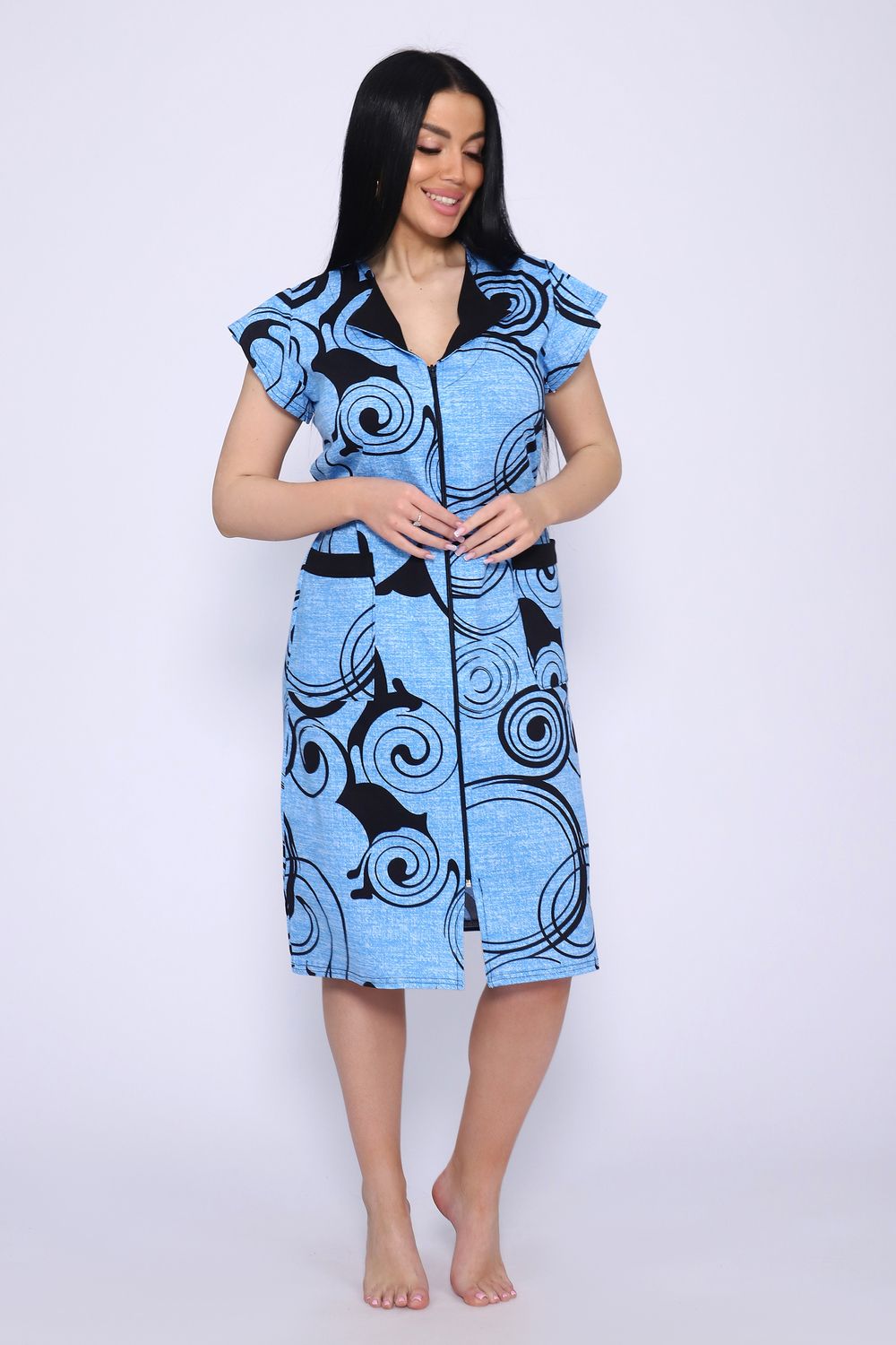 Оригинальный женский халат с красивым принтом на ткани. Рукав короткий в форме крылышка, с накладными карманами, отложной треугольный воротник. Застежка-молния, длина ниже колена, очень приятный к телу.