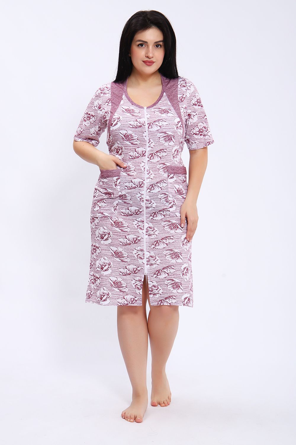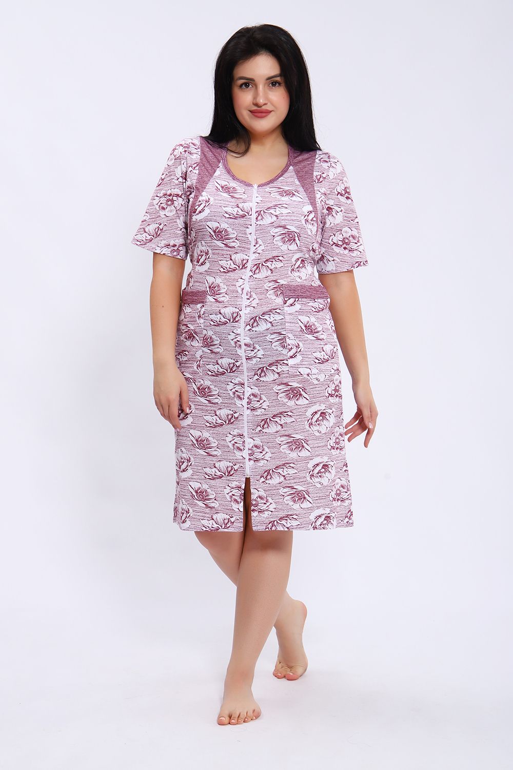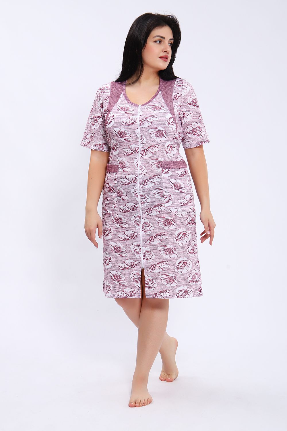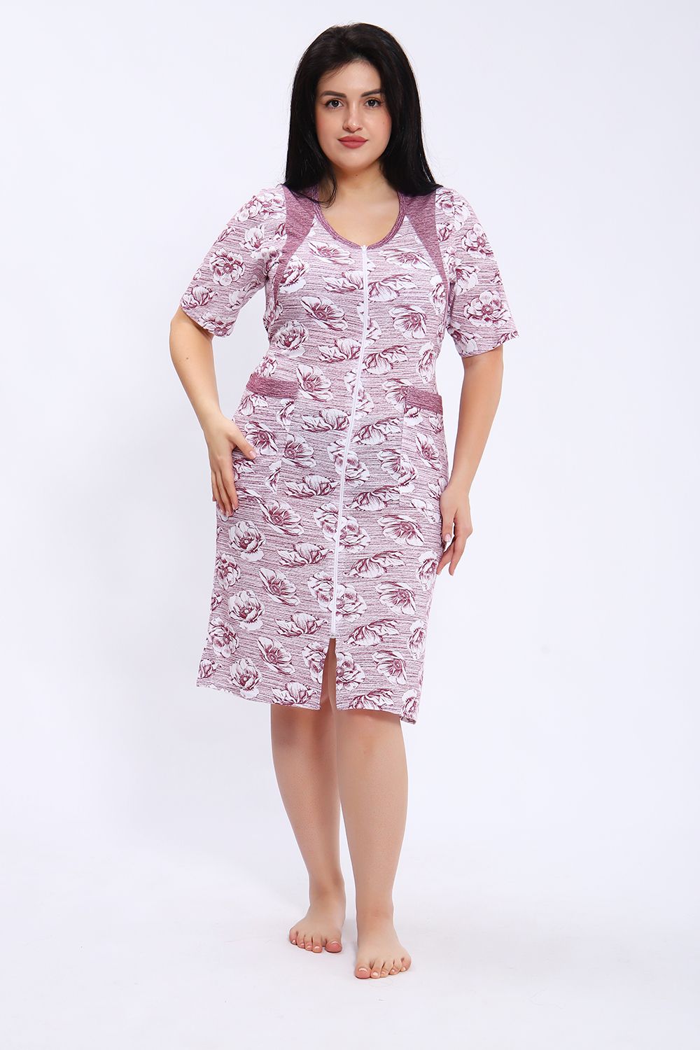 Этот халат представлен в длине миди с короткими рукавами и округлым вырезом горловины. Халат выполнен из ткани с принтом в виде крупных цветов на полосатом фоне. Центральная часть халата украшена вертикальной молнией, которая идет от горловины до нижнего края, позволяя удобно надевать и снимать изделие. Модель также имеет небольшие разрезы внизу для свободы движения. На передней части расположены удобные накладные карманы, выполненные из той же ткани, что и сам халат. Цветовая гамма сочетает оттенки серого и белого, что делает халат стильным и практичным для повседневного ношения.