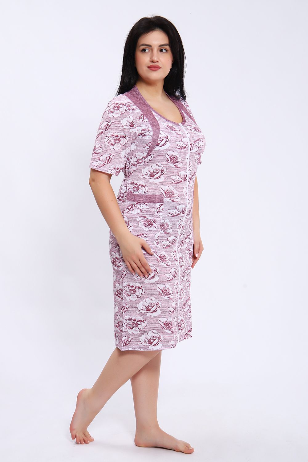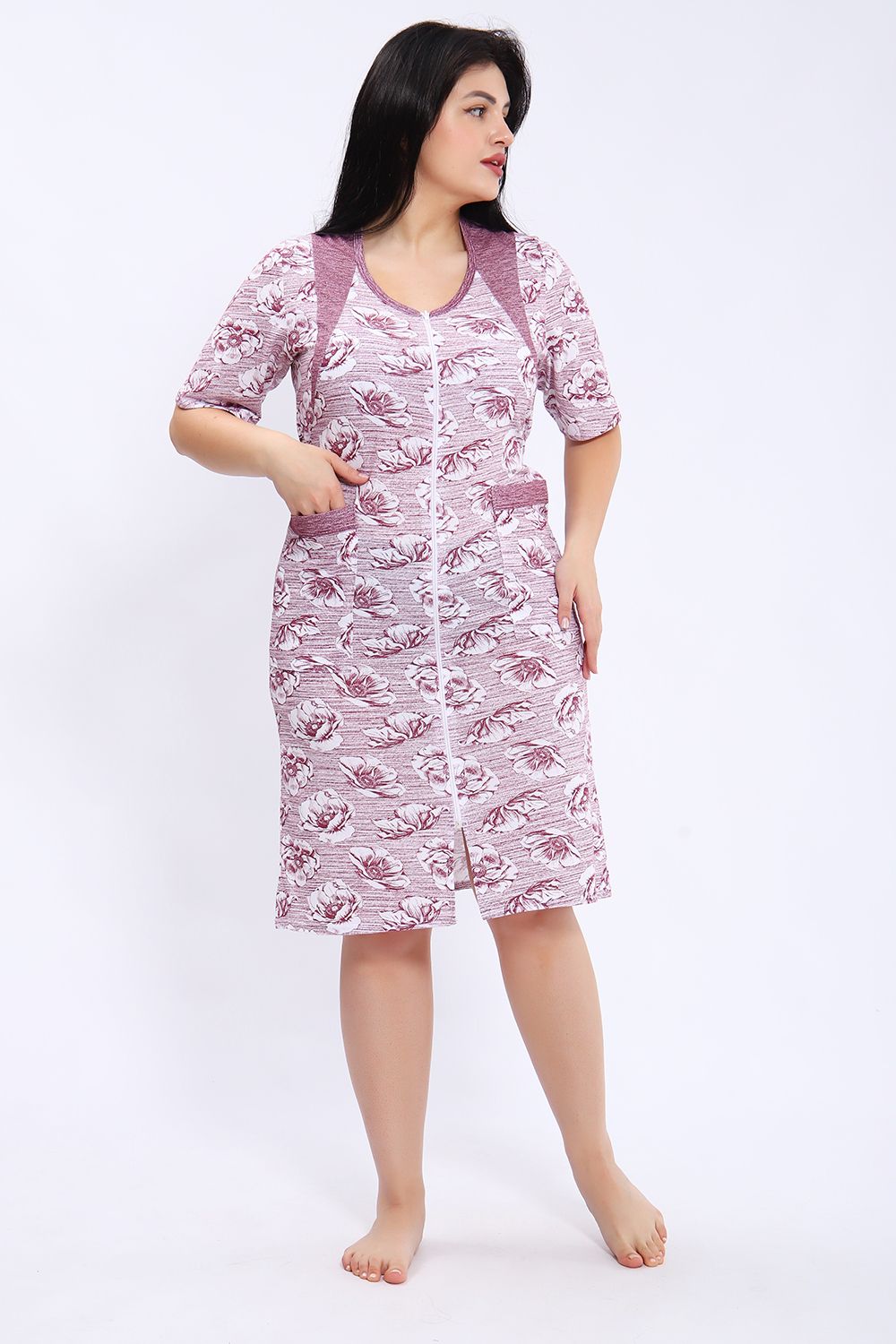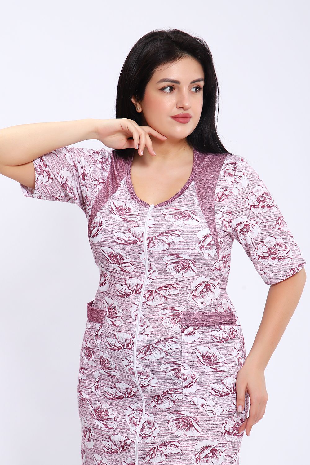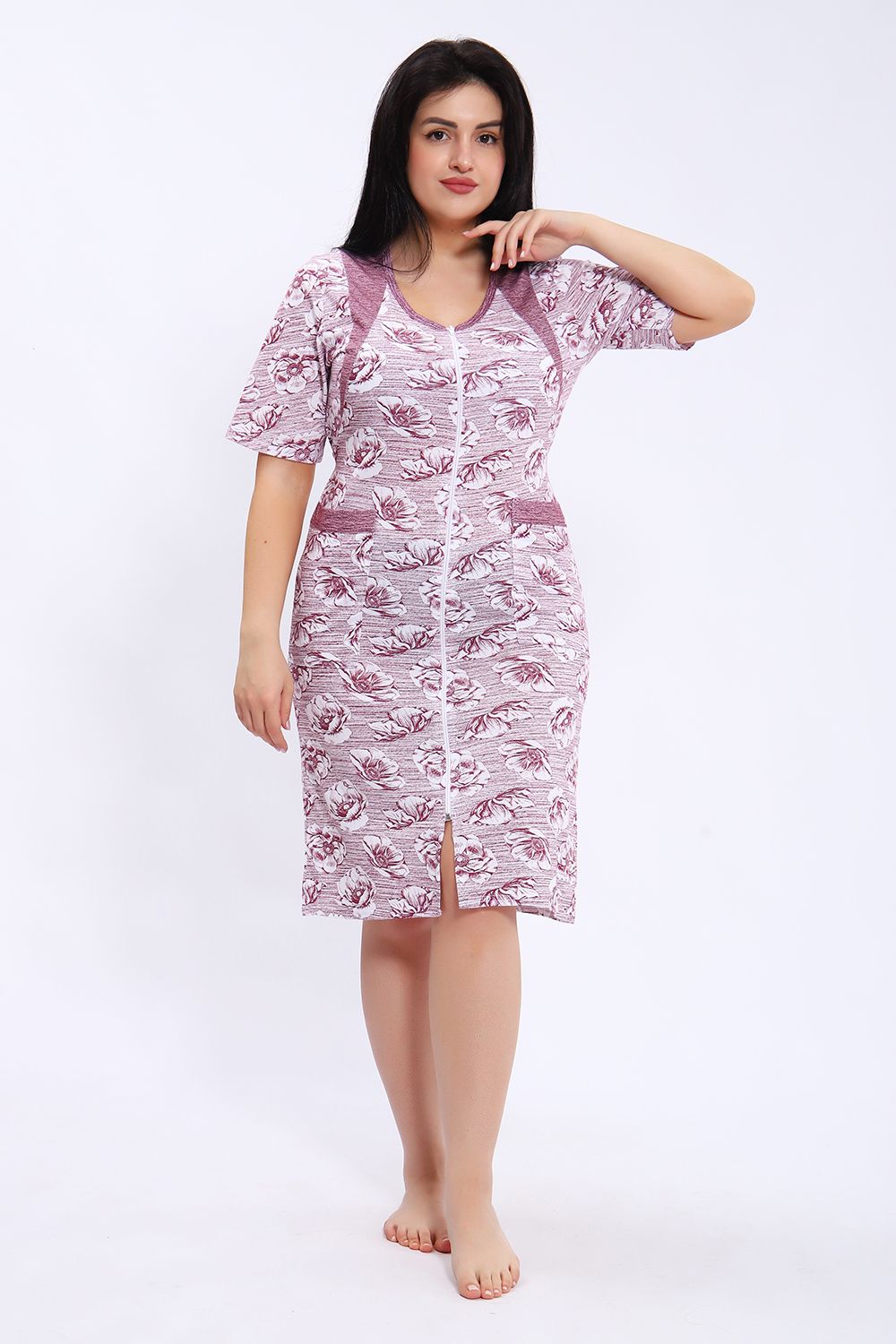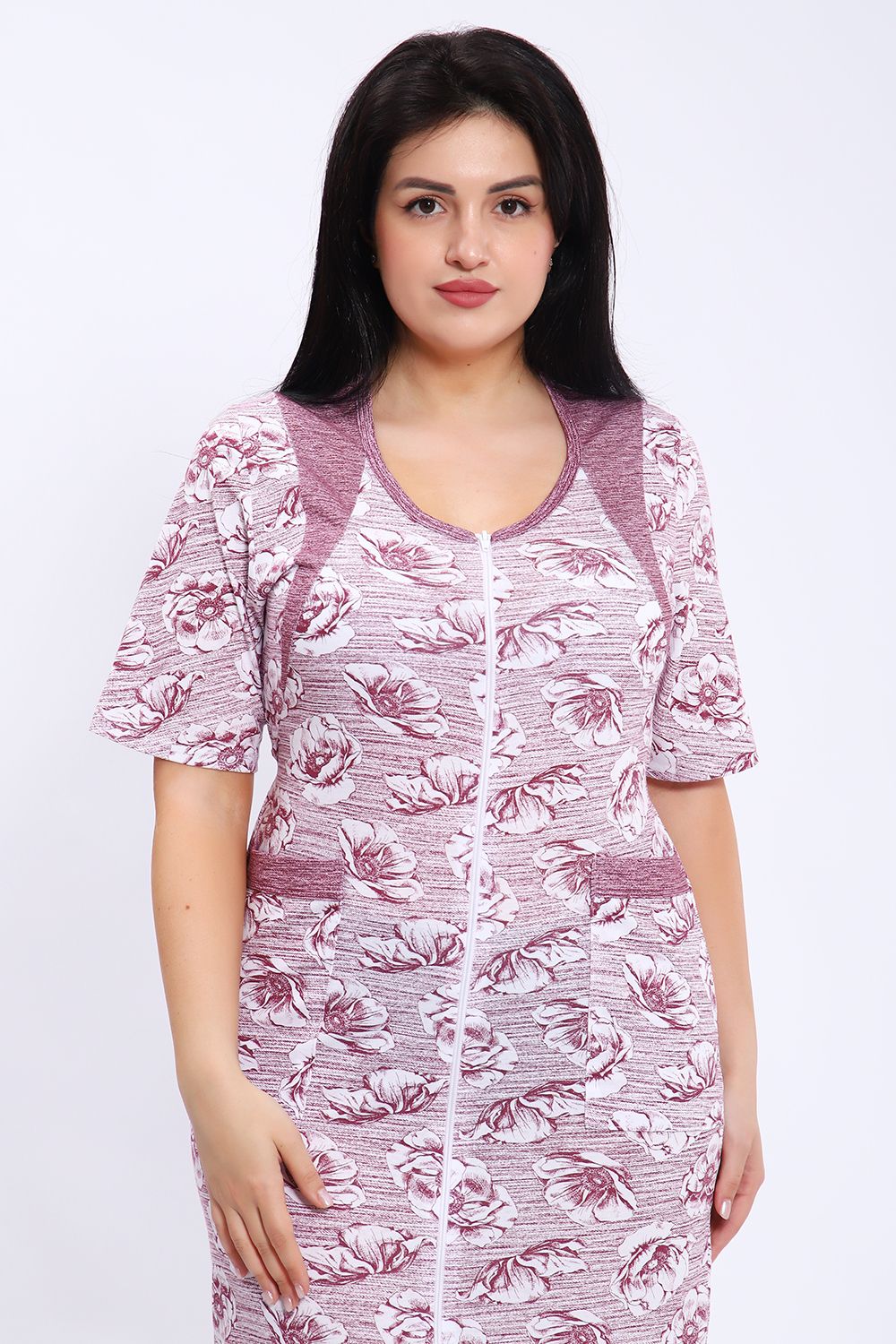 Этот халат представлен в длине миди с короткими рукавами и округлым вырезом горловины. Халат выполнен из ткани с принтом в виде крупных цветов на полосатом фоне. Центральная часть халата украшена вертикальной молнией, которая идет от горловины до нижнего края, позволяя удобно надевать и снимать изделие. Модель также имеет небольшие разрезы внизу для свободы движения. На передней части расположены удобные накладные карманы, выполненные из той же ткани, что и сам халат. Цветовая гамма сочетает оттенки серого и белого, что делает халат стильным и практичным для повседневного ношения.