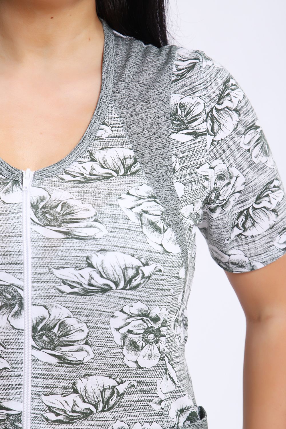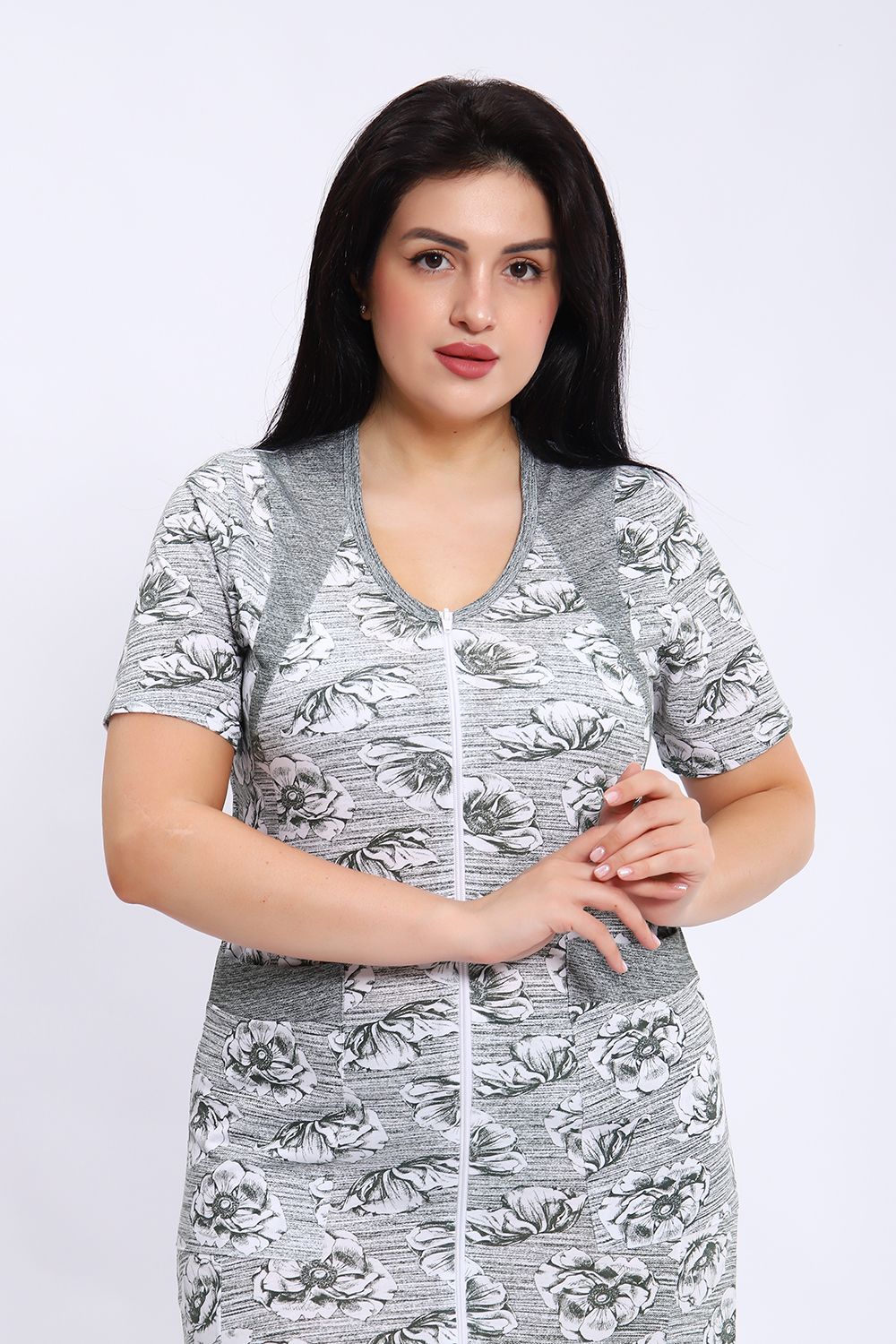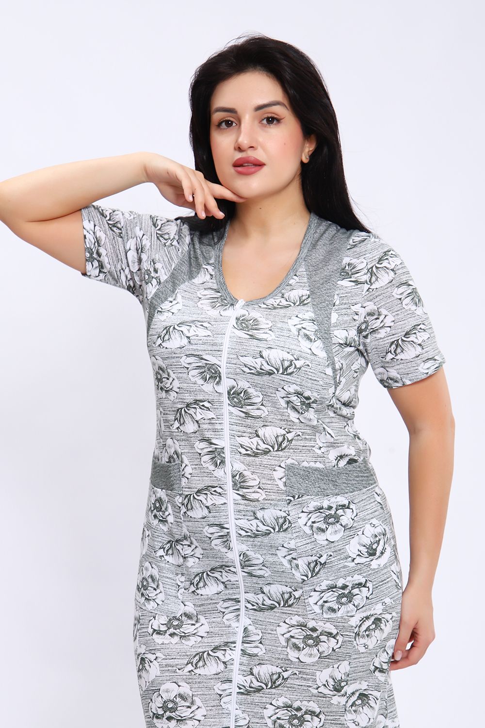 Этот халат представлен в длине миди с короткими рукавами и округлым вырезом горловины. Халат выполнен из ткани с принтом в виде крупных цветов на полосатом фоне. Центральная часть халата украшена вертикальной молнией, которая идет от горловины до нижнего края, позволяя удобно надевать и снимать изделие. Модель также имеет небольшие разрезы внизу для свободы движения. На передней части расположены удобные накладные карманы, выполненные из той же ткани, что и сам халат. Цветовая гамма сочетает оттенки серого и белого, что делает халат стильным и практичным для повседневного ношения.
