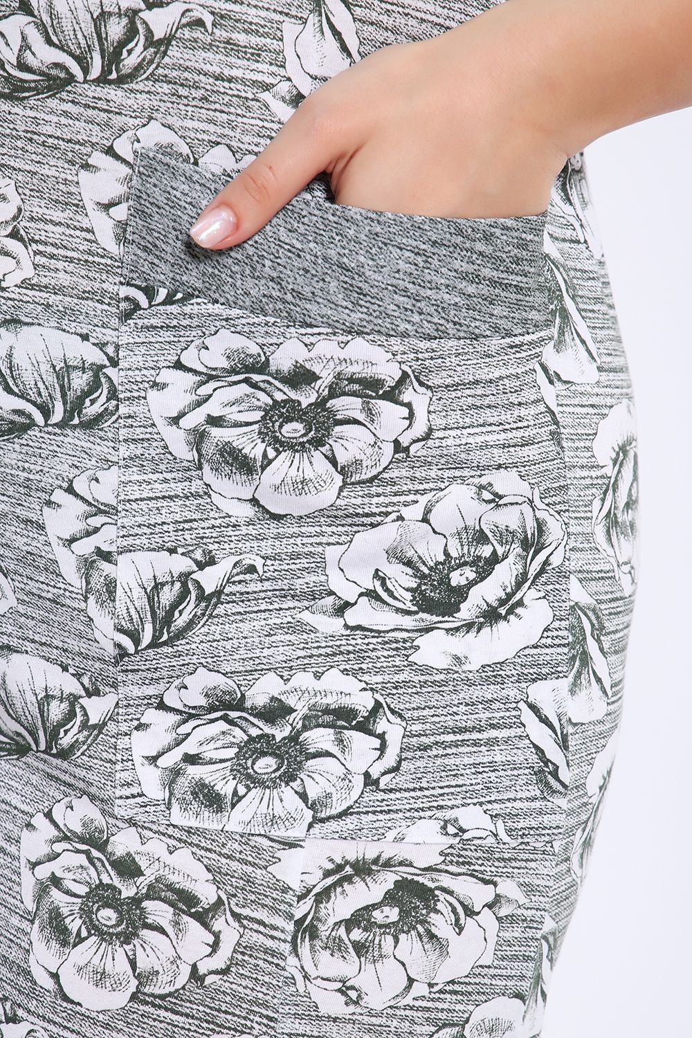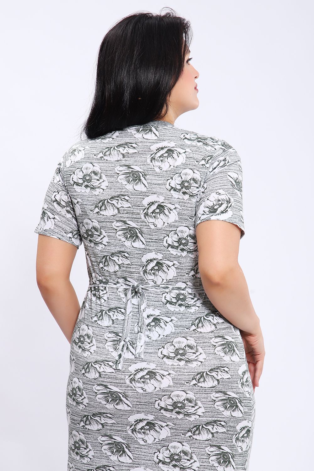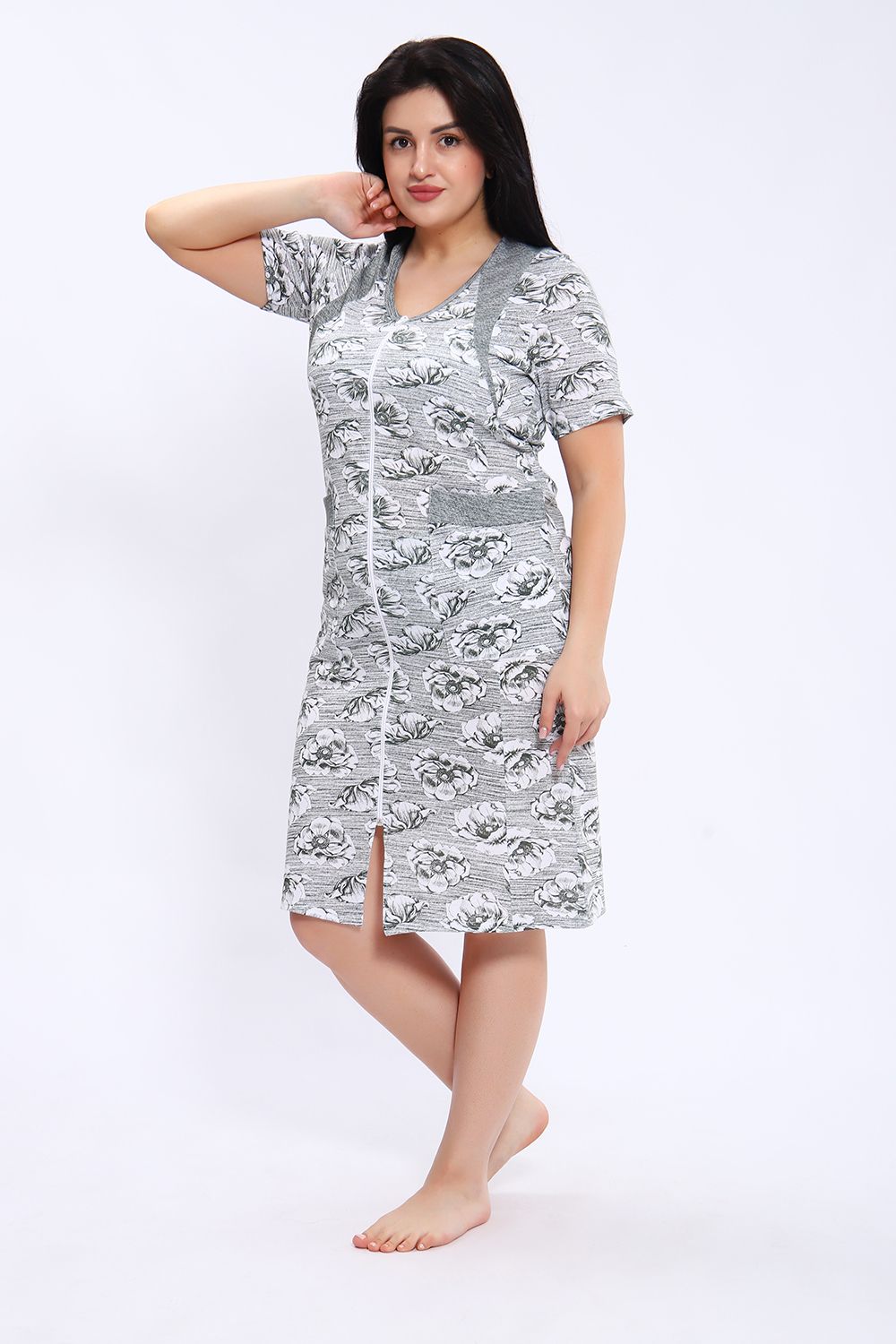 Этот халат представлен в длине миди с короткими рукавами и округлым вырезом горловины. Халат выполнен из ткани с принтом в виде крупных цветов на полосатом фоне. Центральная часть халата украшена вертикальной молнией, которая идет от горловины до нижнего края, позволяя удобно надевать и снимать изделие. Модель также имеет небольшие разрезы внизу для свободы движения. На передней части расположены удобные накладные карманы, выполненные из той же ткани, что и сам халат. Цветовая гамма сочетает оттенки серого и белого, что делает халат стильным и практичным для повседневного ношения.