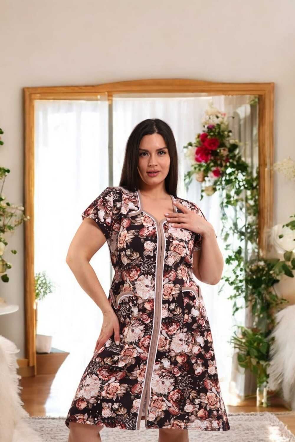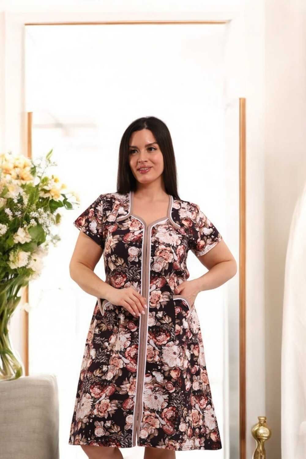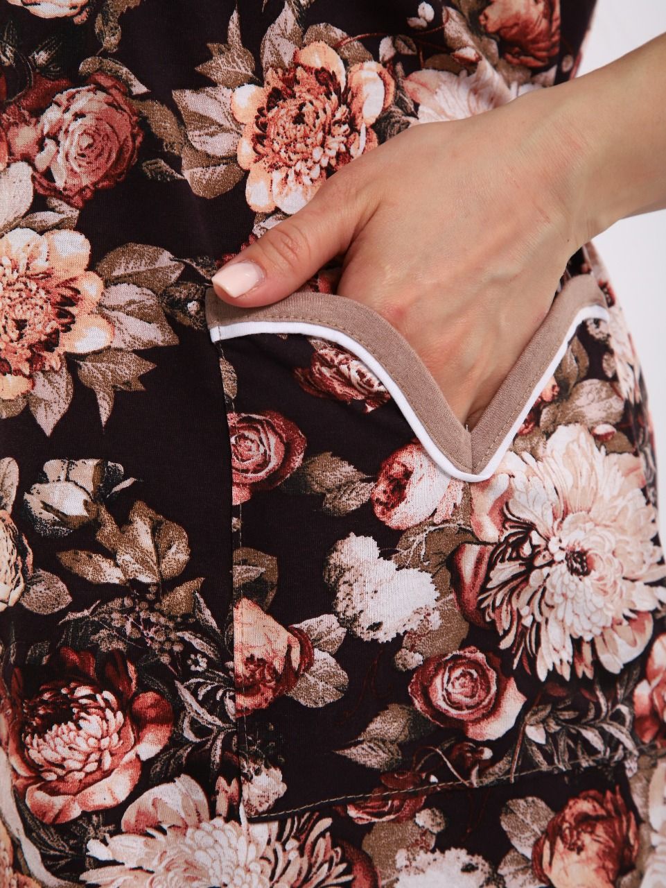 Элегантный и комфортный халат, выполненный из мягкого, дышащего трикотажа. Модель средней длины с короткими рукавами и удобной застёжкой на молнии по всей длине. Изысканный цветочный принт в розово-бежевых тонах на тёмно-коричневом фоне придаёт образу женственность и уют. Прямой силуэт с лёгкой приталенностью за счёт завязки на талии сзади. Короткие рукава, удобные для повседневного ношения. Два глубоких накладных кармана с контрастной отделкой, окантовка горловины, рукавов и карманов белой и бежевой бейкой.