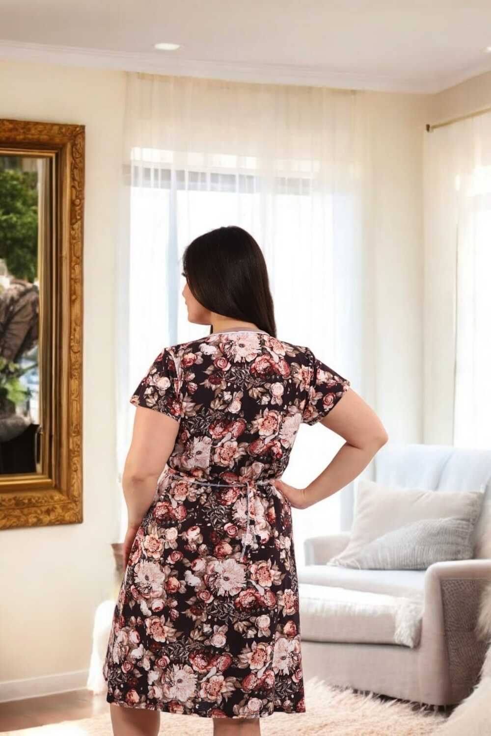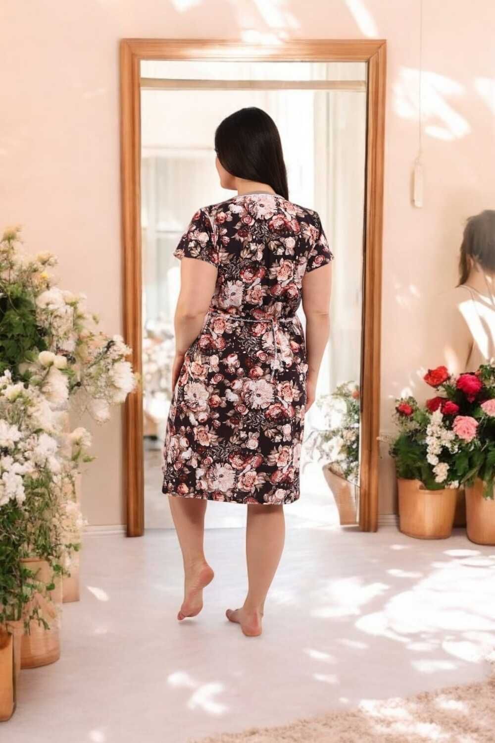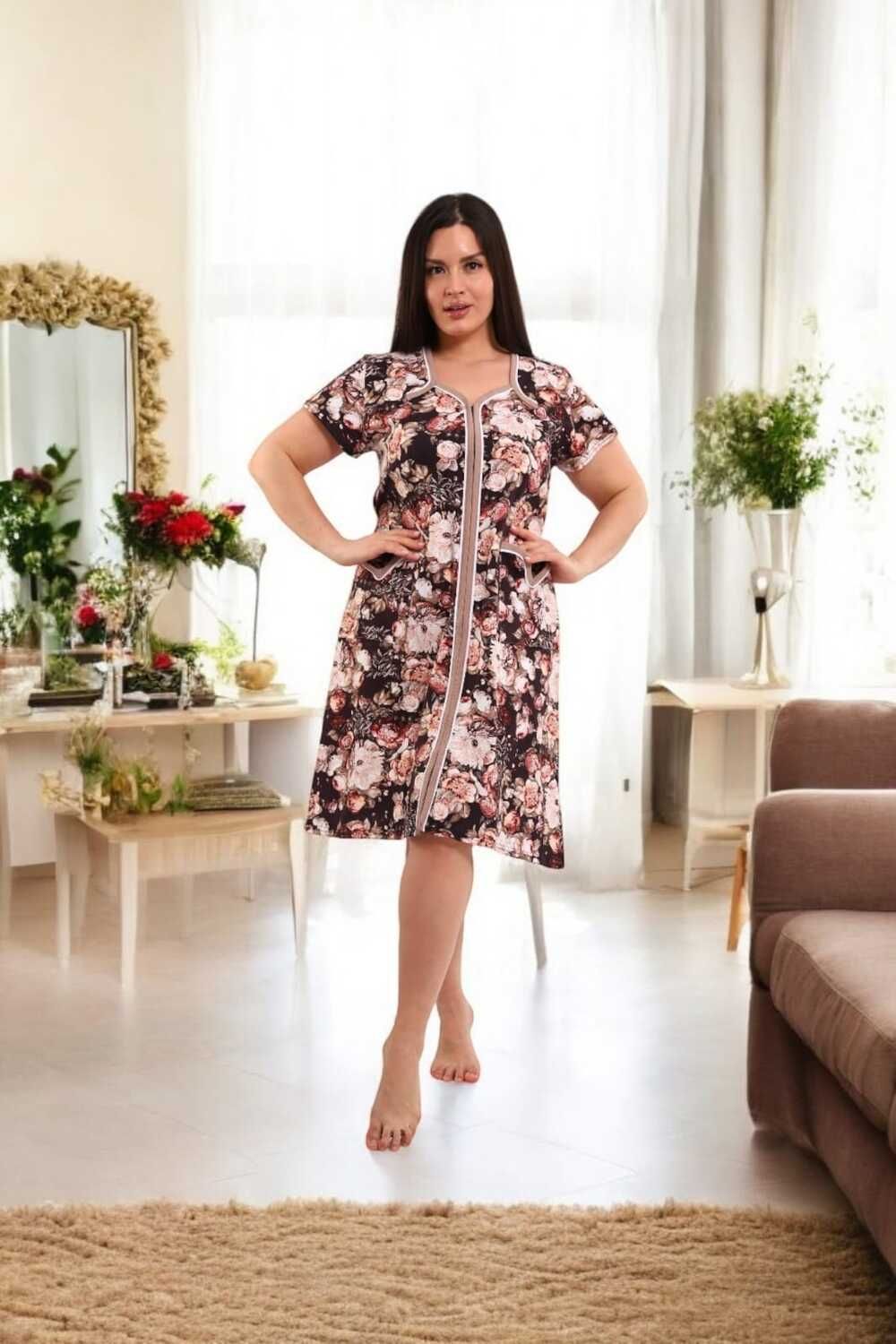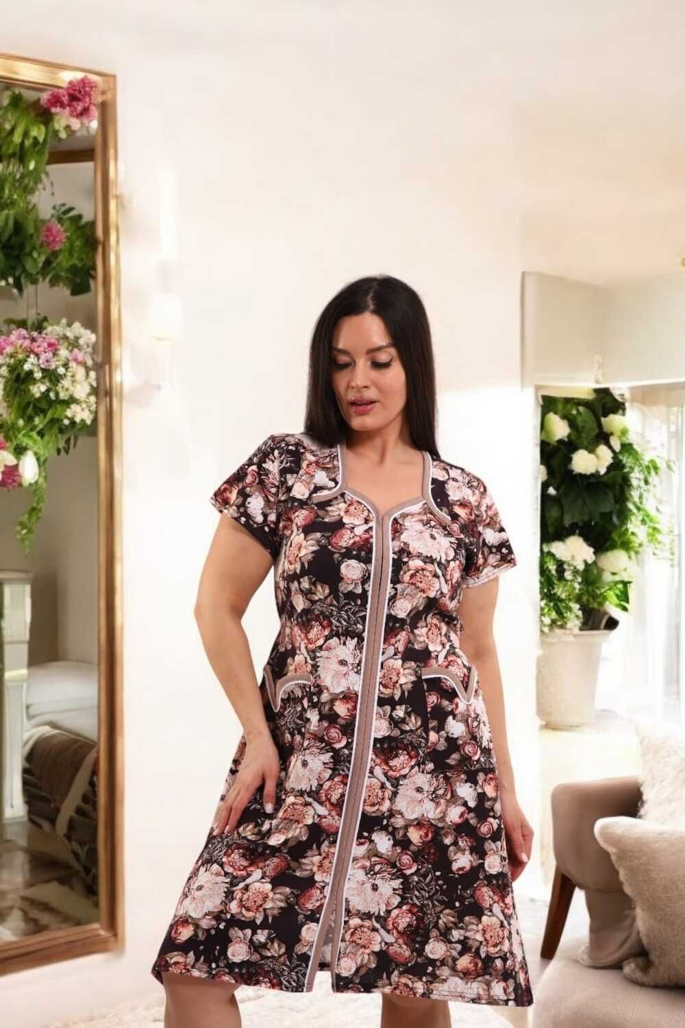 Элегантный и комфортный халат, выполненный из мягкого, дышащего трикотажа. Модель средней длины с короткими рукавами и удобной застёжкой на молнии по всей длине. Изысканный цветочный принт в розово-бежевых тонах на тёмно-коричневом фоне придаёт образу женственность и уют. Прямой силуэт с лёгкой приталенностью за счёт завязки на талии сзади. Короткие рукава, удобные для повседневного ношения. Два глубоких накладных кармана с контрастной отделкой, окантовка горловины, рукавов и карманов белой и бежевой бейкой.