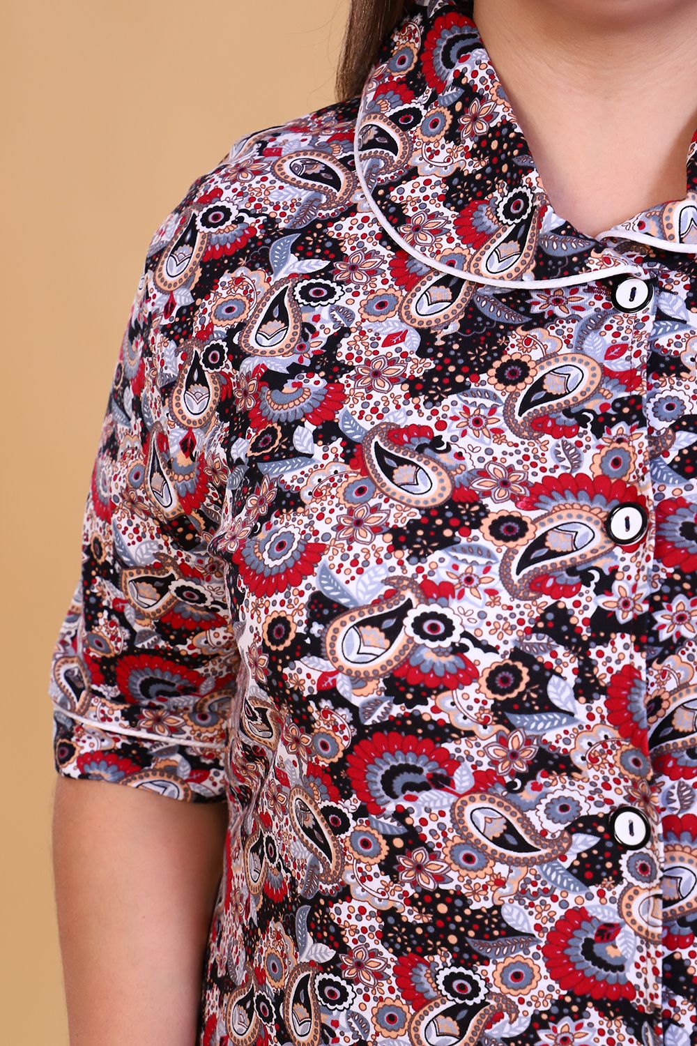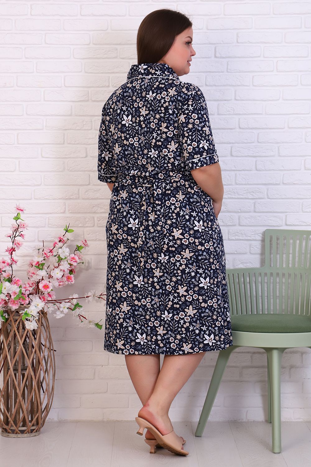 Халат женский на пуговицах, с отложным воротником, накладными карманами. Изготовлен из натурального хлопка. Длина изделия ниже колена, свободный покрой обеспечит вам удобство и не стеснит ваших движений. На спинке халата есть 2 полупояса, которые регулируют объем в талии. В такой модели будет удобно женщине любого возраста. На модели 52 размер