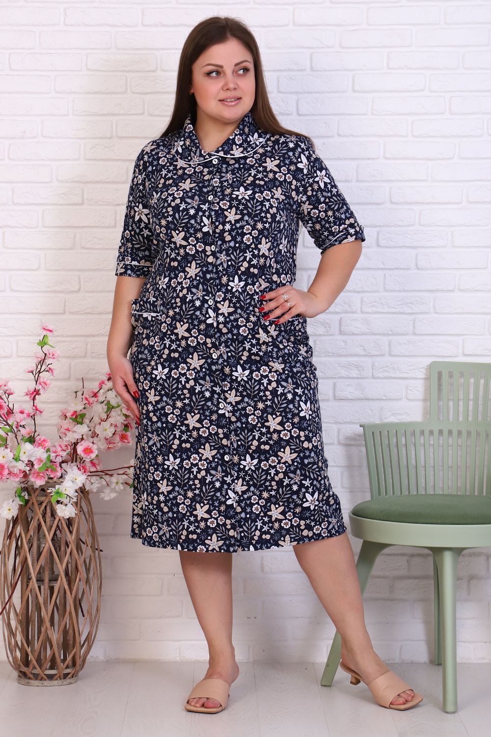 Халат женский на пуговицах, с отложным воротником, накладными карманами. Изготовлен из натурального хлопка. Длина изделия ниже колена, свободный покрой обеспечит вам удобство и не стеснит ваших движений. На спинке халата есть 2 полупояса, которые регулируют объем в талии. В такой модели будет удобно женщине любого возраста. На модели 52 размер