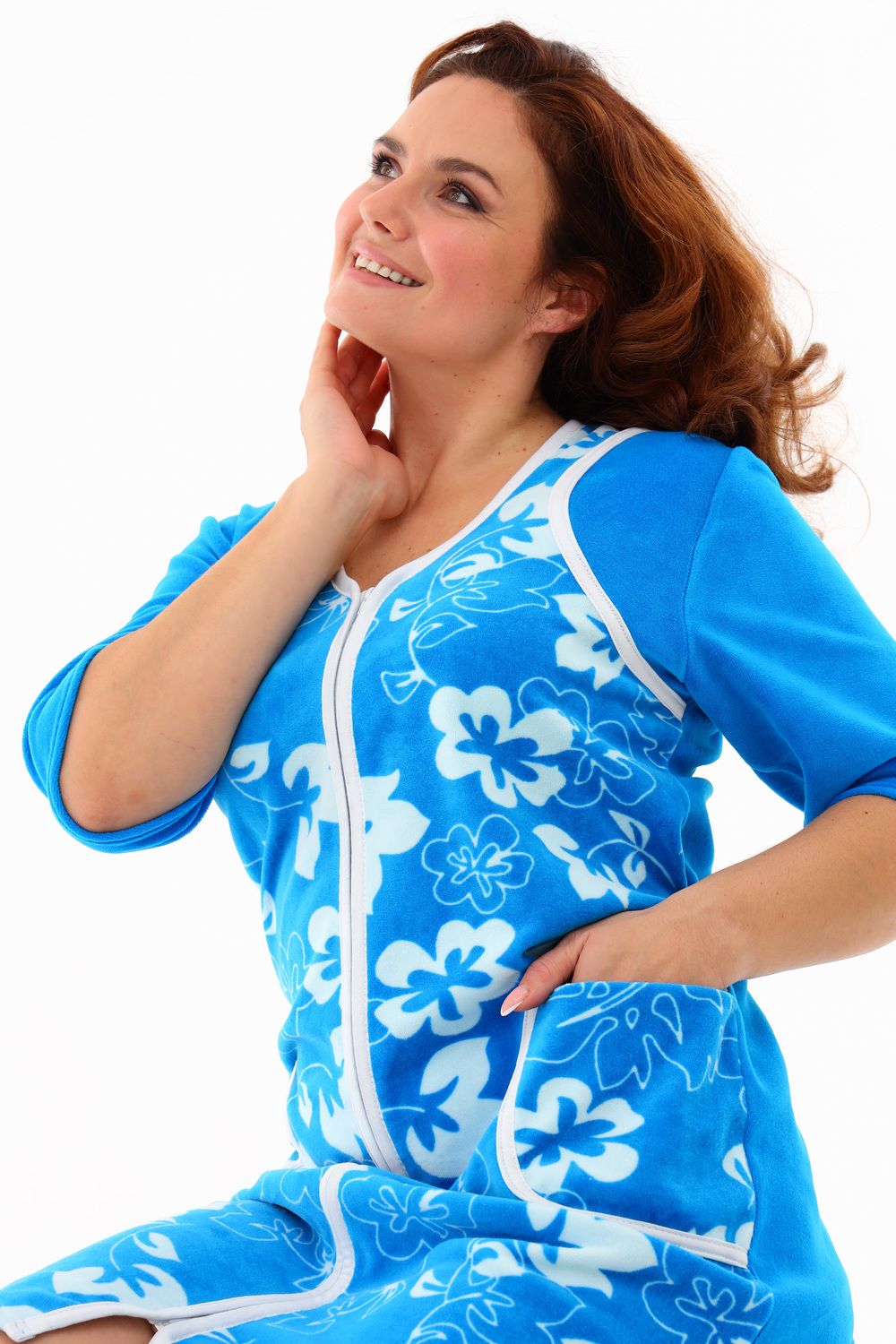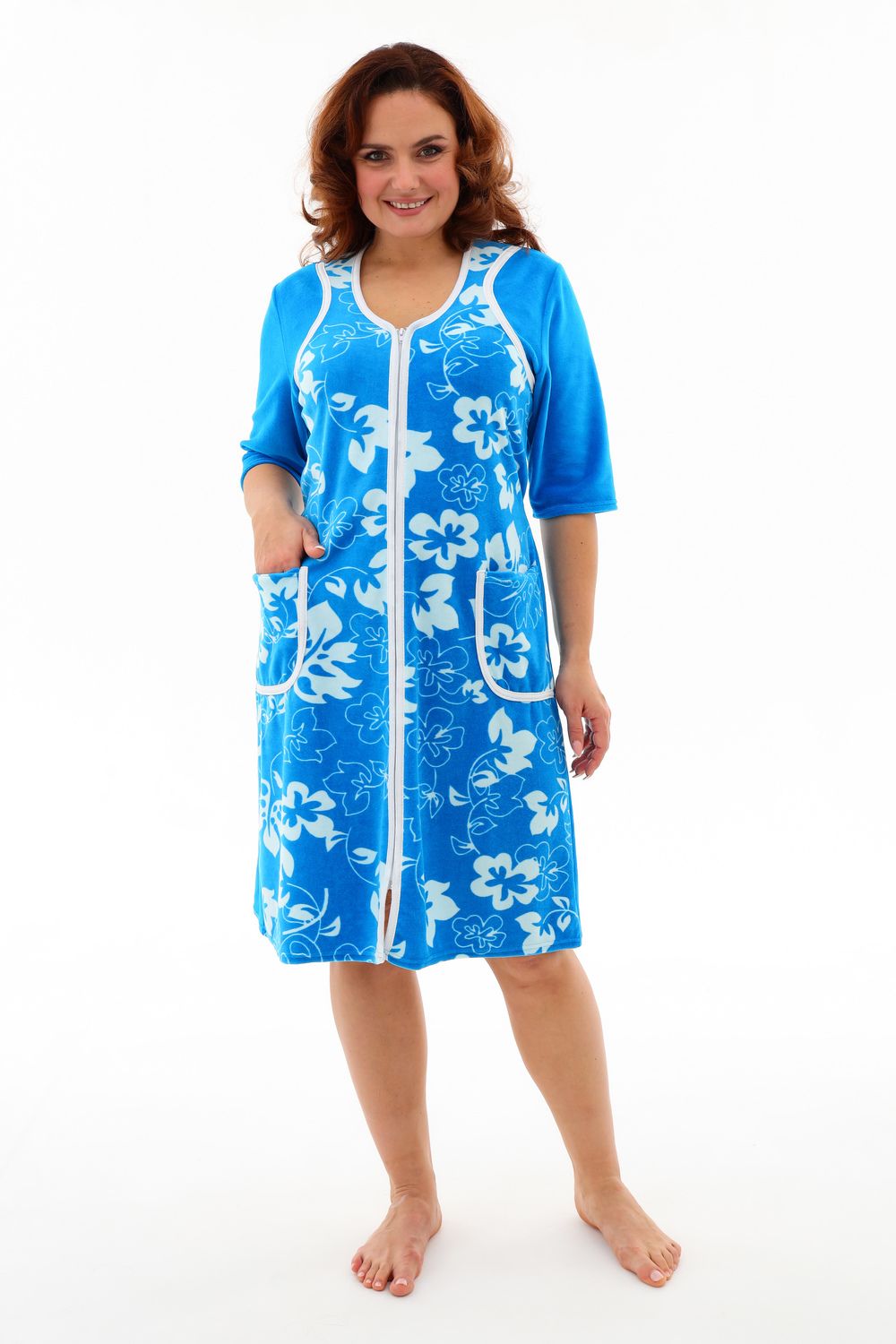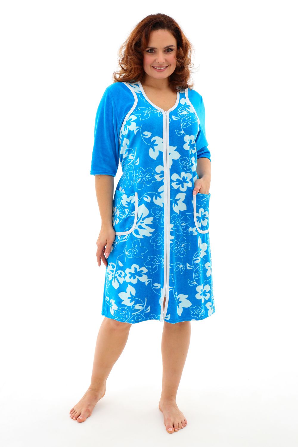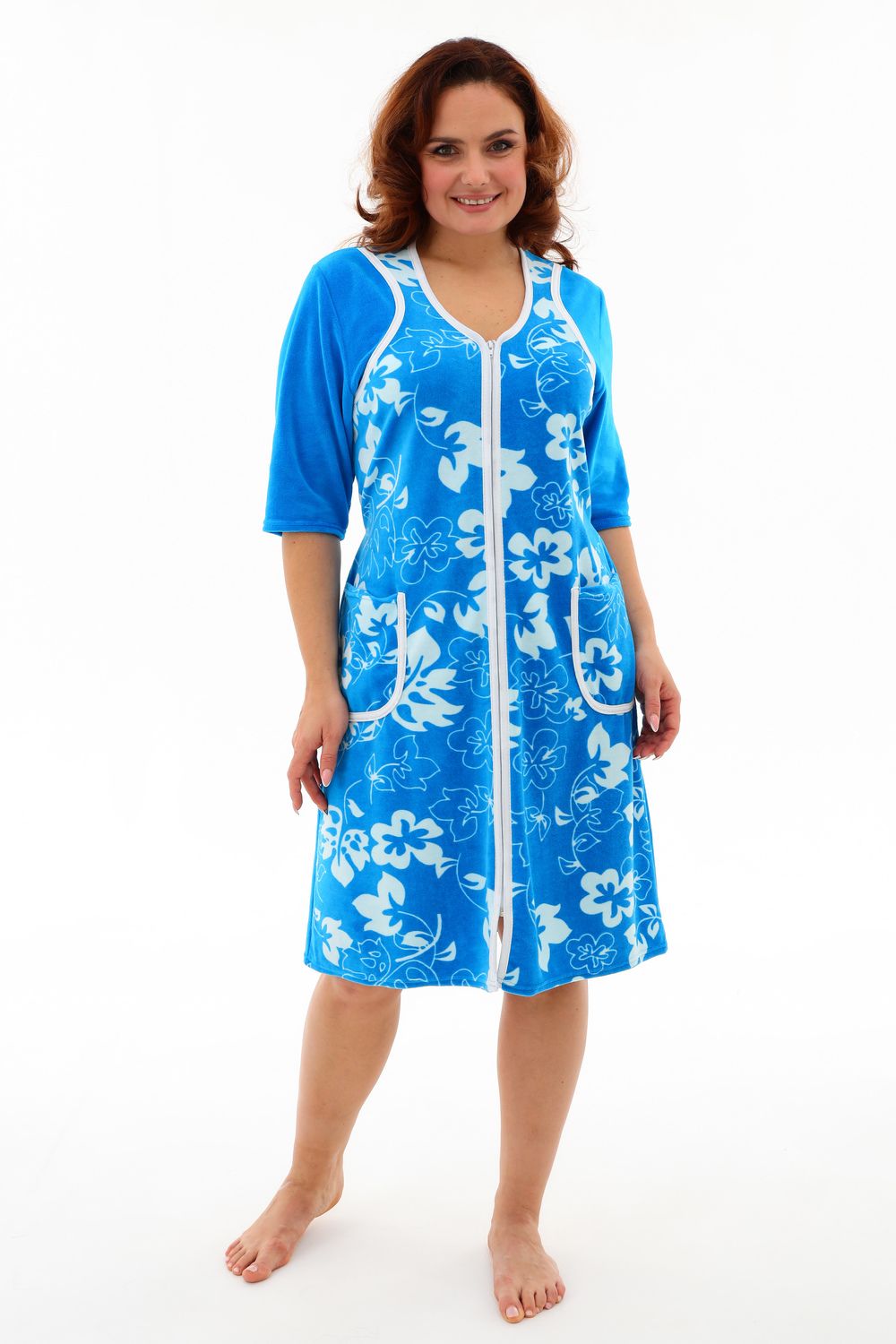 Мягкий женский халат из велюра. Пятнистый дизайн, однотонные рукава и вставки, застегивается на молнию, рукава ниже локтей, по бокам карманы, длина приблизительно до коленей. Размеры от 46 до 62. Имеется возможность приобрести данный товар по розничной цене.