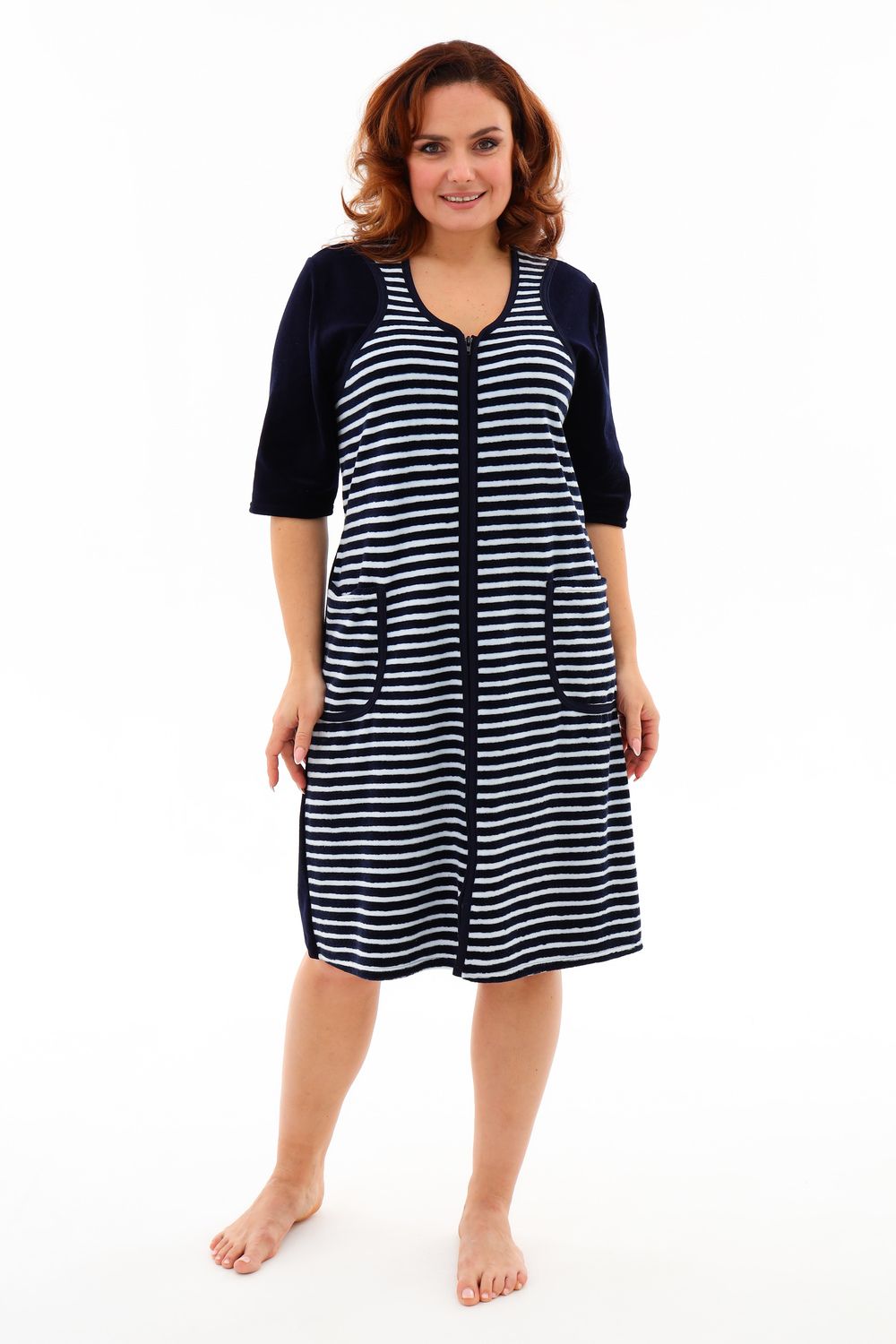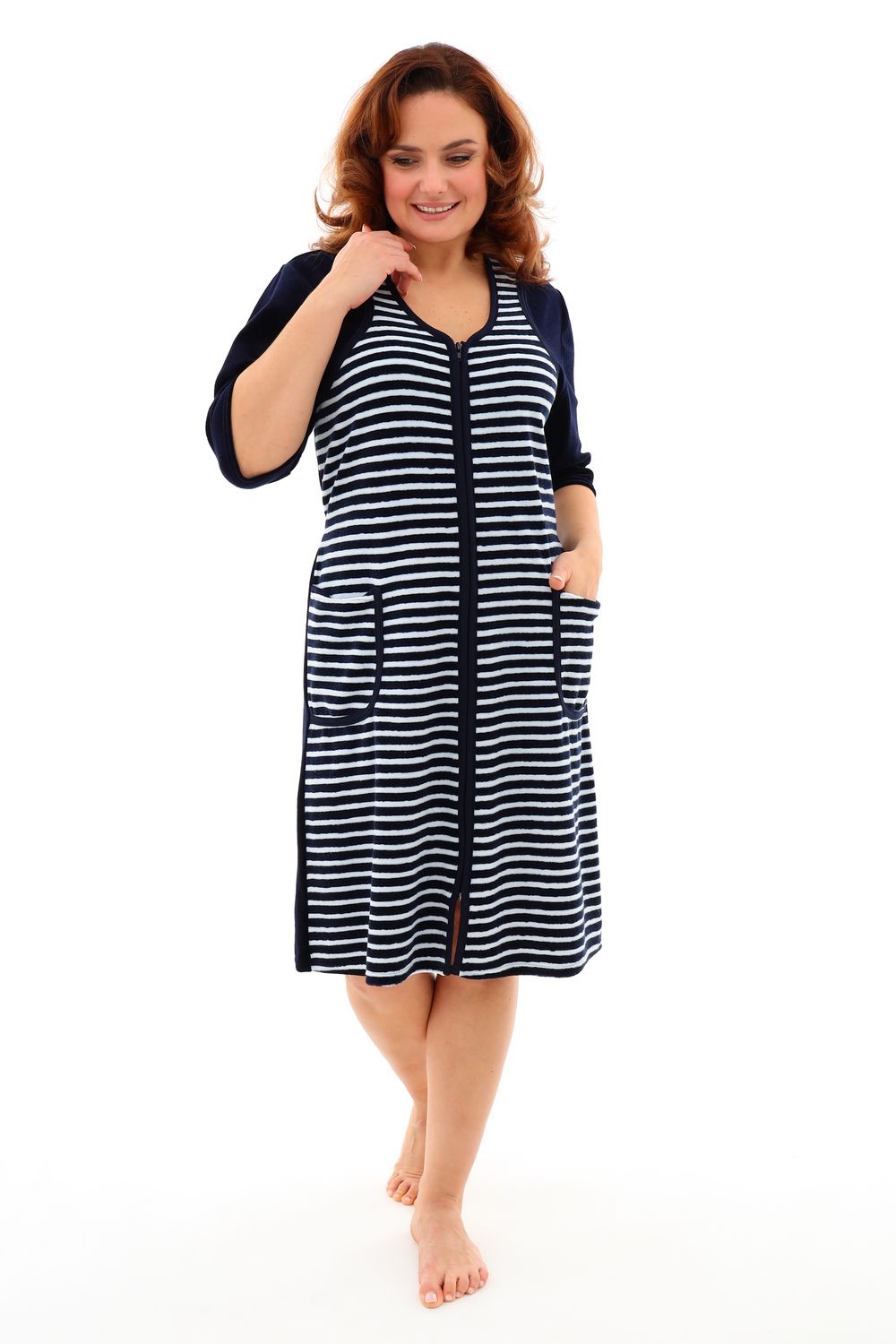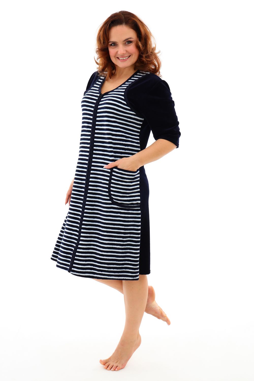 Мягкий женский халат из велюра. Пятнистый дизайн, однотонные рукава и вставки, застегивается на молнию, рукава ниже локтей, по бокам карманы, длина приблизительно до коленей. Размеры от 46 до 62. Имеется возможность приобрести данный товар по розничной цене.