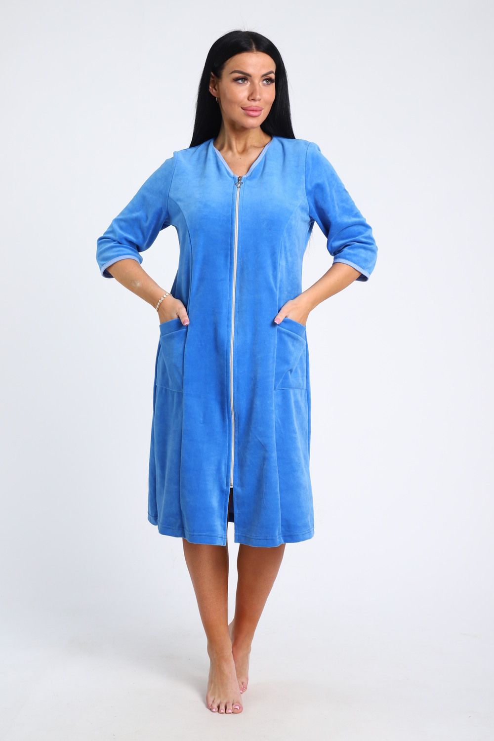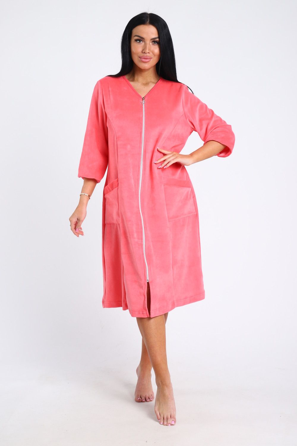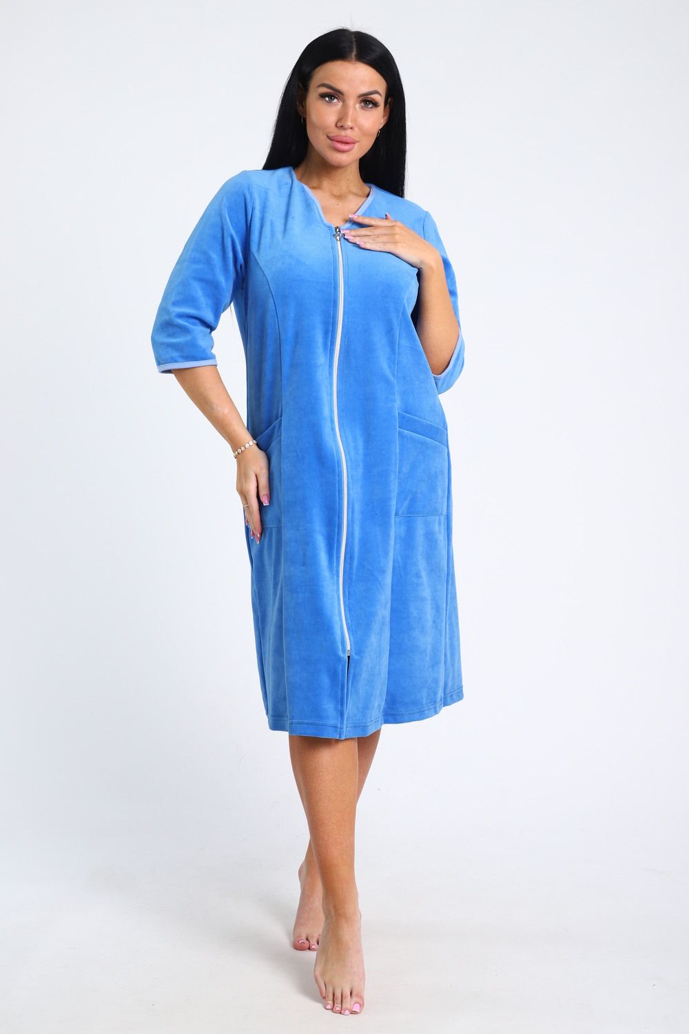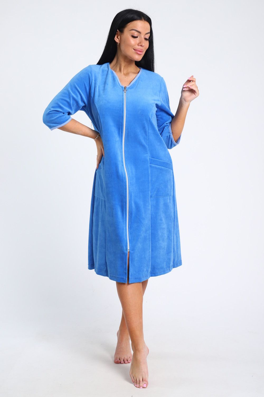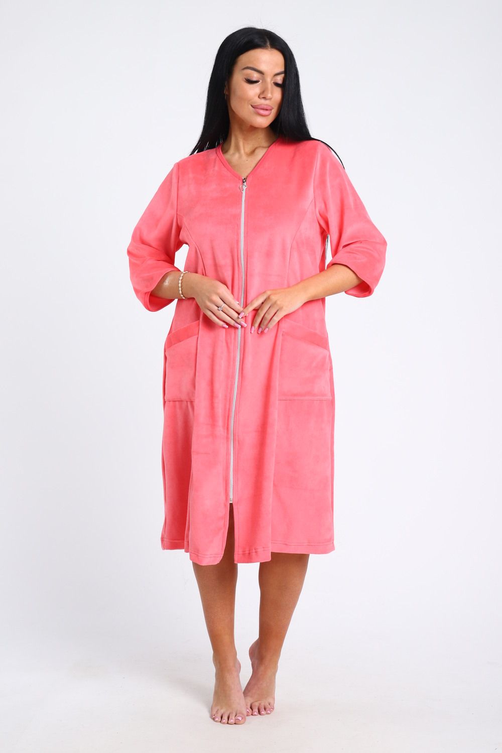 Халат женский велюровый, однотонный. По переду рельефы в рельефах карманы. Халат на молнии горловина уголком. Обработан халат под окантовку, длина ниже колена.