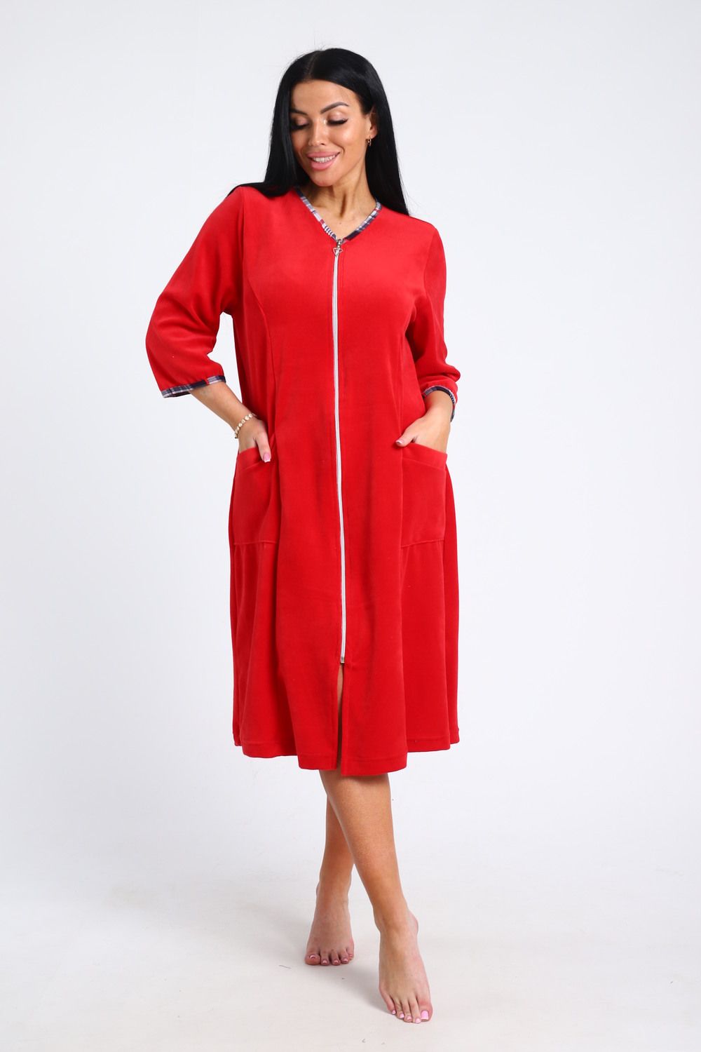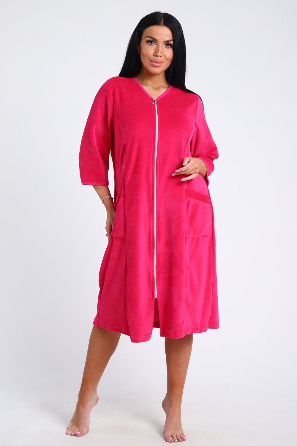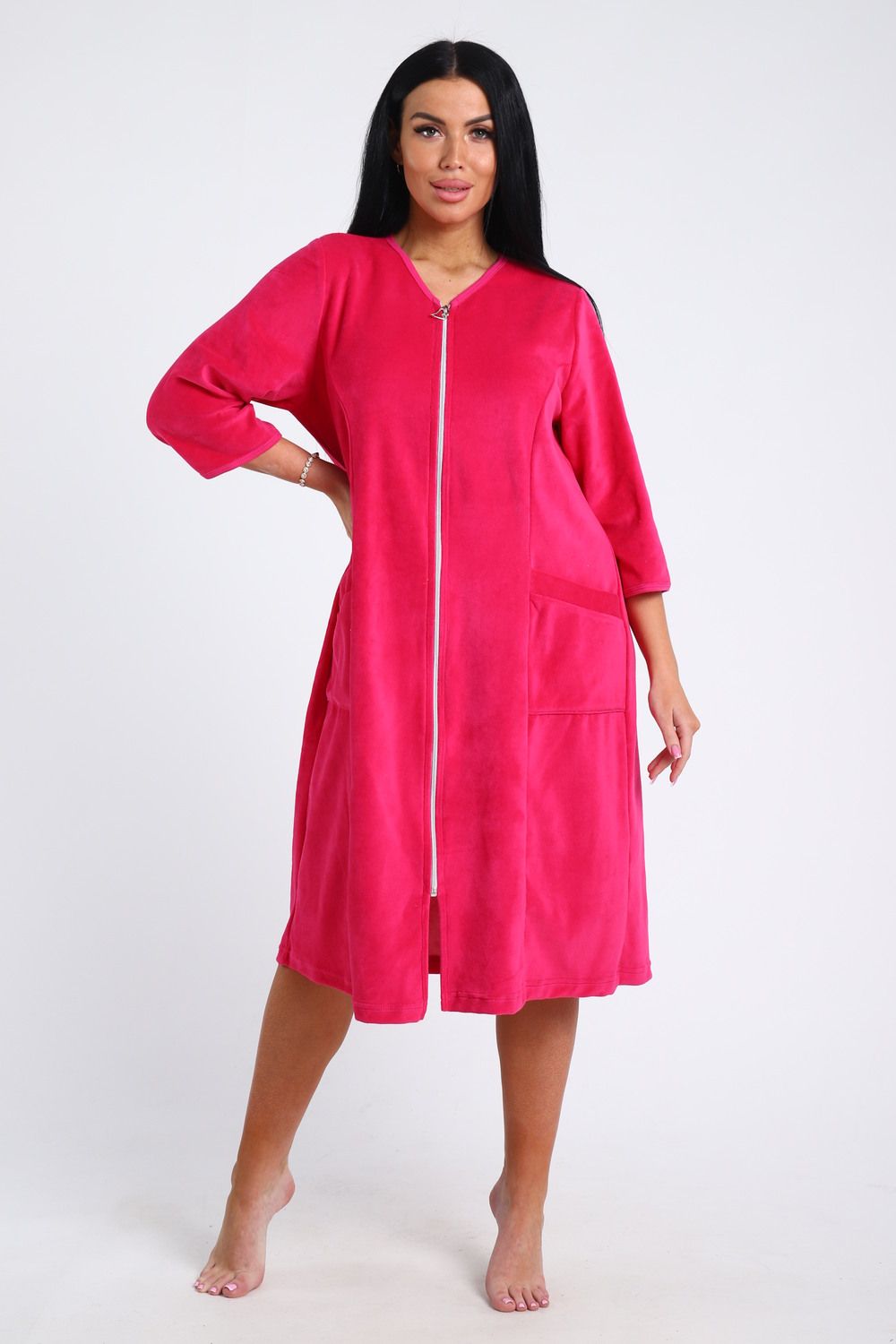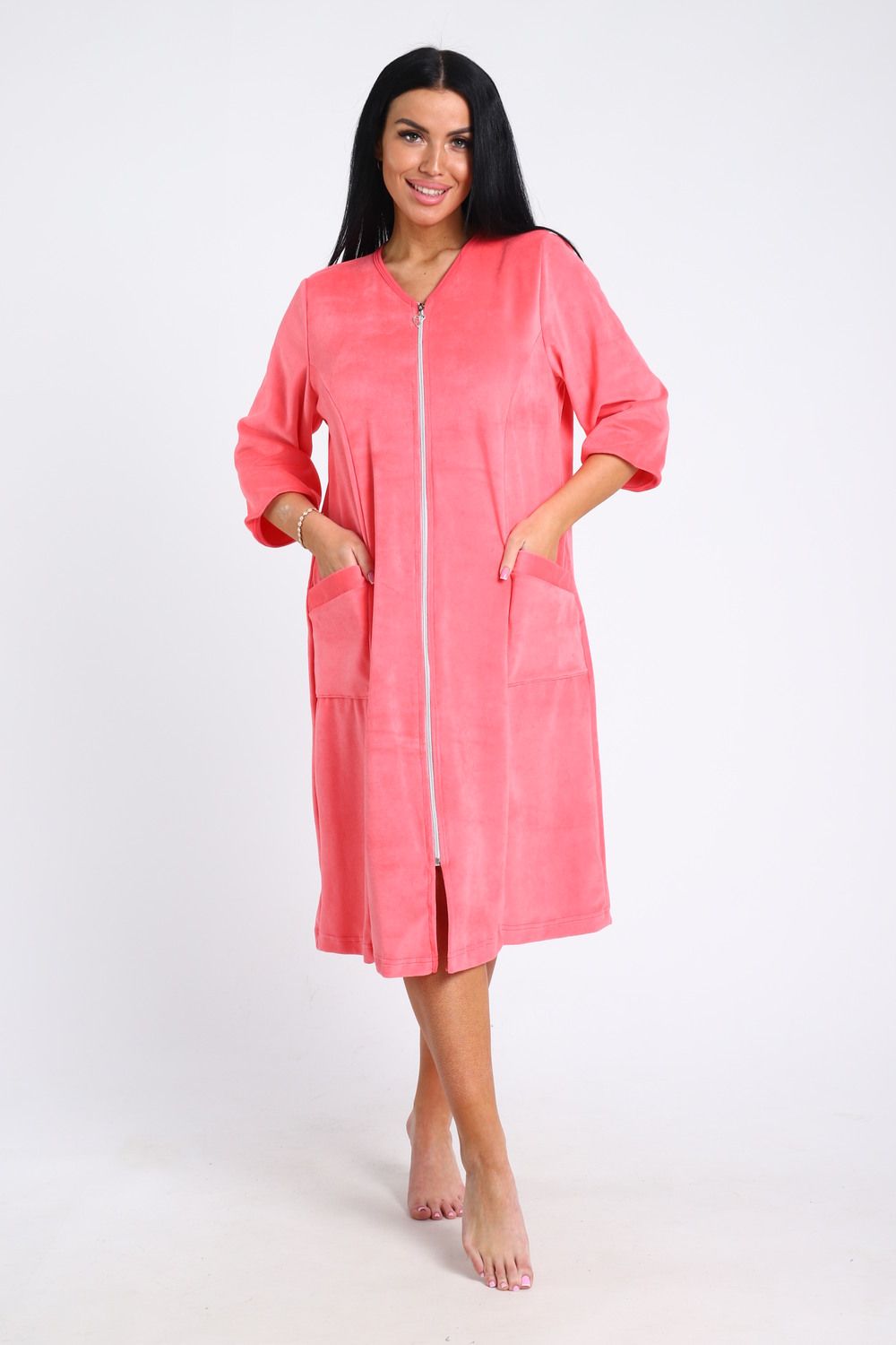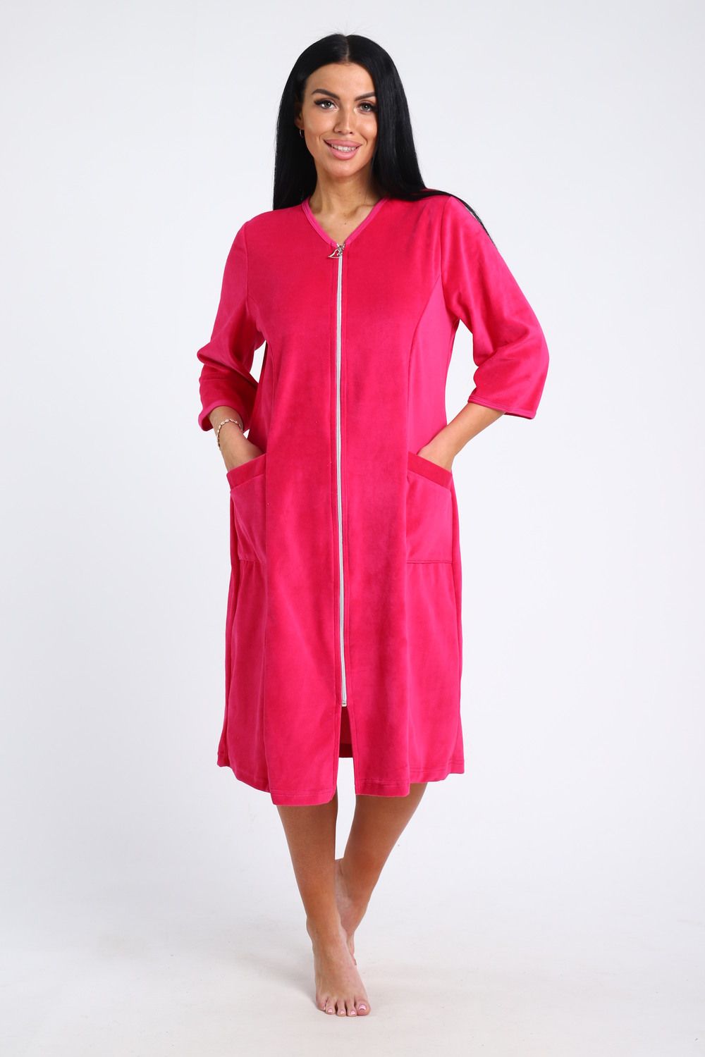 Халат женский велюровый, однотонный. По переду рельефы в рельефах карманы. Халат на молнии горловина уголком. Обработан халат под окантовку, длина ниже колена.