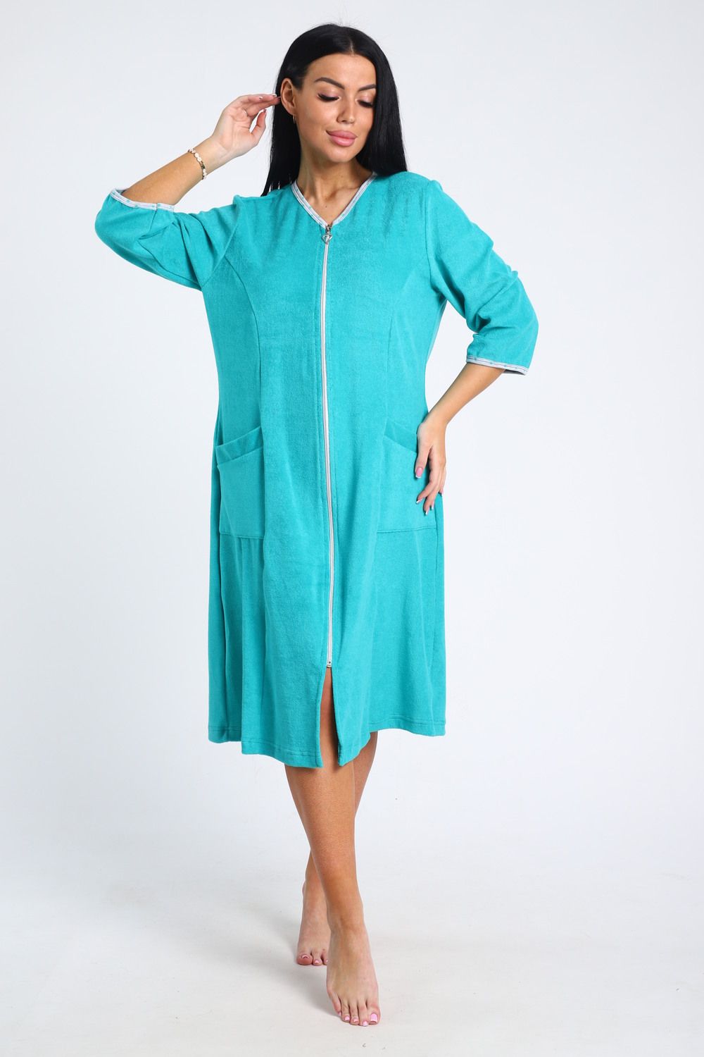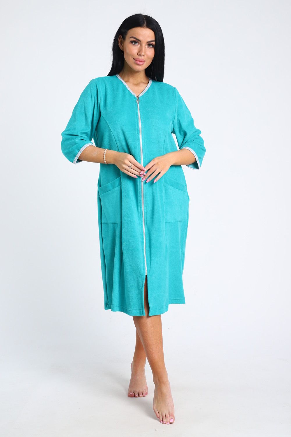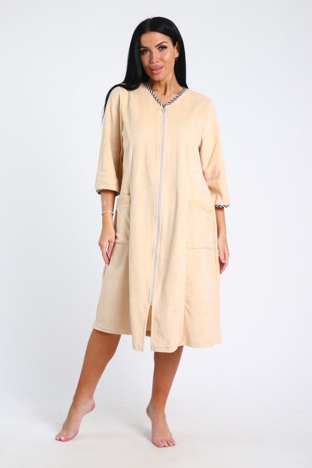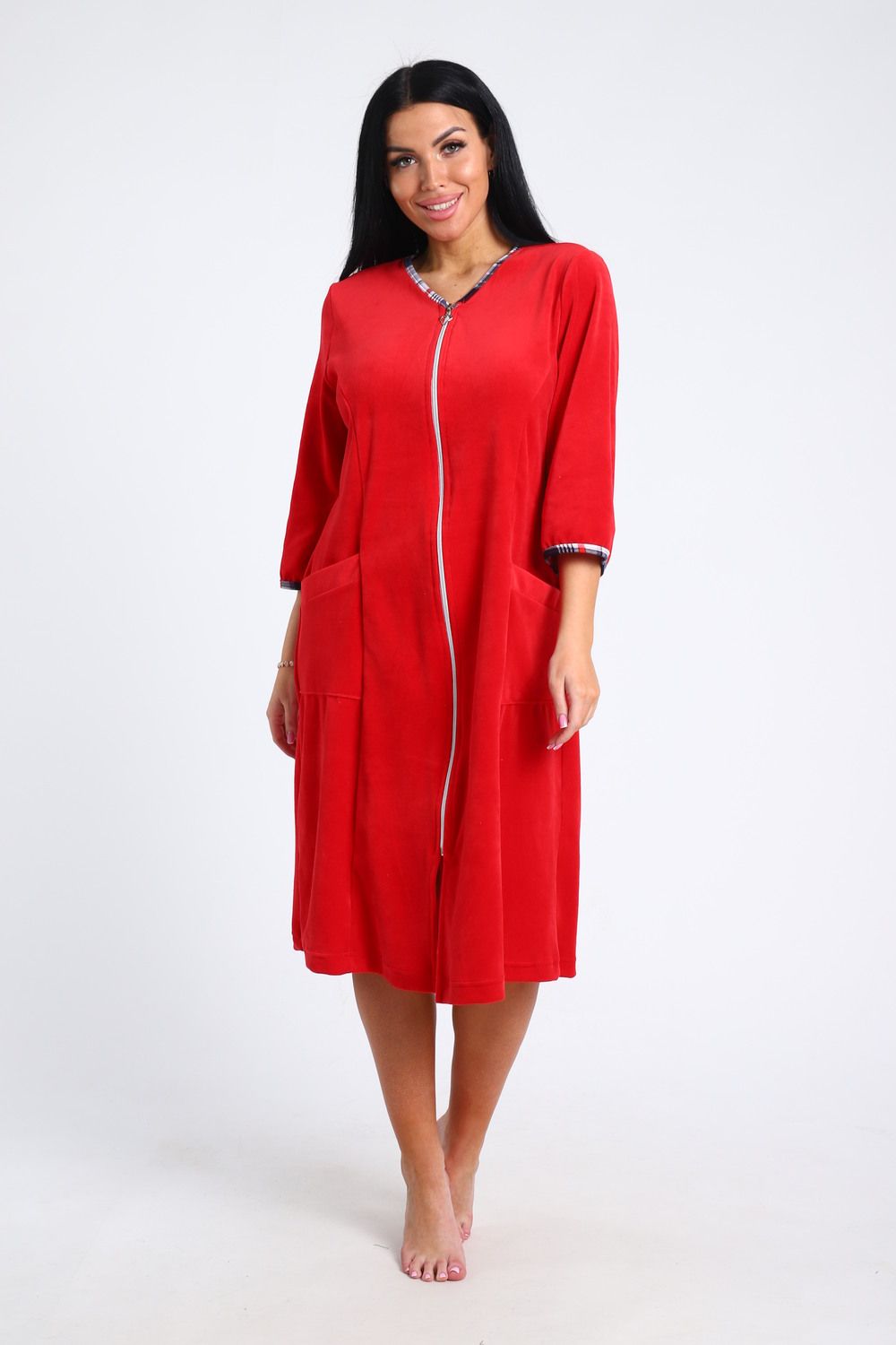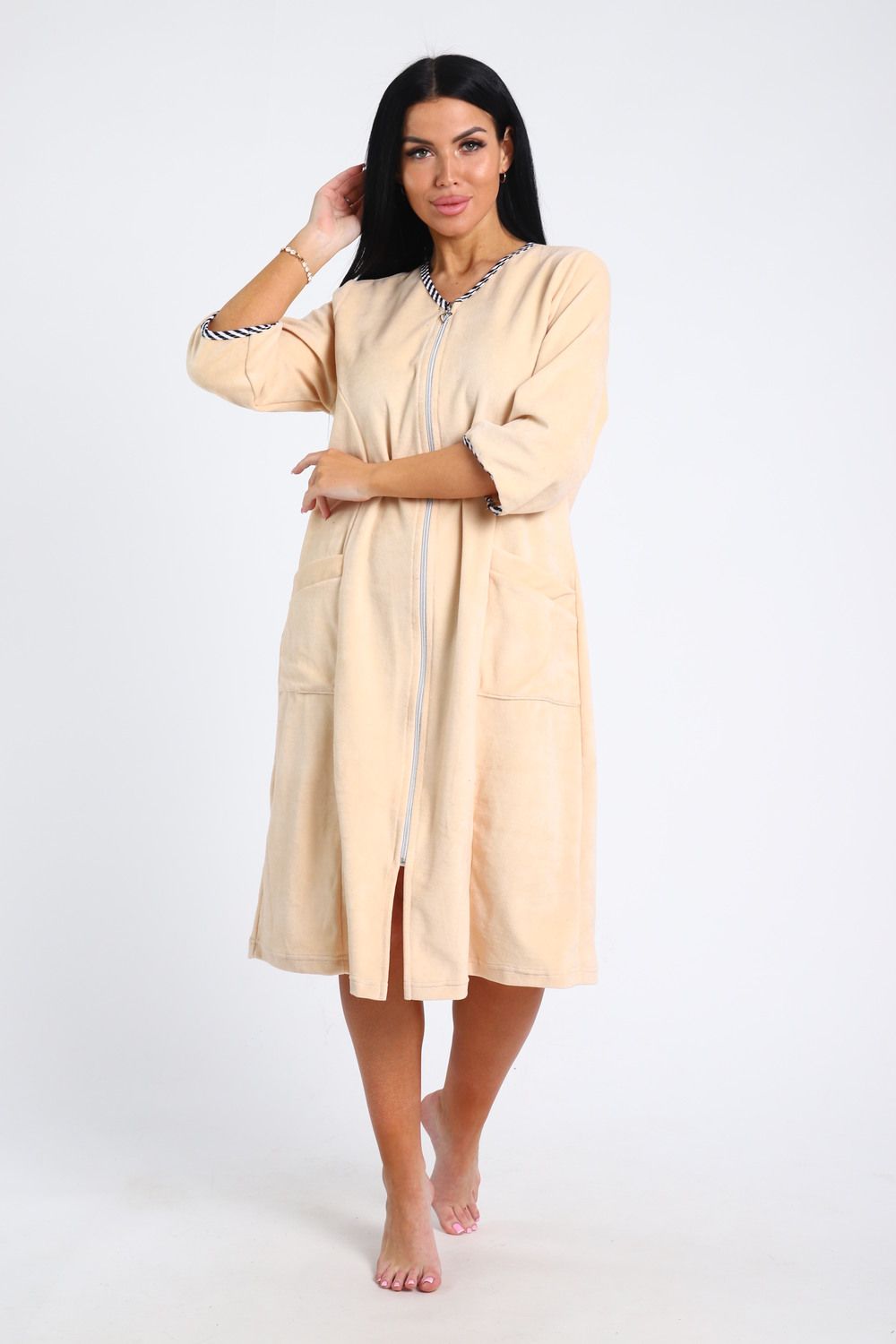 Халат женский велюровый, однотонный. По переду рельефы в рельефах карманы. Халат на молнии горловина уголком. Обработан халат под окантовку, длина ниже колена.