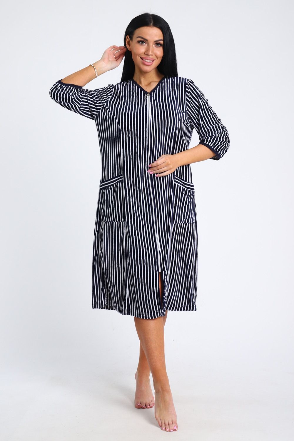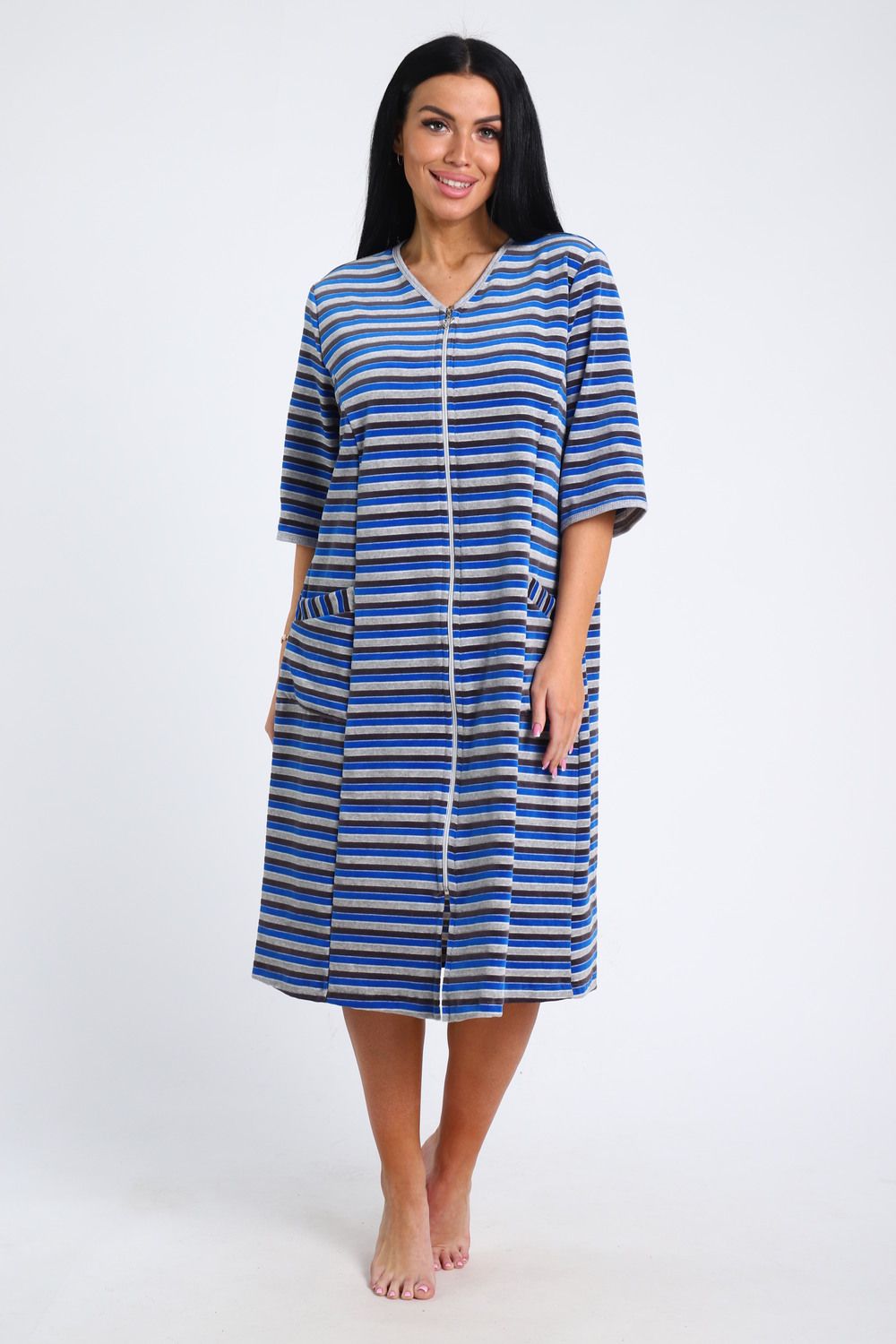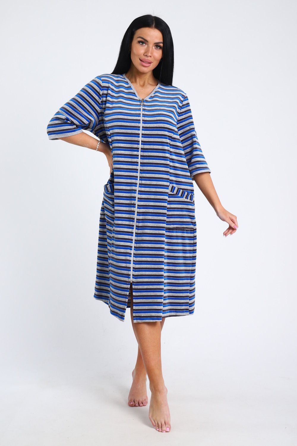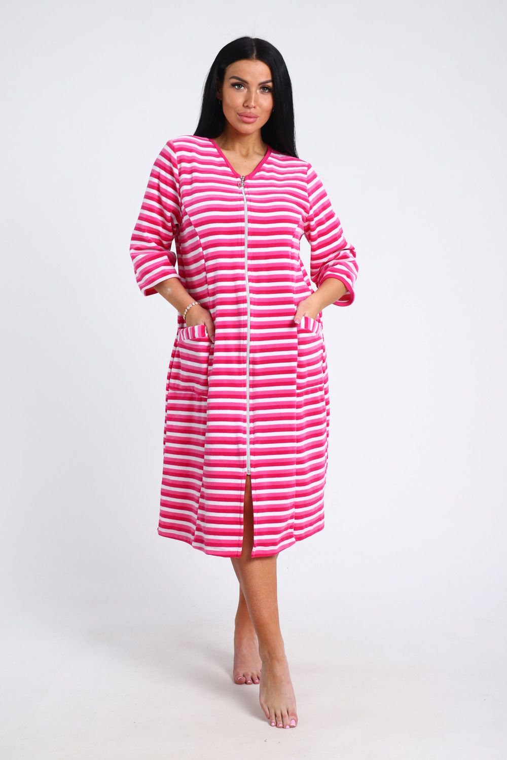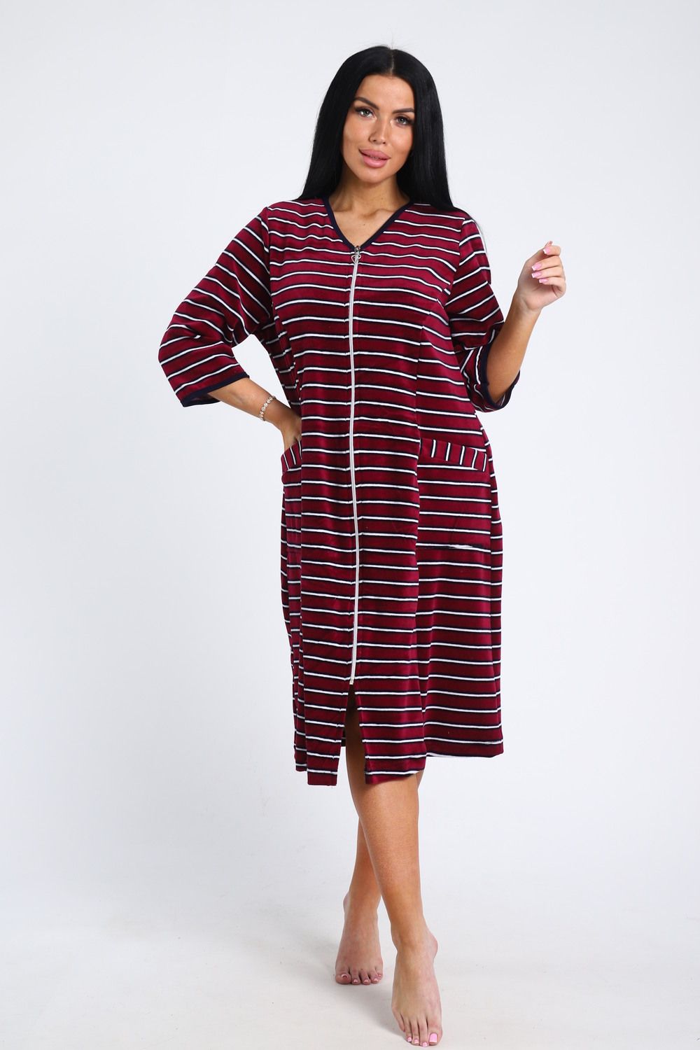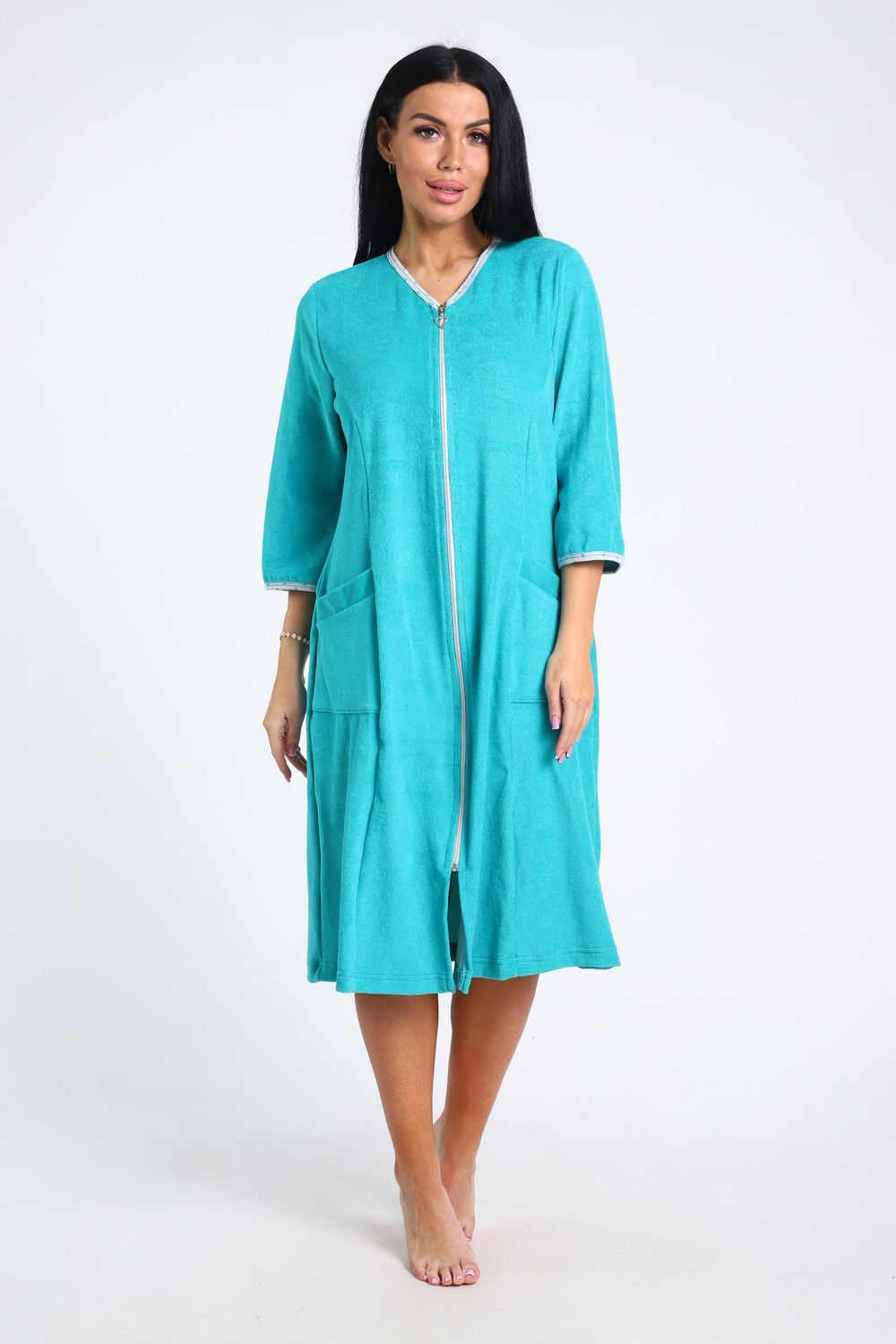 Халат женский велюровый, однотонный. По переду рельефы в рельефах карманы. Халат на молнии горловина уголком. Обработан халат под окантовку, длина ниже колена.