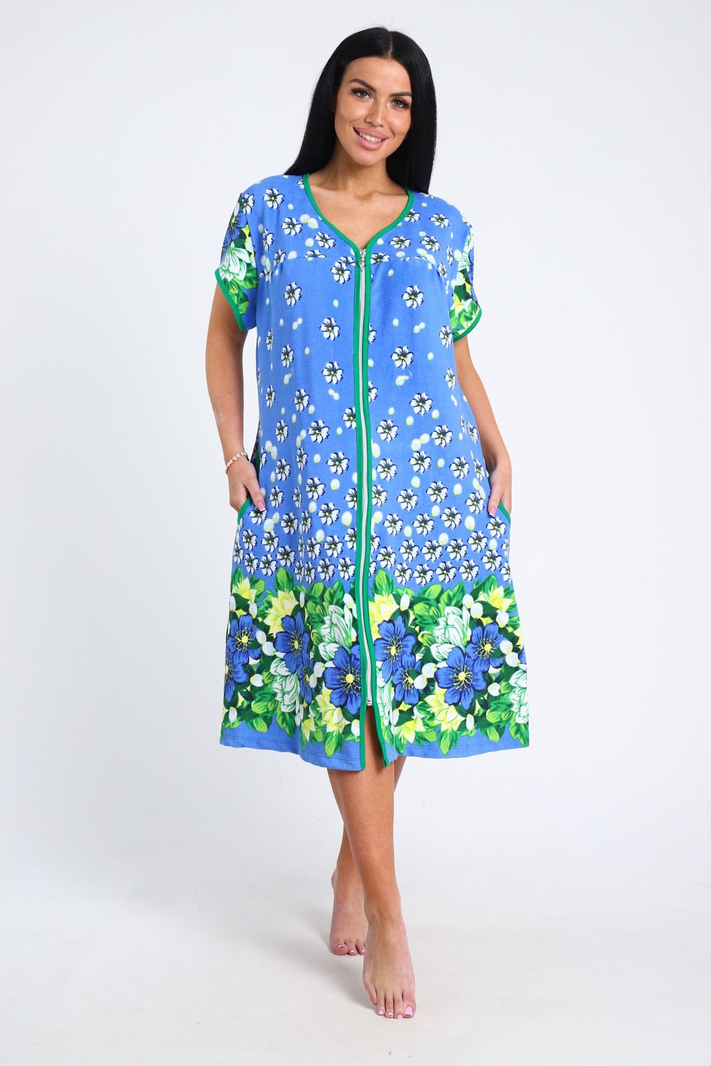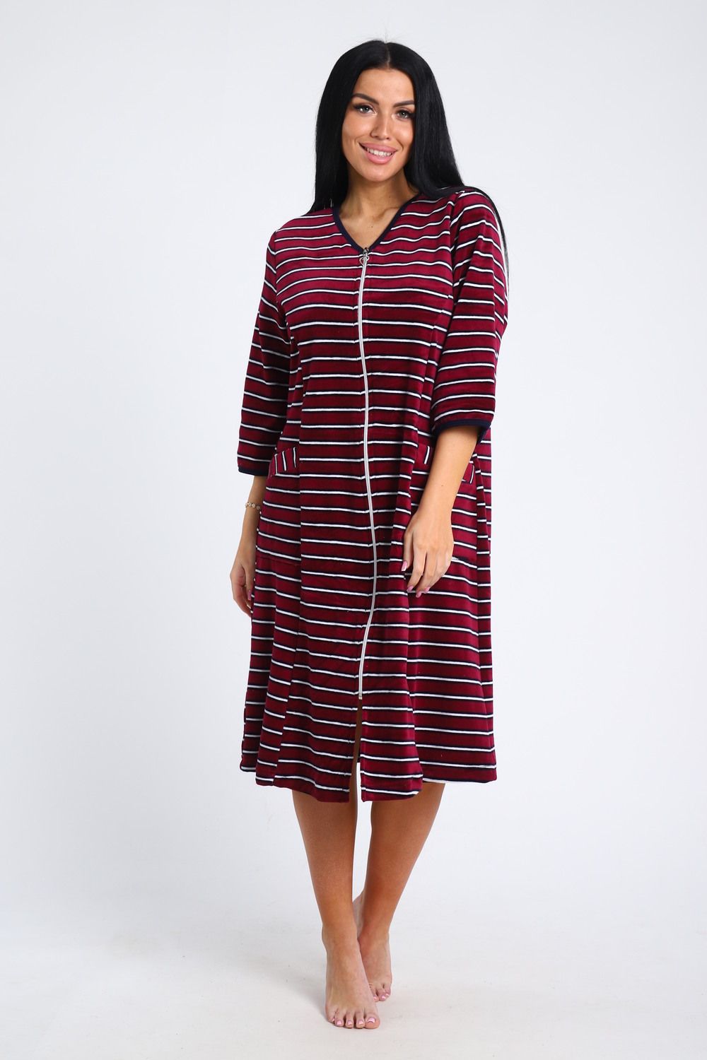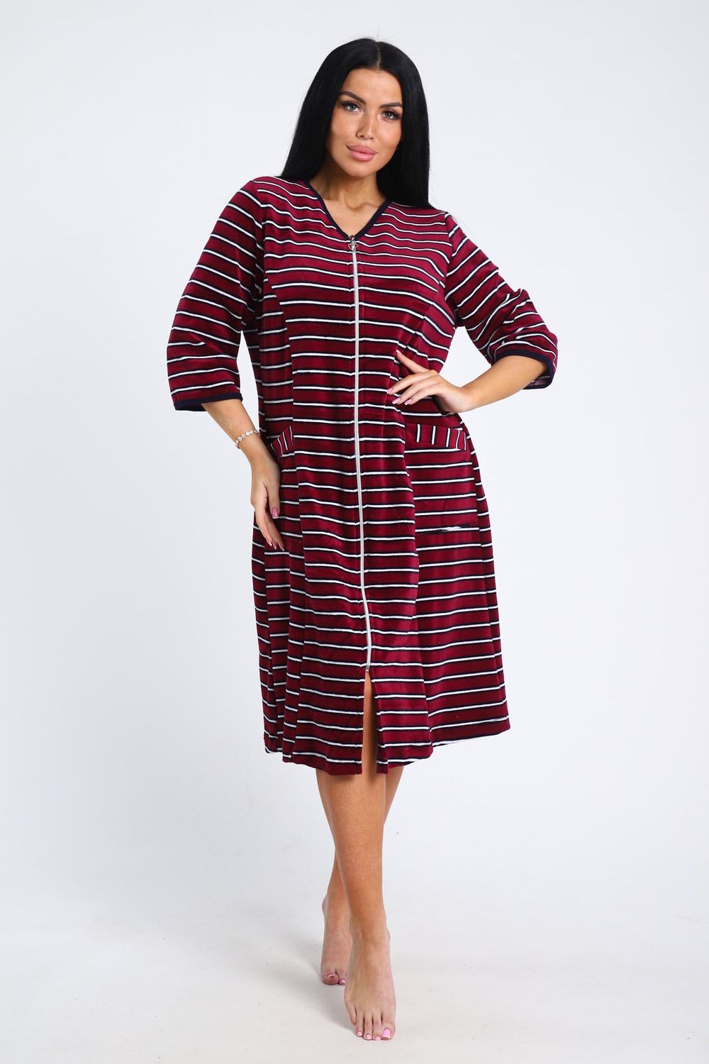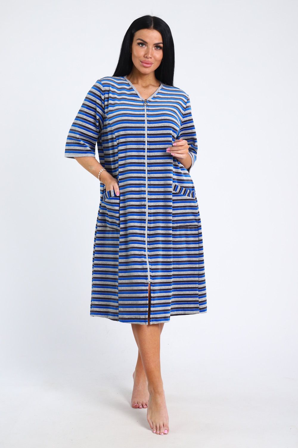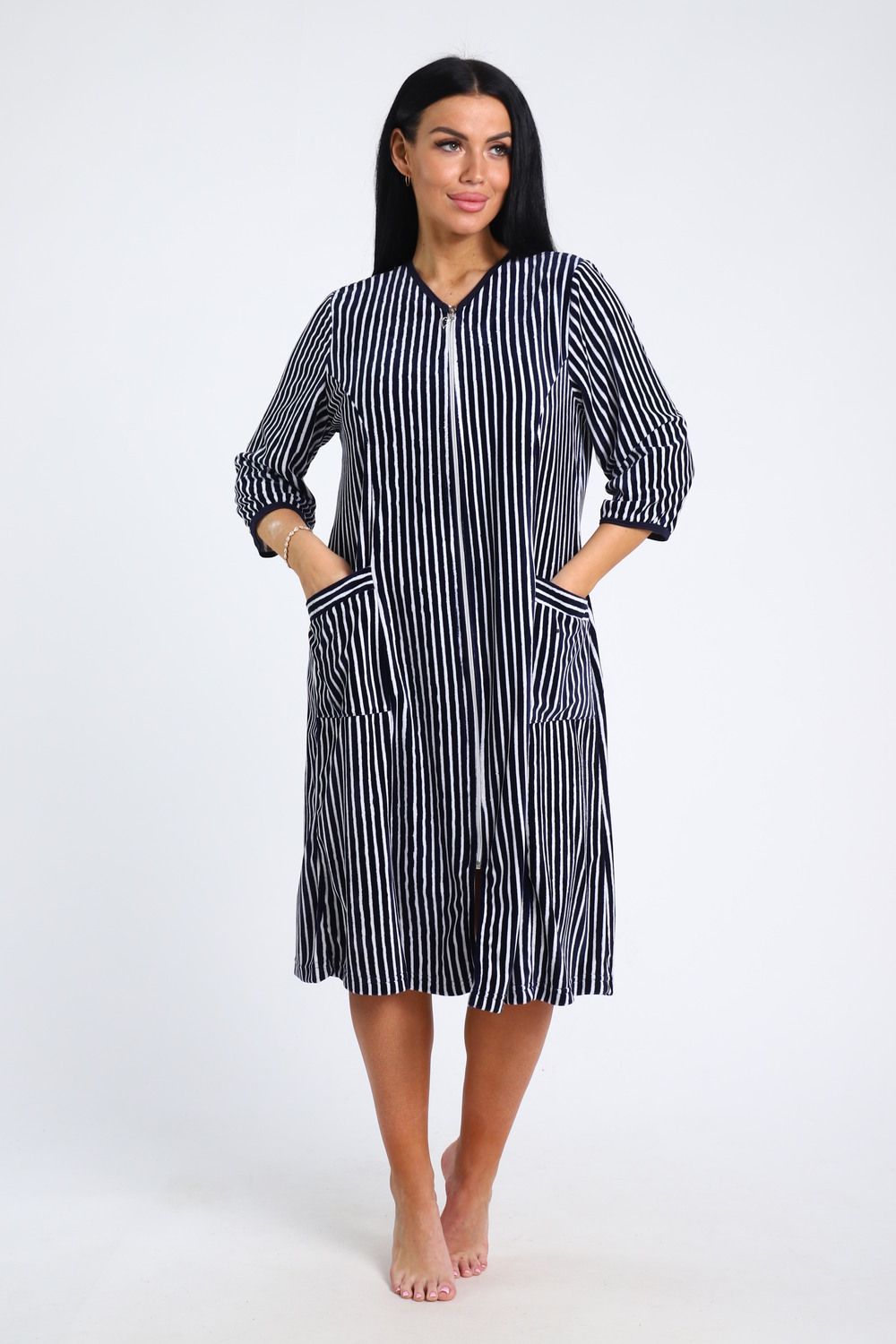 Халат женский велюровый, однотонный. По переду рельефы в рельефах карманы. Халат на молнии горловина уголком. Обработан халат под окантовку, длина ниже колена.