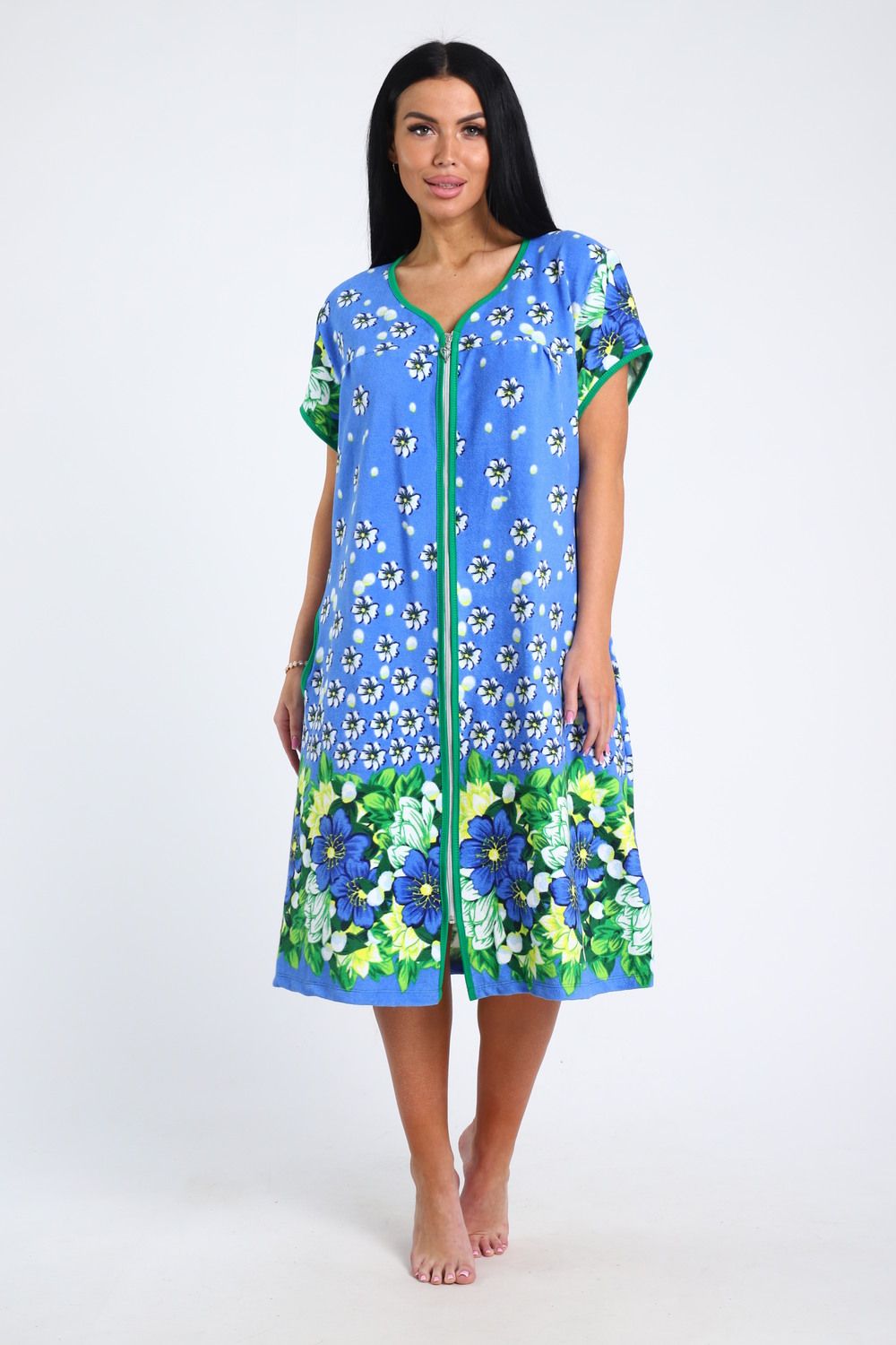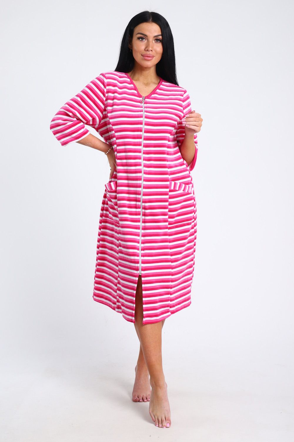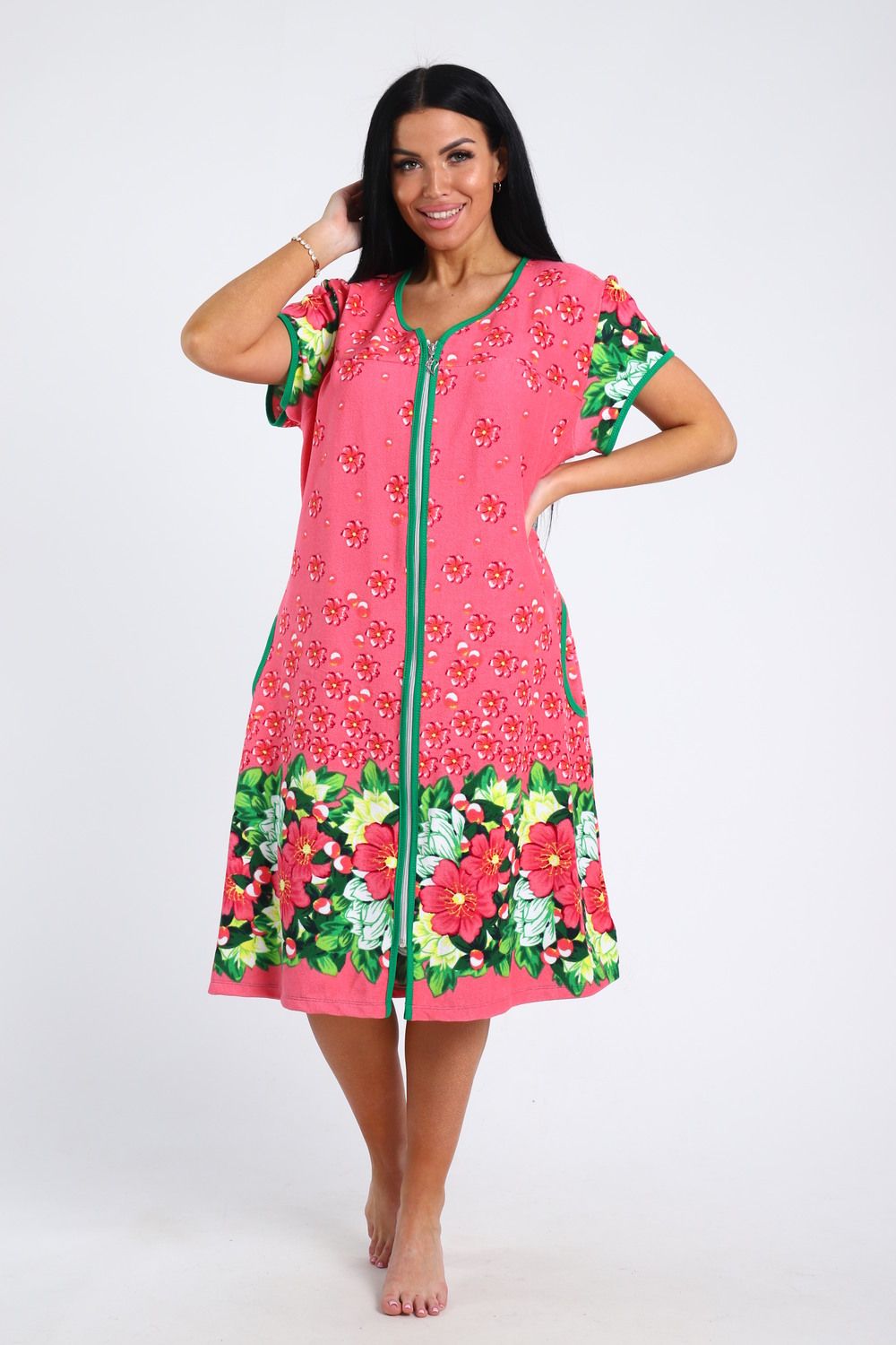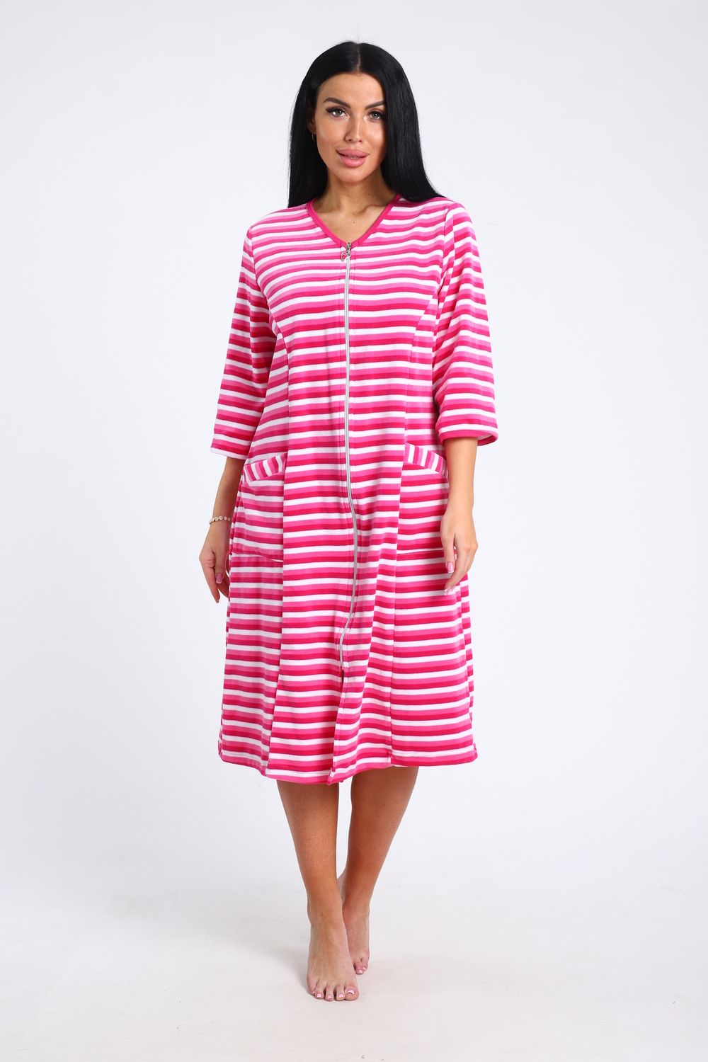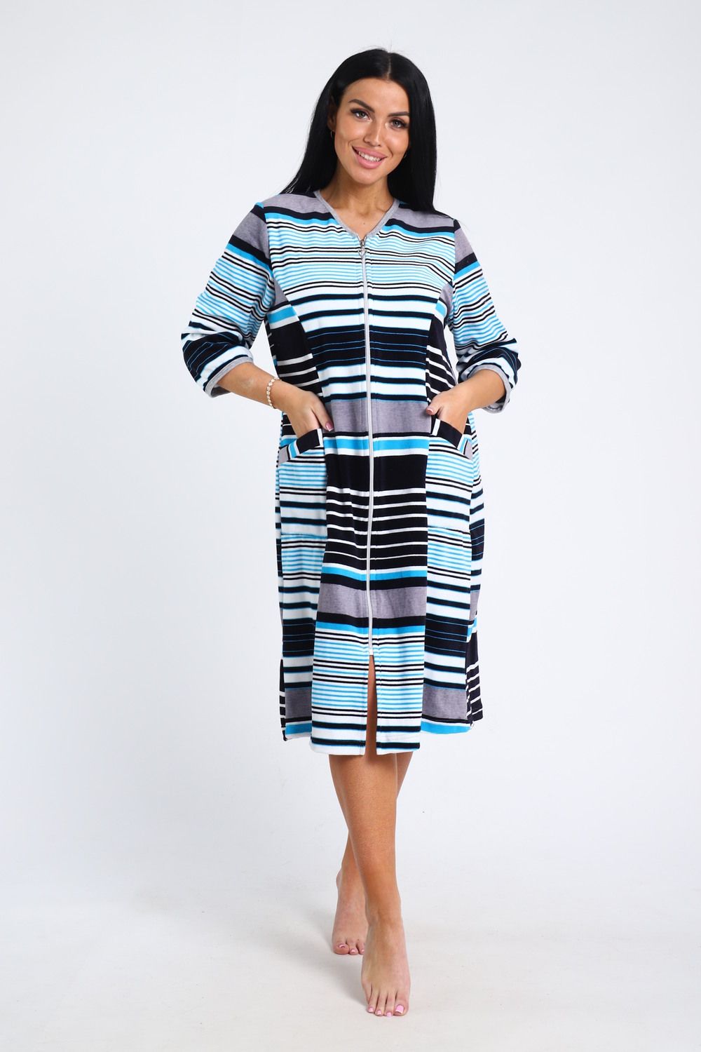 Халат женский велюровый, однотонный. По переду рельефы в рельефах карманы. Халат на молнии горловина уголком. Обработан халат под окантовку, длина ниже колена.