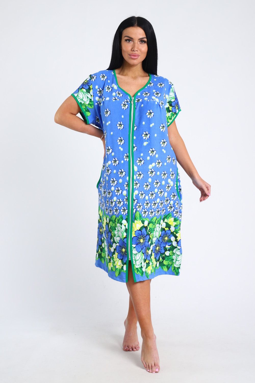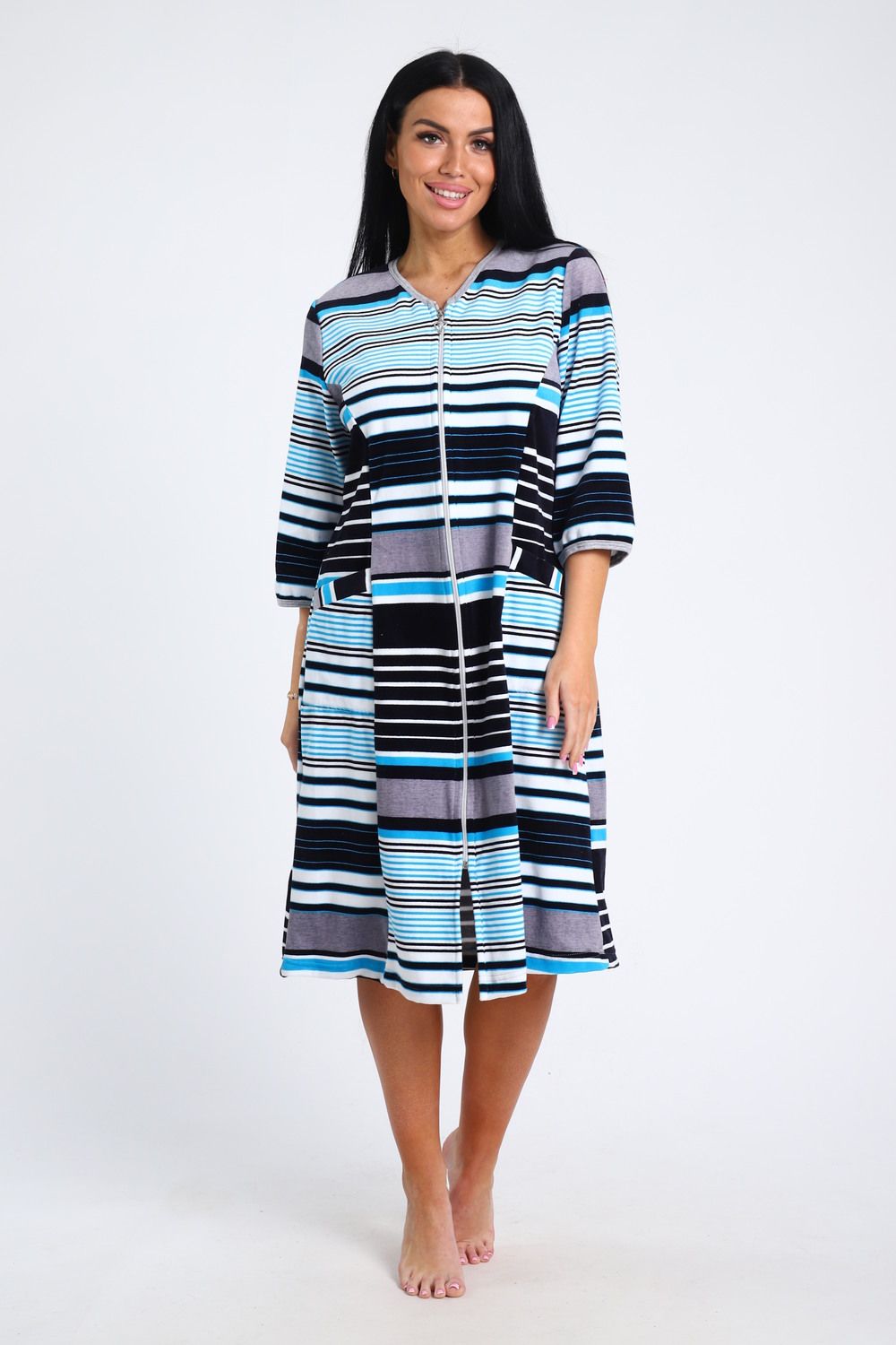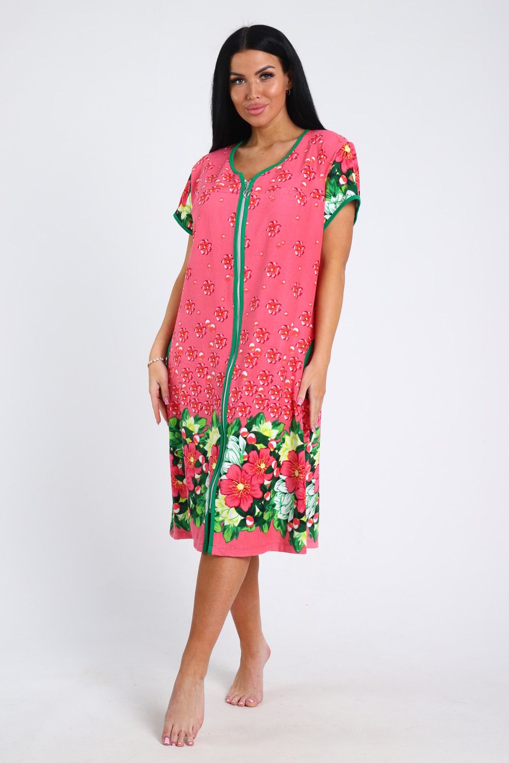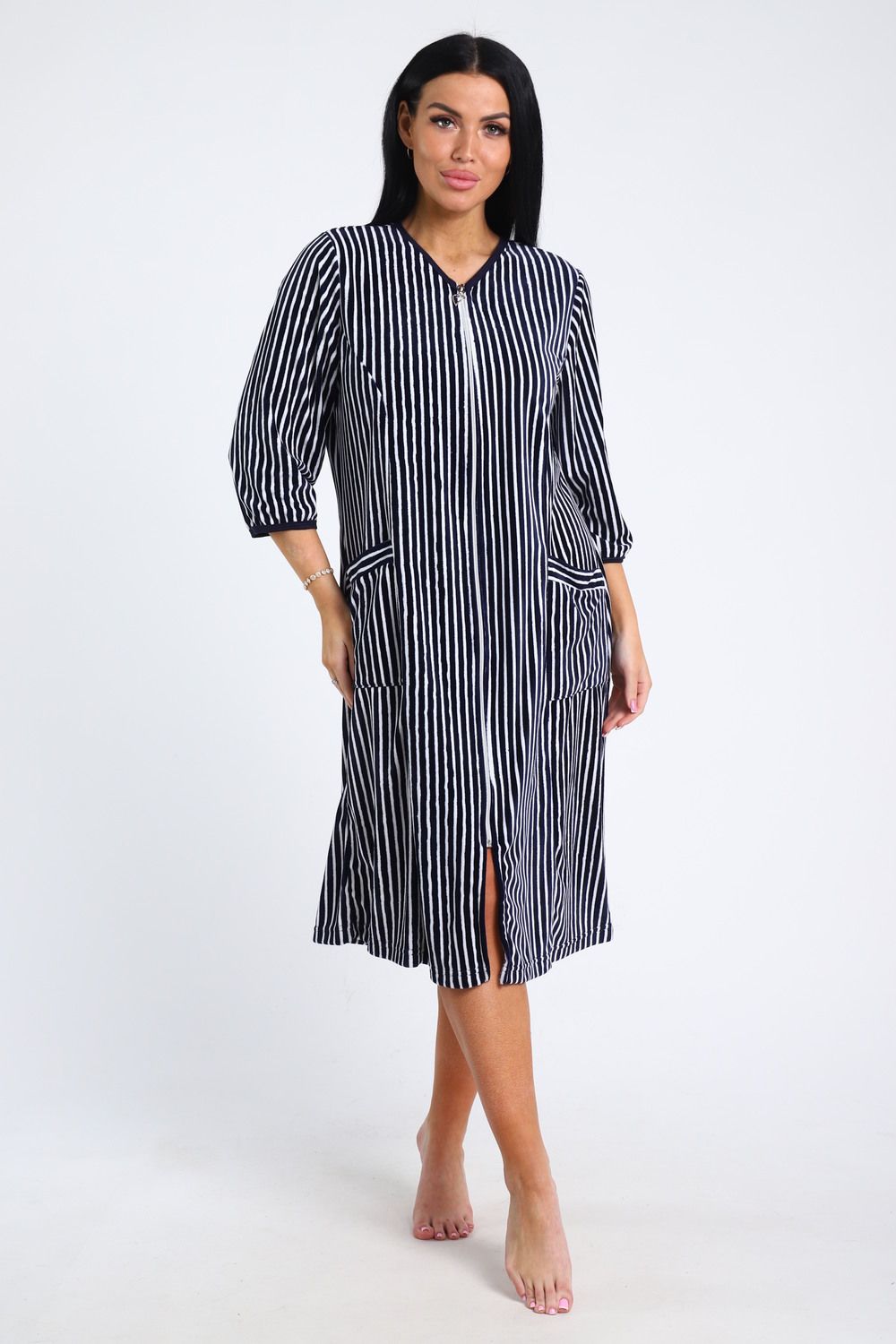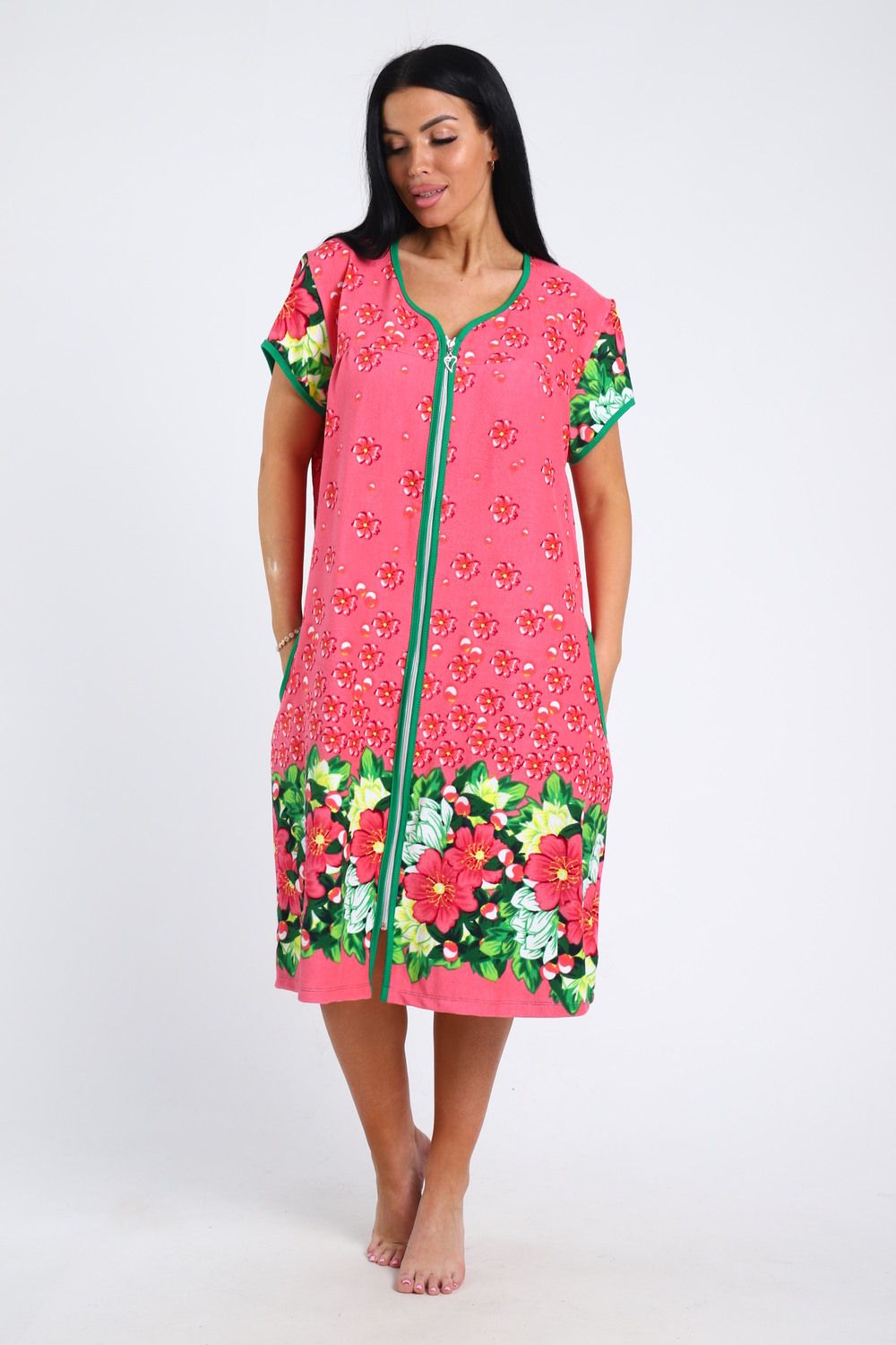 Халат женский велюровый, однотонный. По переду рельефы в рельефах карманы. Халат на молнии горловина уголком. Обработан халат под окантовку, длина ниже колена.