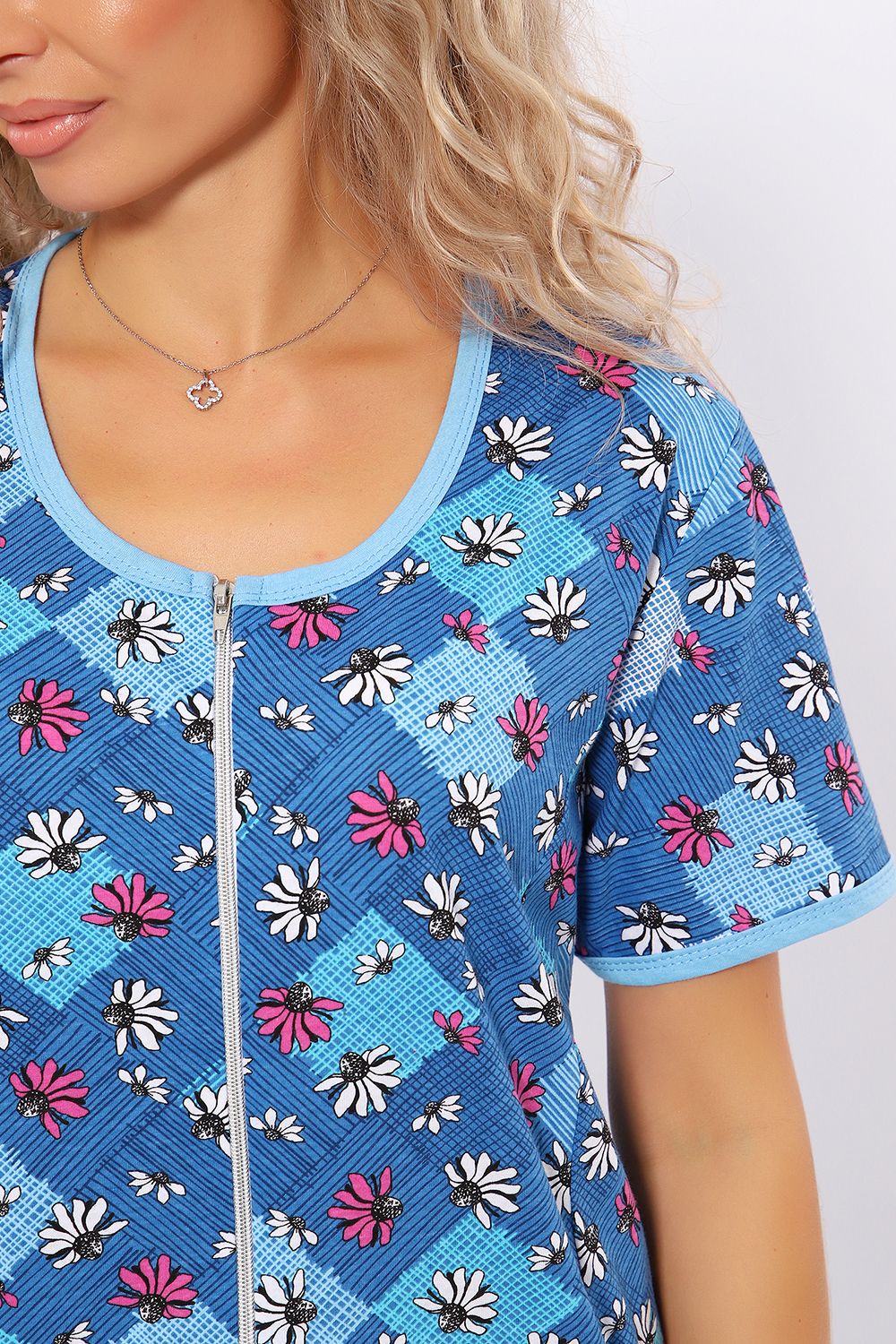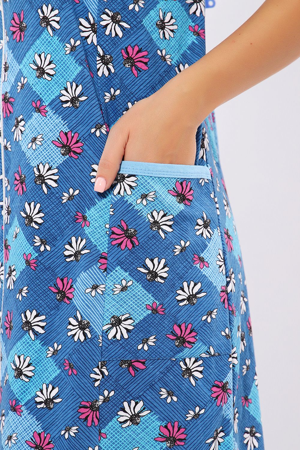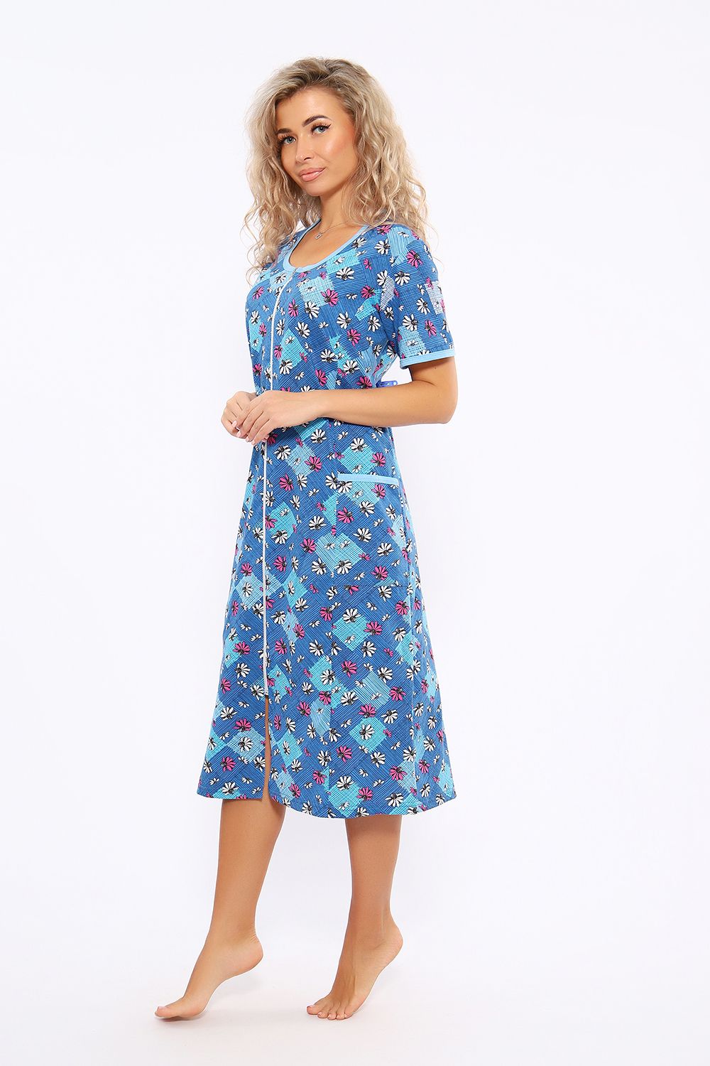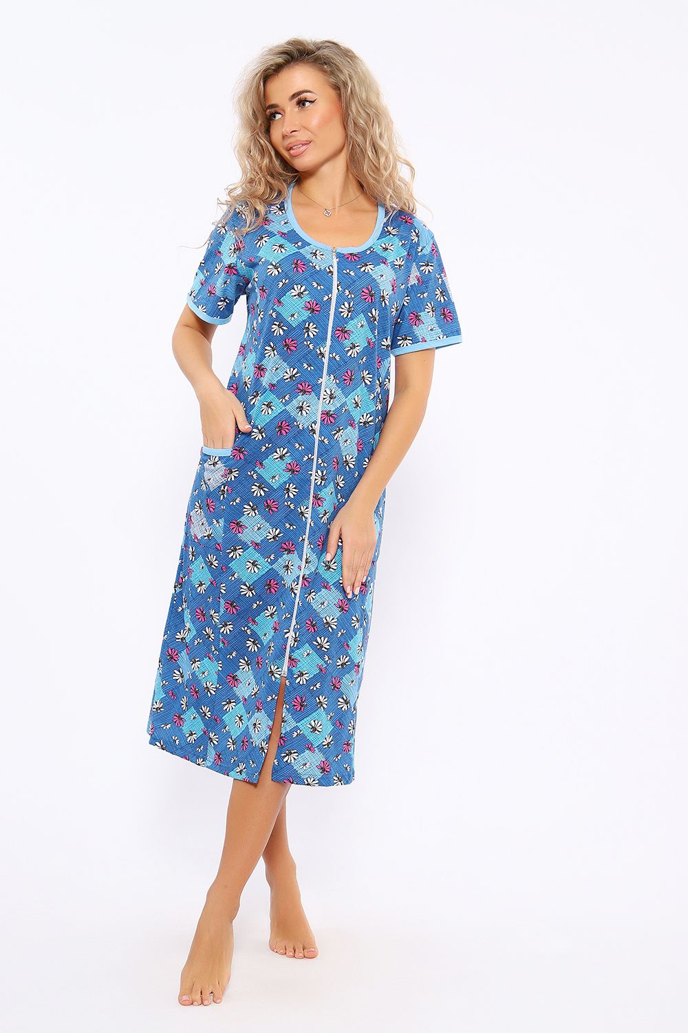 Халат женский на молнии. Изготовлен из натуральной хлопковой кулирки. Удлиненный, с рельефами по полочке, с боковыми карманами, кант по горловине, рукавам и карманам.