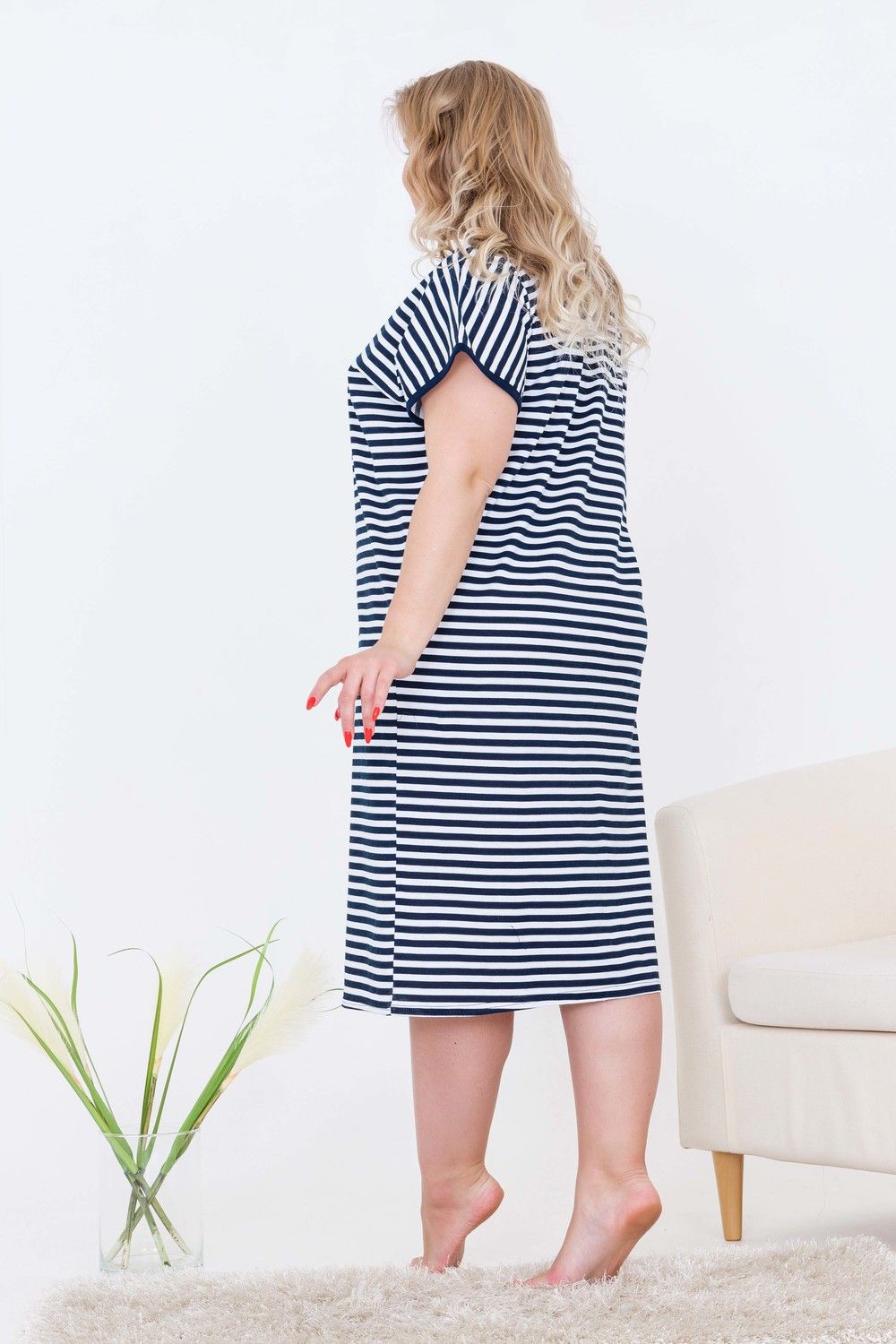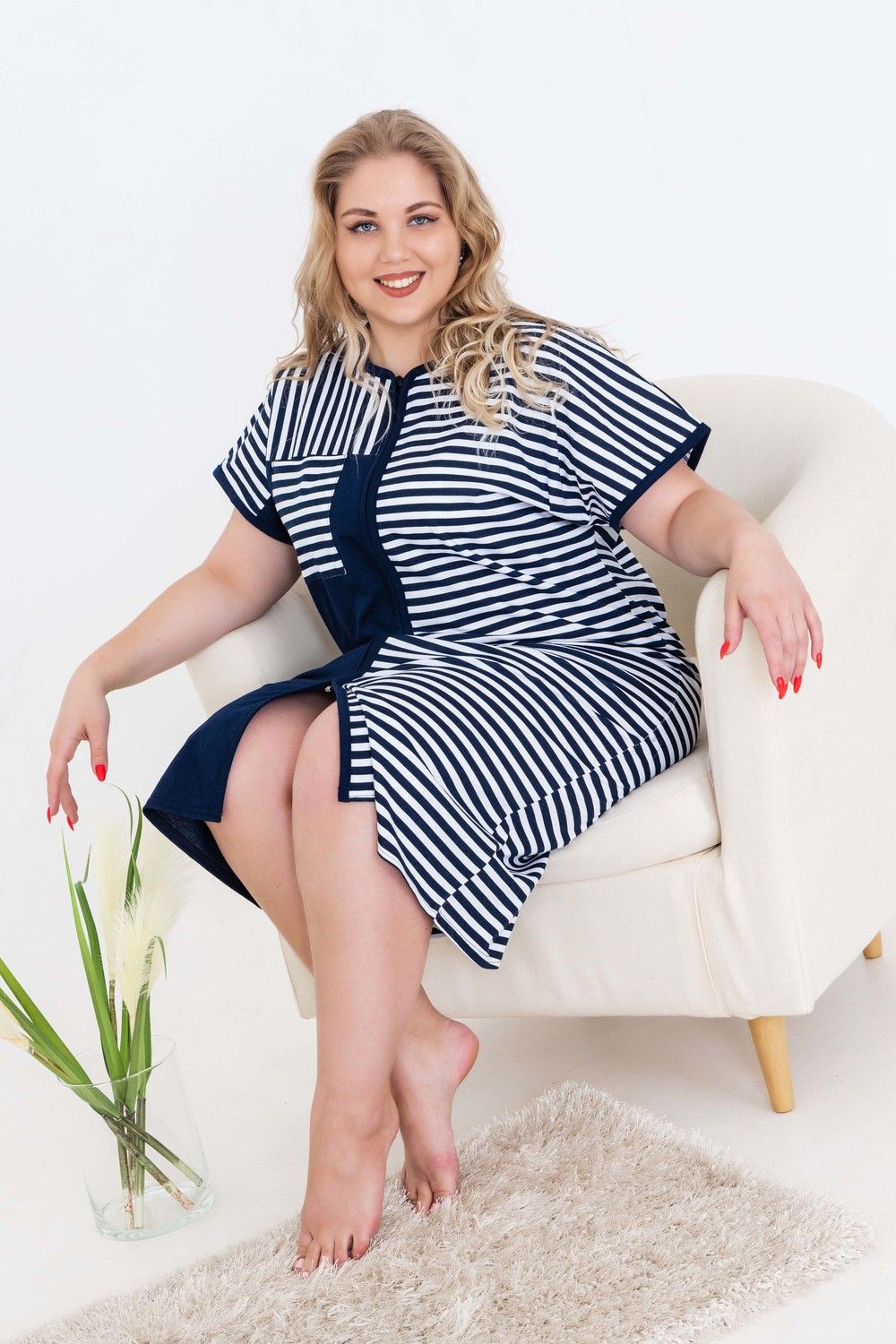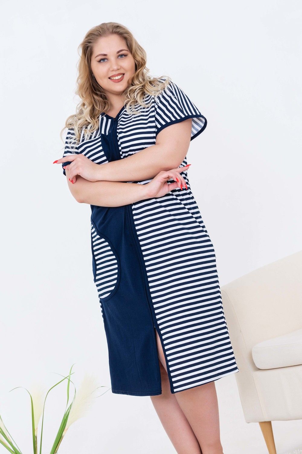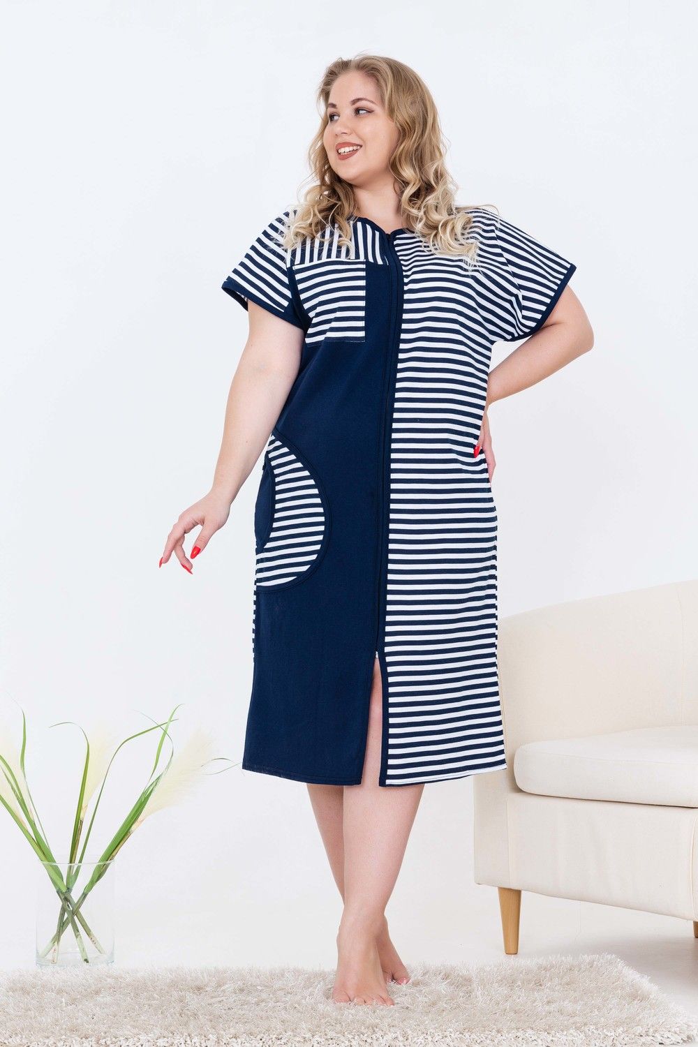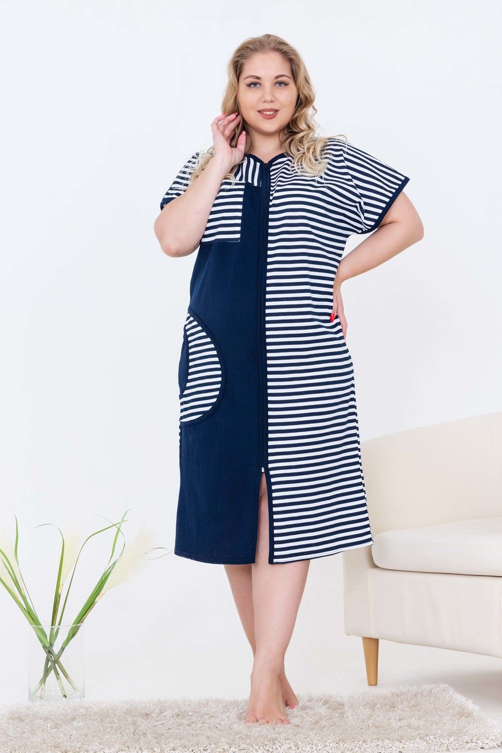 Халат женский домашний, средней длины на молнии, с комфортной посадкой по фигуре. Украшением изделия служит комбинирование тканей: полоска и однотонная ткань. С одной стороны полочки - отрезная кокетка с накладным карманом вверху и внизу. Ткань изделия - кулирная гладь 100% хлопок.