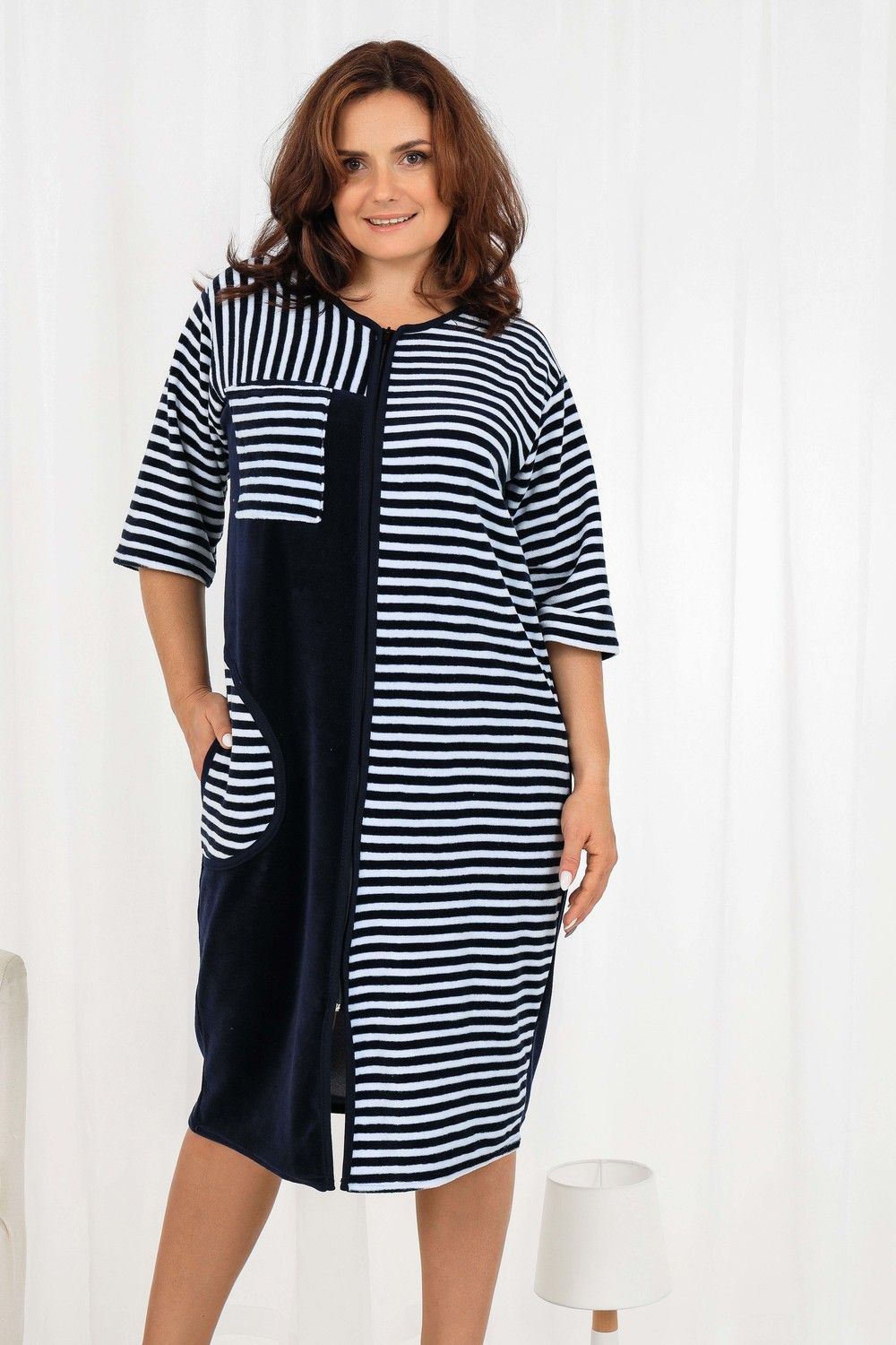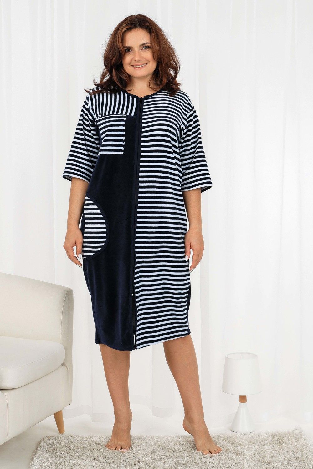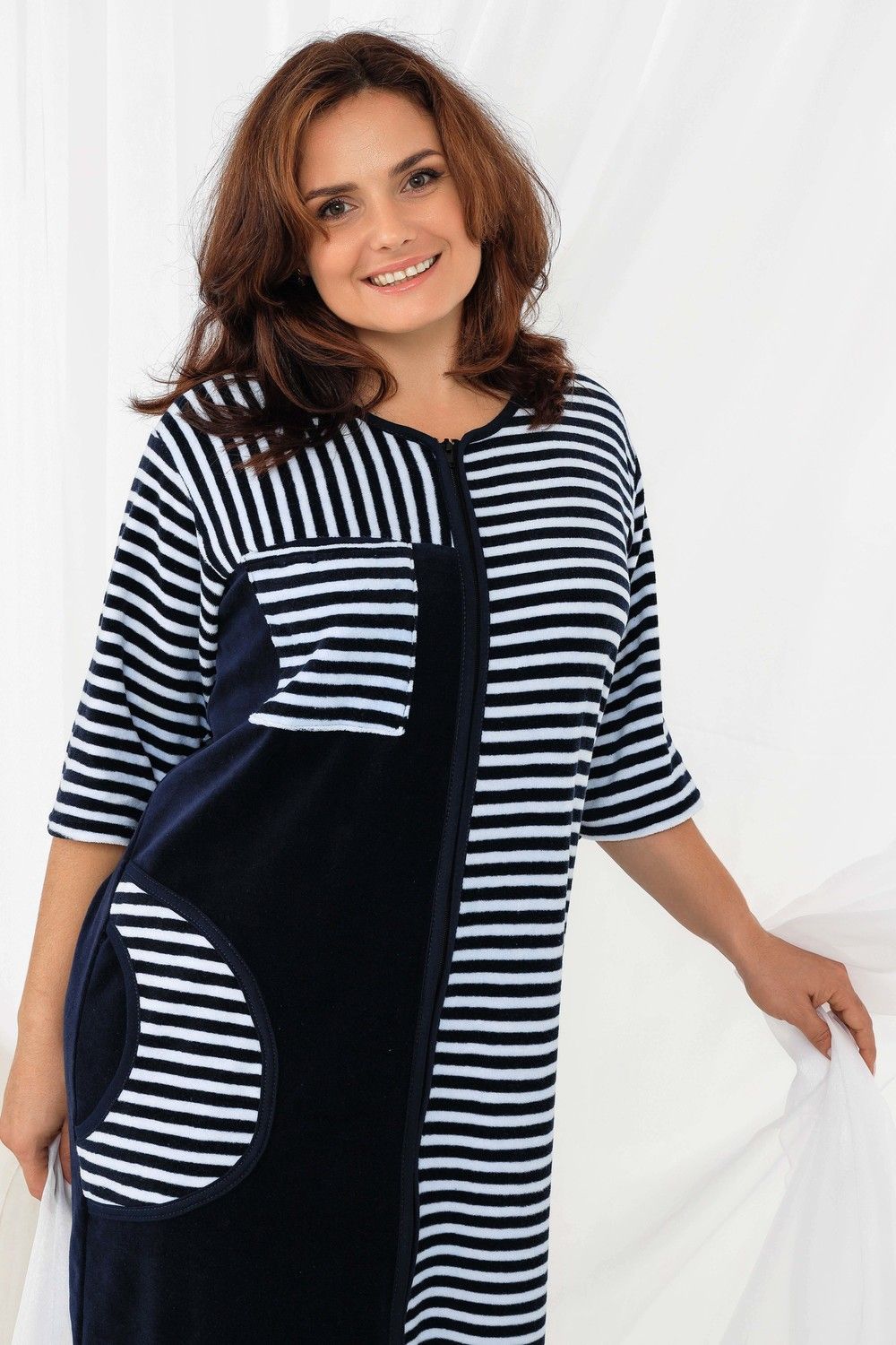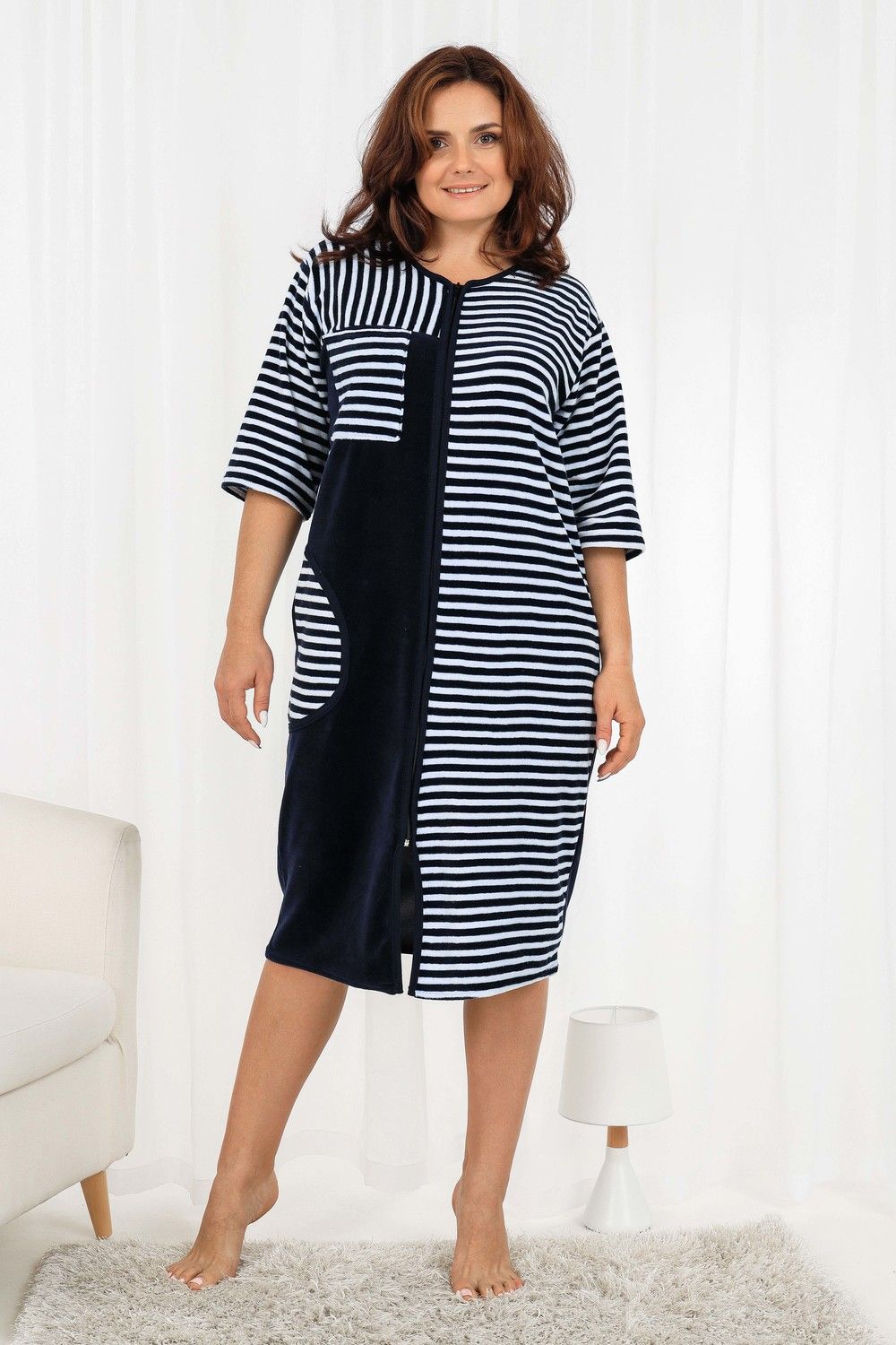 Халат женский домашний, средней длины на молнии, с комфортной посадкой по фигуре. Украшением изделия служит комбинирование тканей: полоска и однотонная ткань. С одной стороны полочки - отрезная кокетка с накладным карманом сверху и снизу.