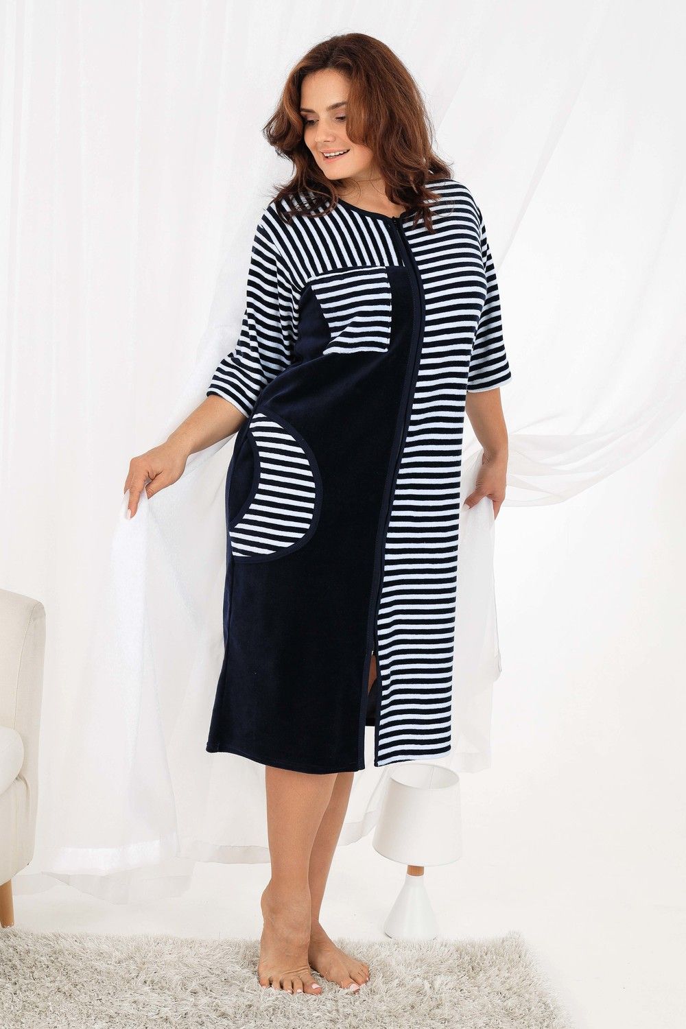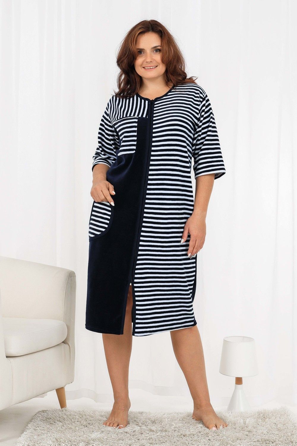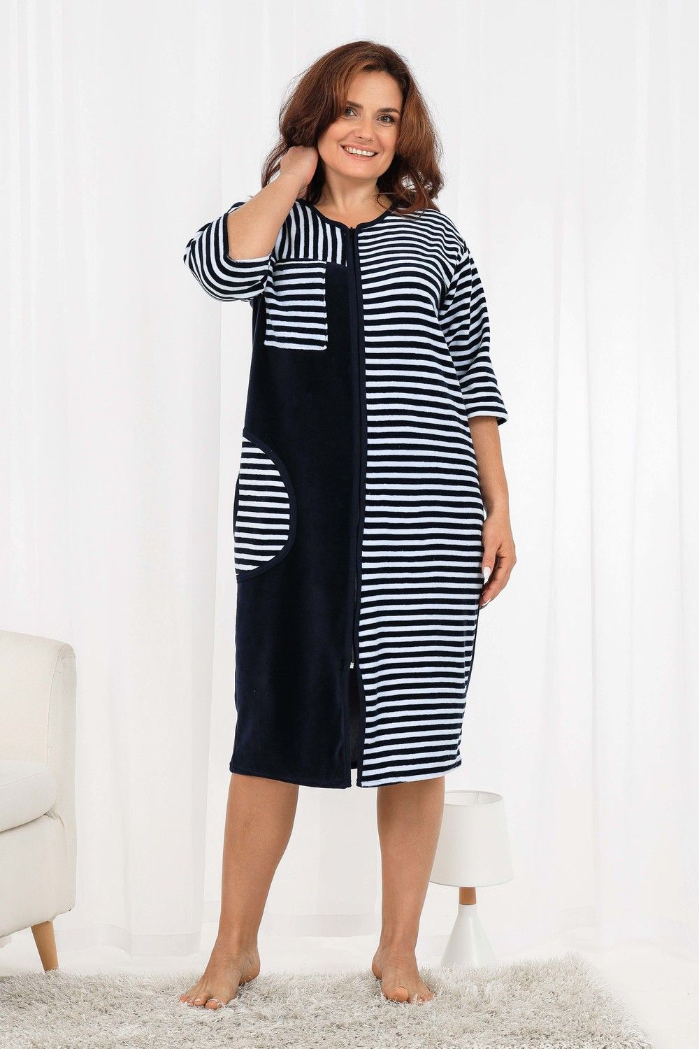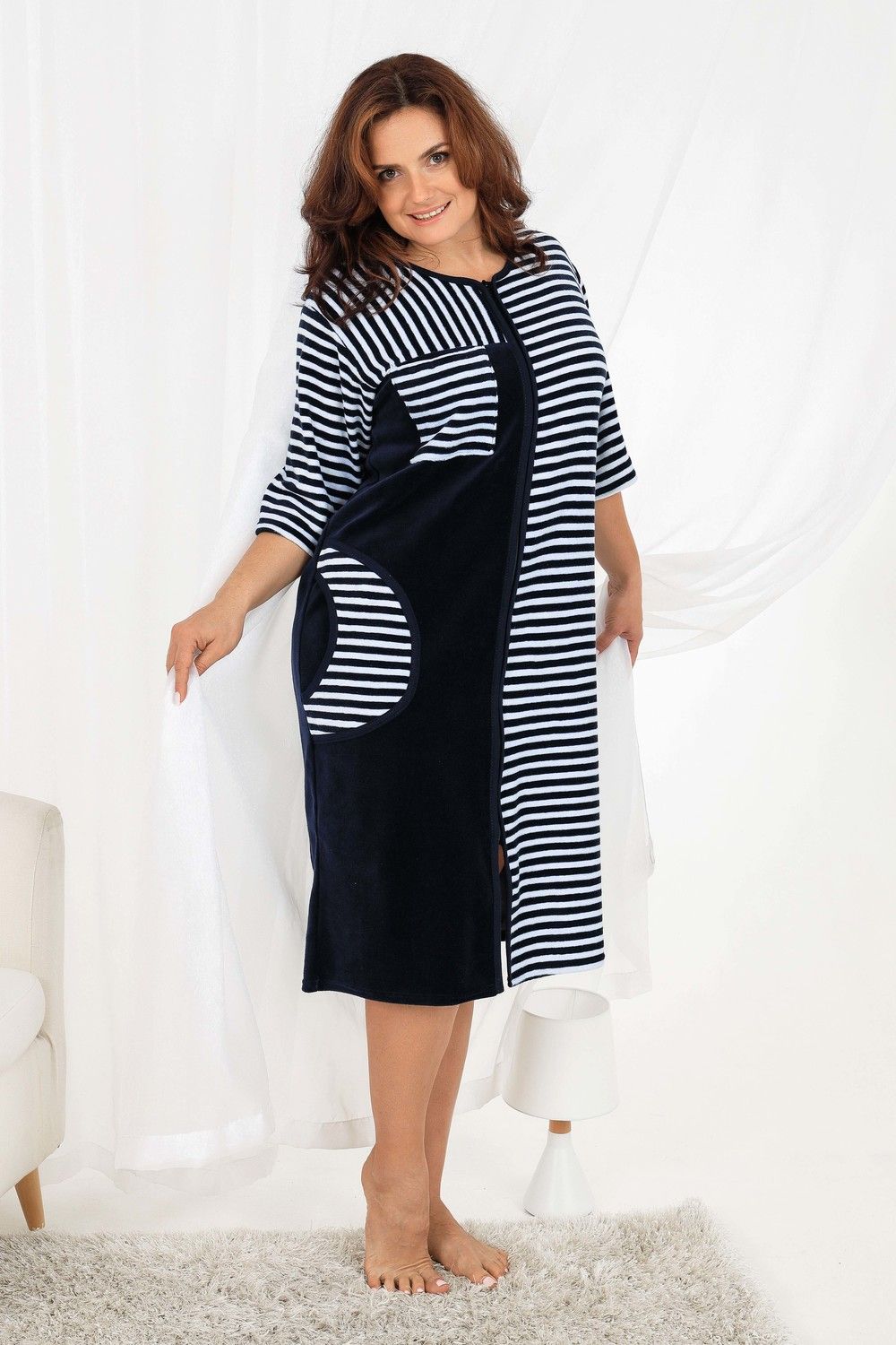 Халат женский домашний, средней длины на молнии, с комфортной посадкой по фигуре. Украшением изделия служит комбинирование тканей: полоска и однотонная ткань. С одной стороны полочки - отрезная кокетка с накладным карманом сверху и снизу.