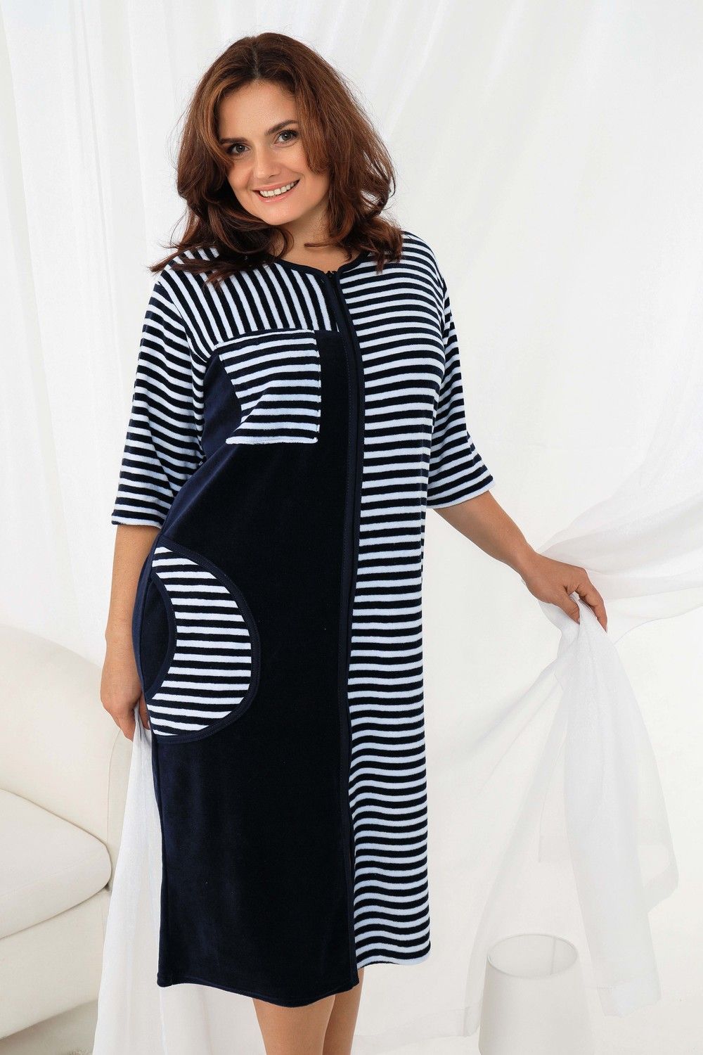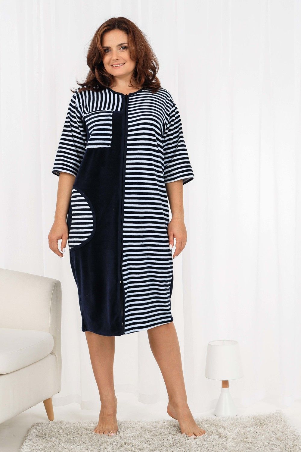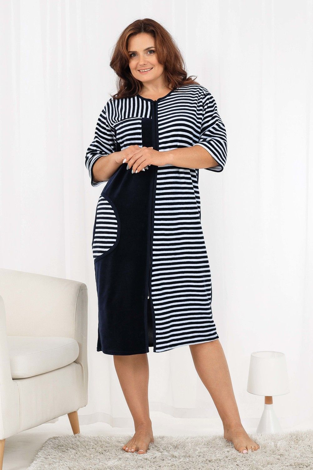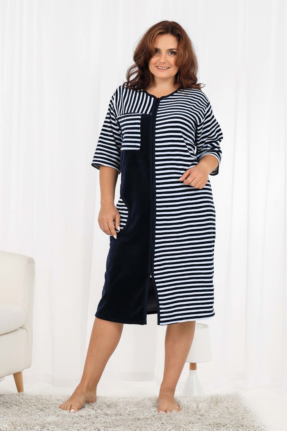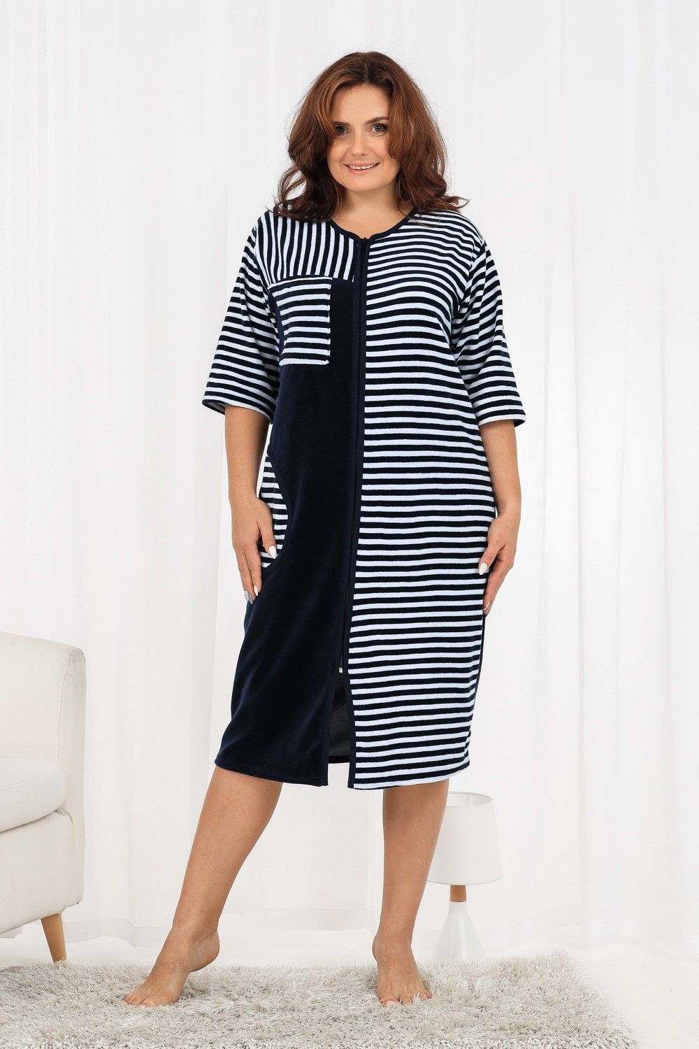 Халат женский домашний, средней длины на молнии, с комфортной посадкой по фигуре. Украшением изделия служит комбинирование тканей: полоска и однотонная ткань. С одной стороны полочки - отрезная кокетка с накладным карманом сверху и снизу.