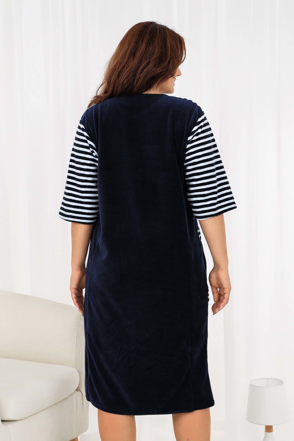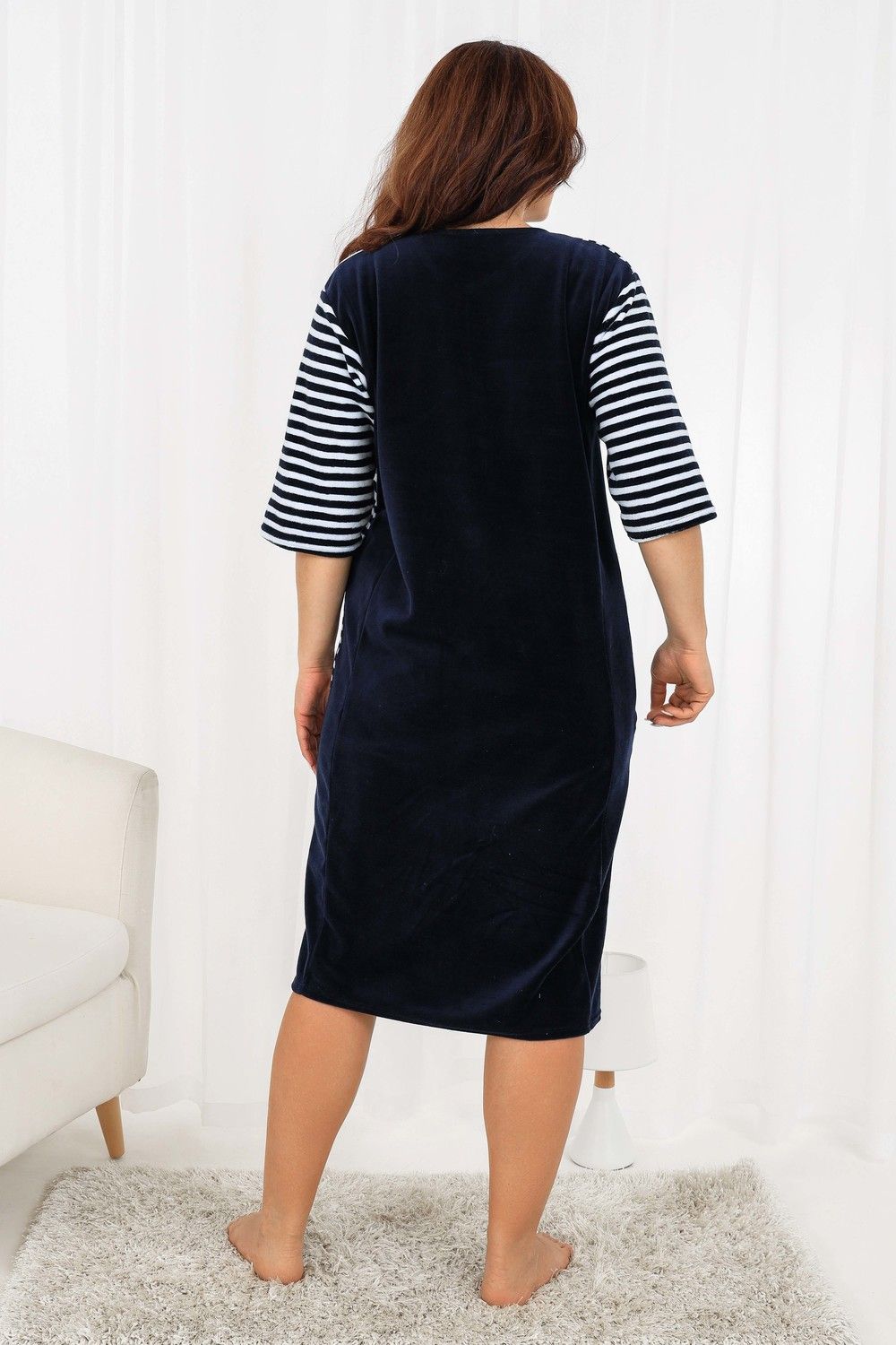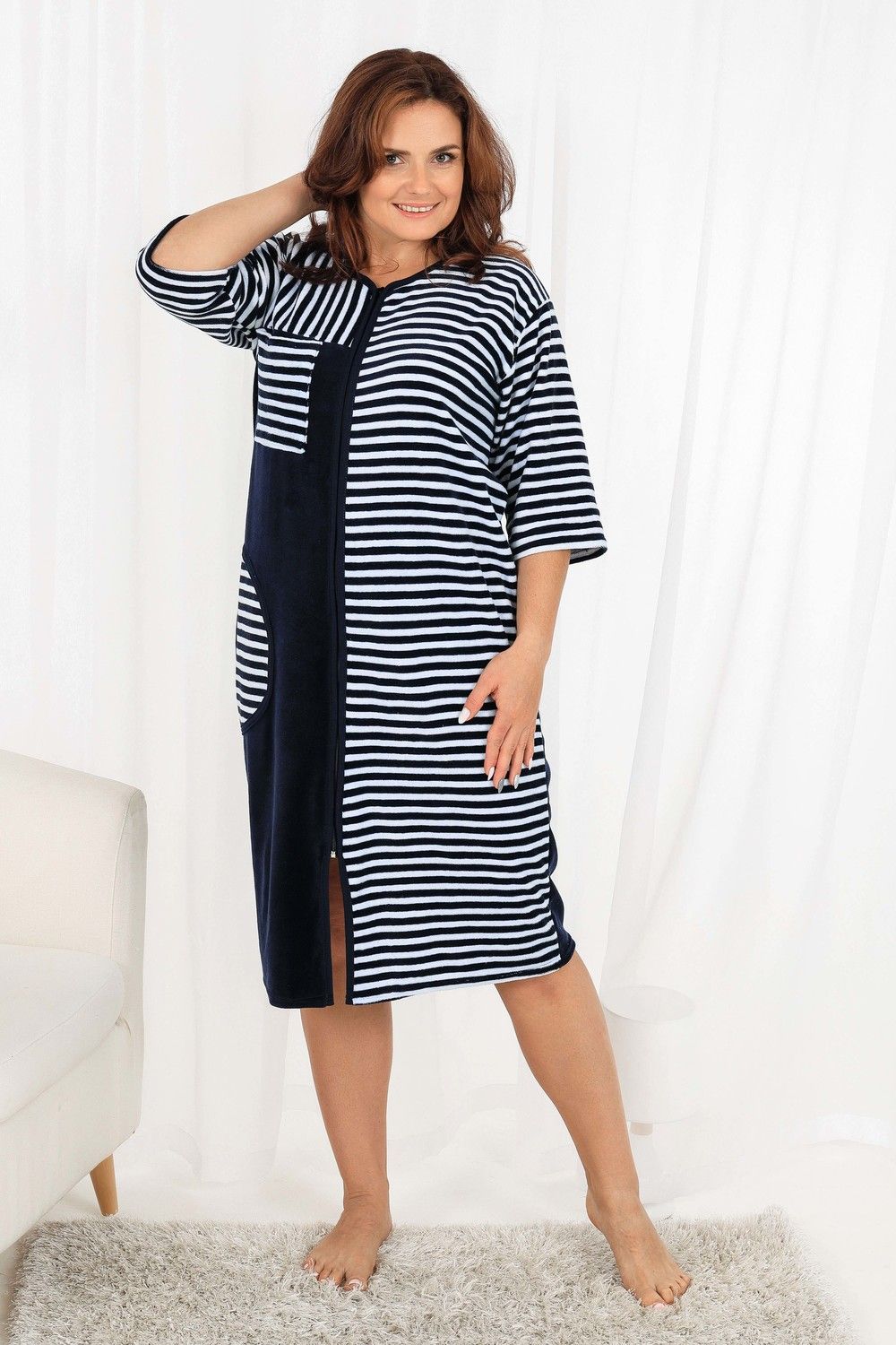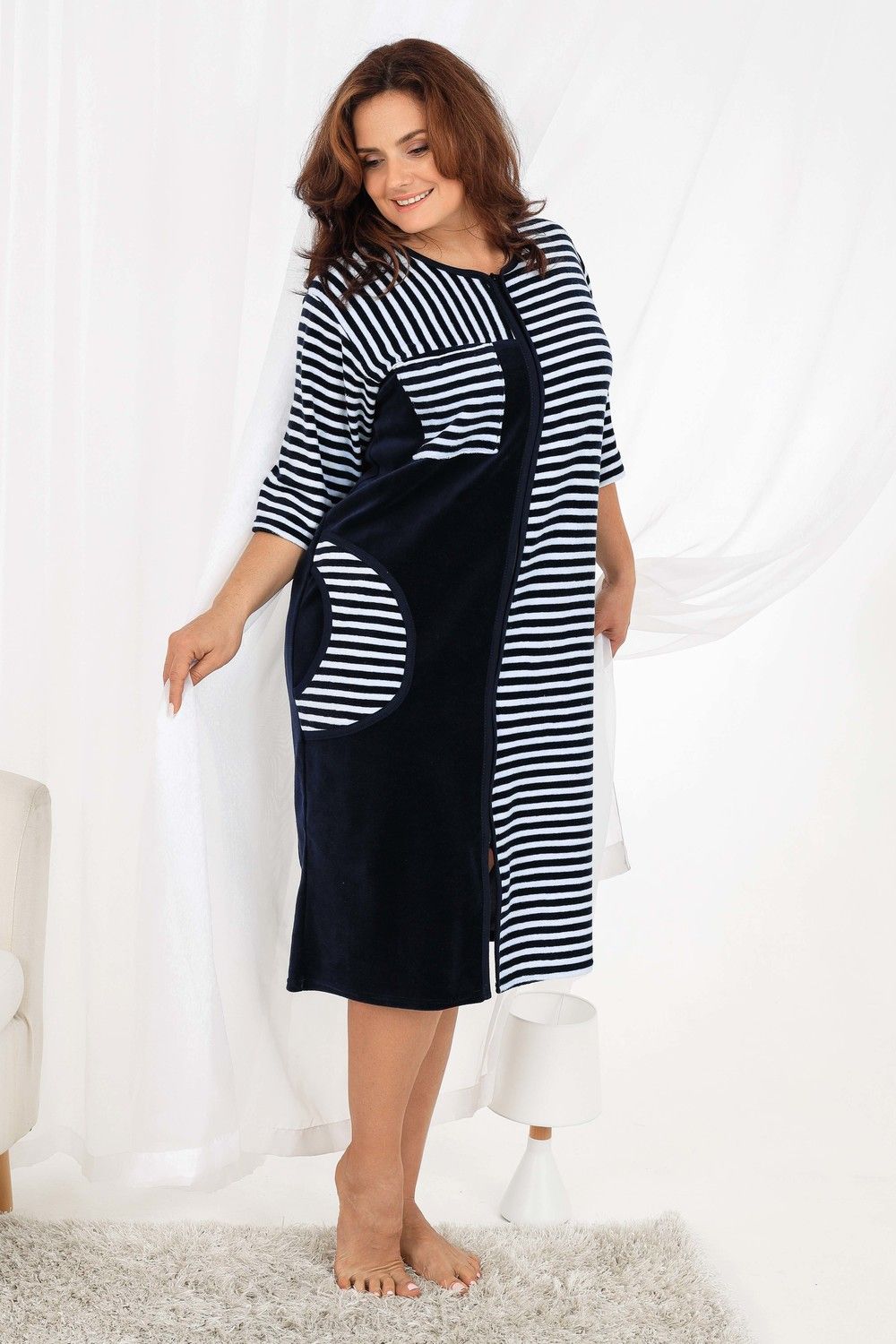 Халат женский домашний, средней длины на молнии, с комфортной посадкой по фигуре. Украшением изделия служит комбинирование тканей: полоска и однотонная ткань. С одной стороны полочки - отрезная кокетка с накладным карманом сверху и снизу.