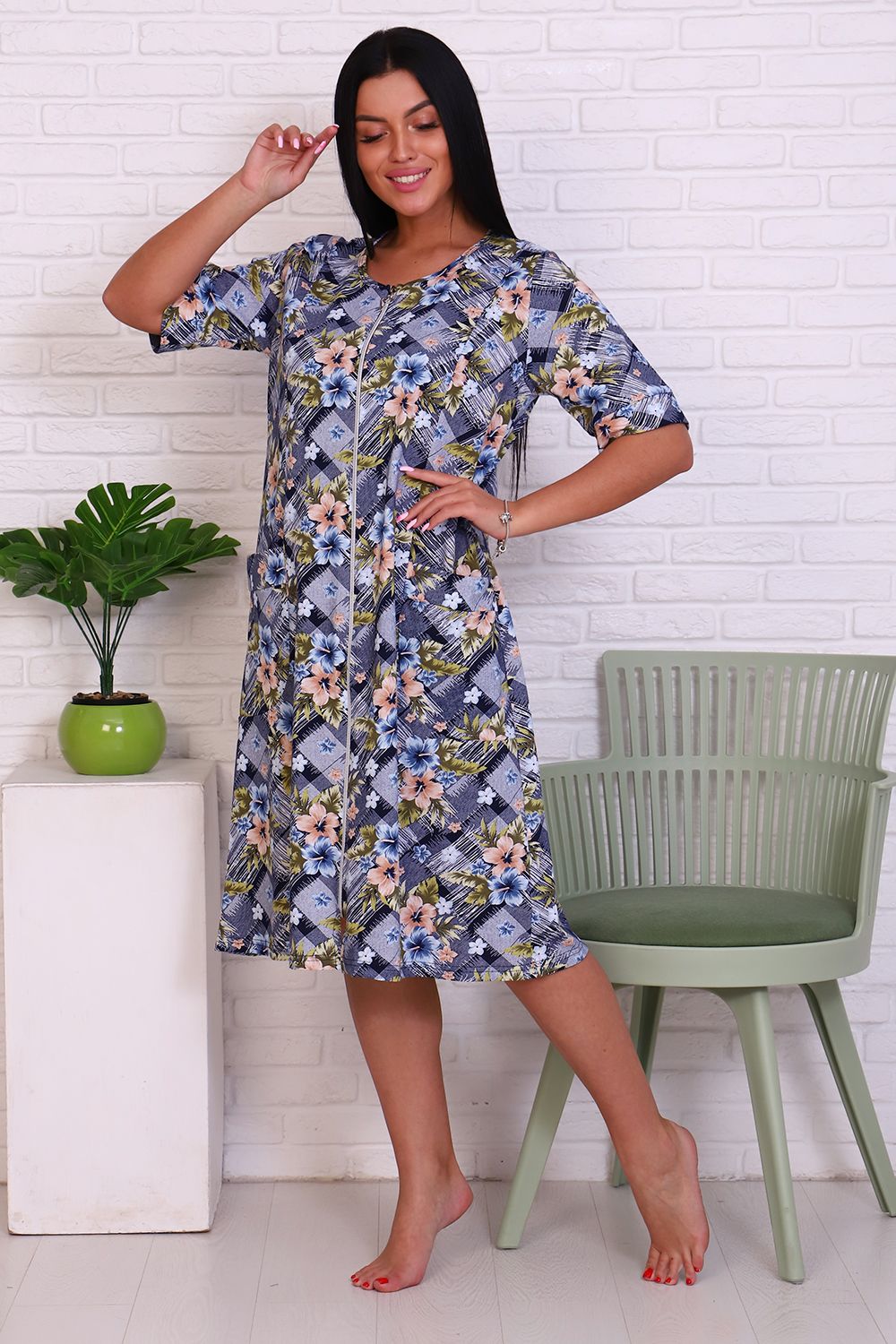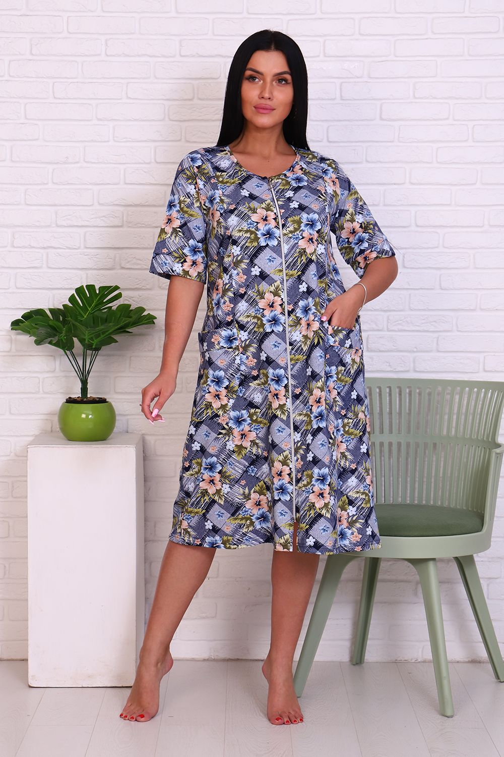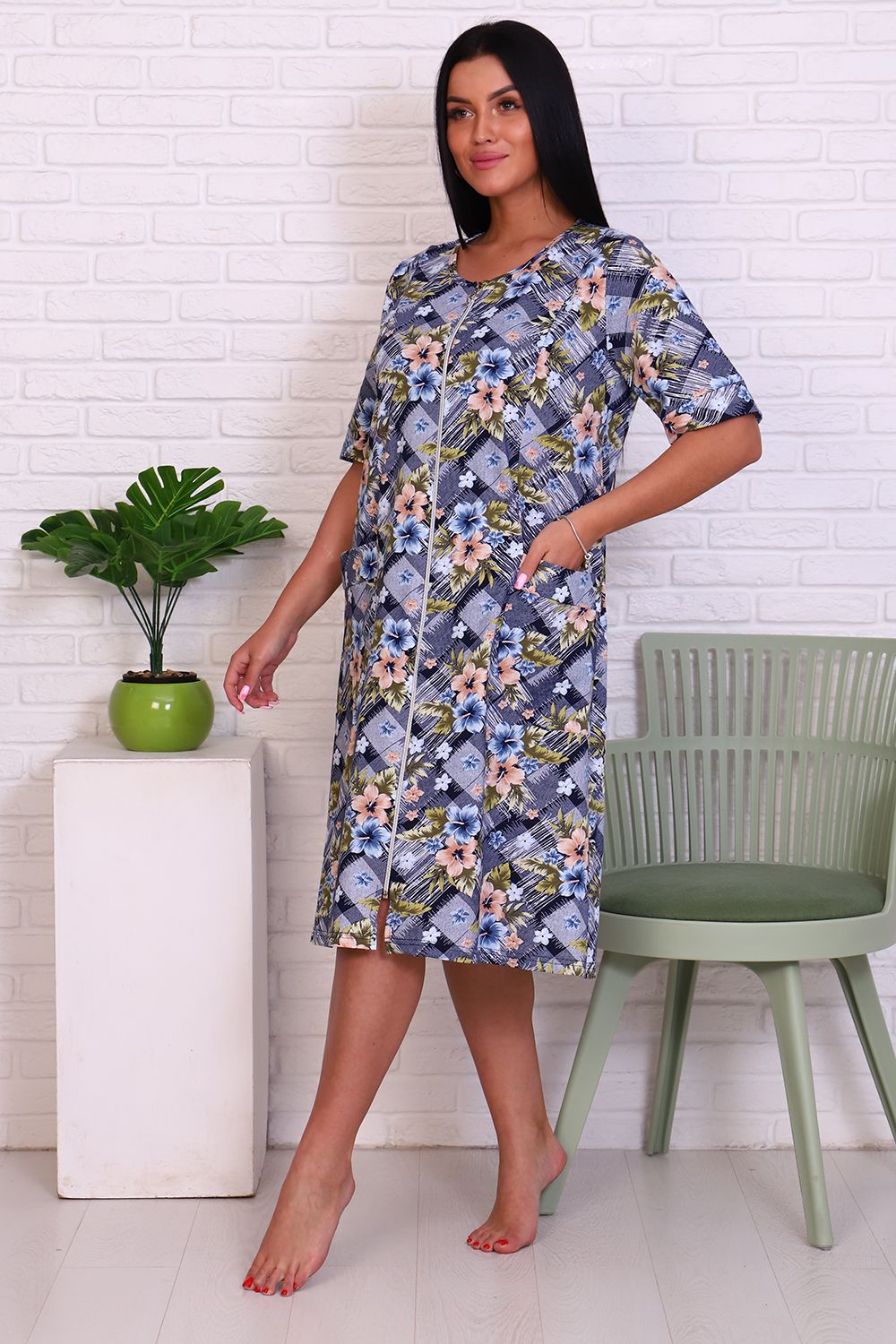 Женский домашний халат на молнии, выполнен из трикотажного полотна (100% хлопок). Горловина округлая, обработана кантом, низ рукава и карманы обработаны манжетой. Халат немного свободного силуэта, что не будет сковывать ваши движения. Эта модель прекрасно подойдет для отдыха дома и на даче.
