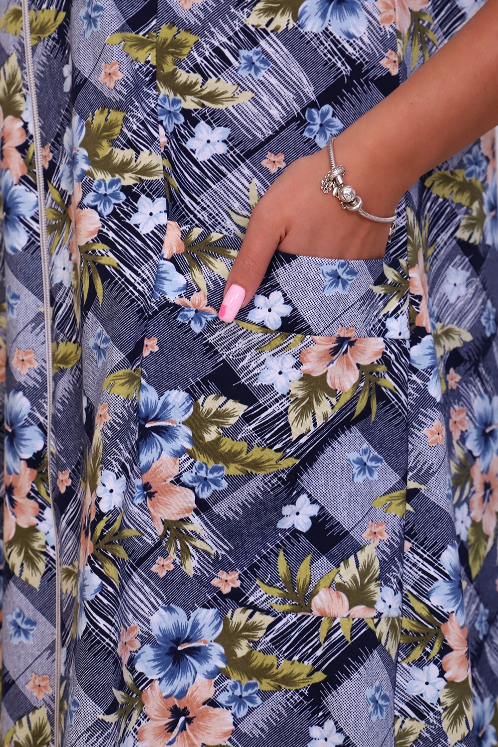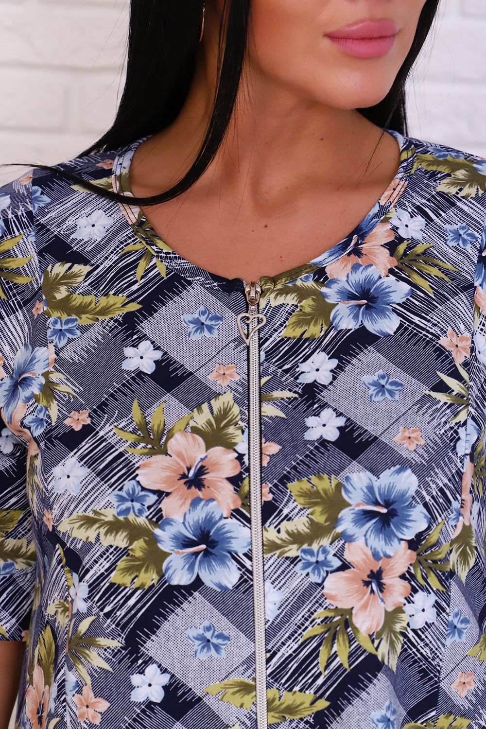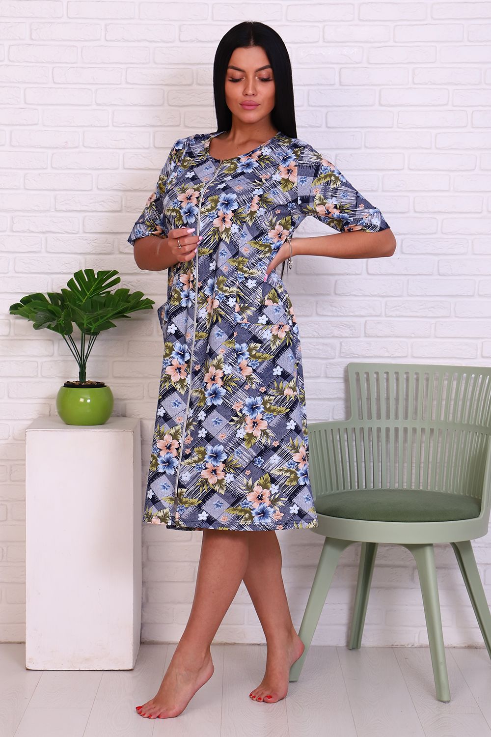 Женский домашний халат на молнии, выполнен из трикотажного полотна (100% хлопок). Горловина округлая, обработана кантом, низ рукава и карманы обработаны манжетой. Халат немного свободного силуэта, что не будет сковывать ваши движения. Эта модель прекрасно подойдет для отдыха дома и на даче.