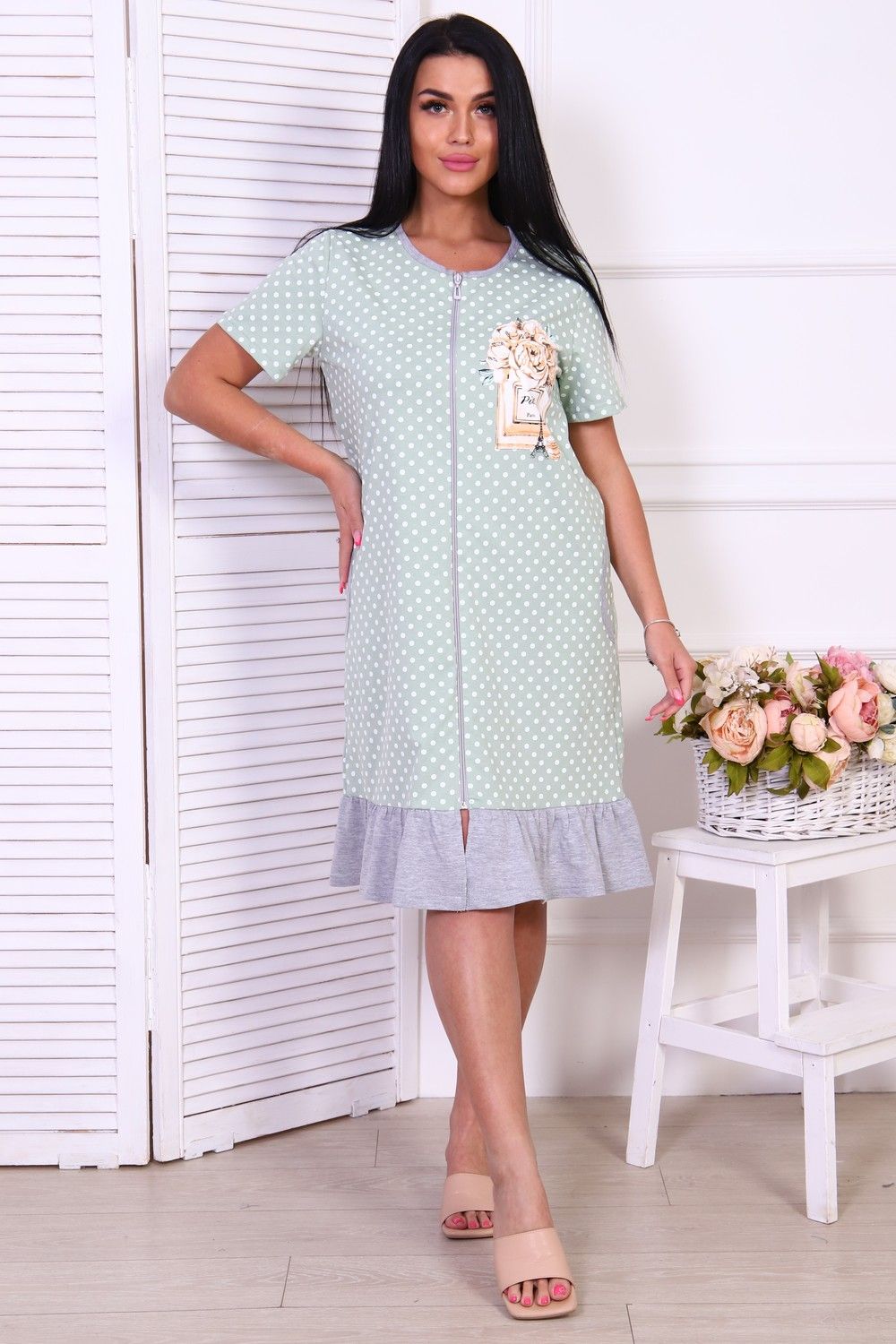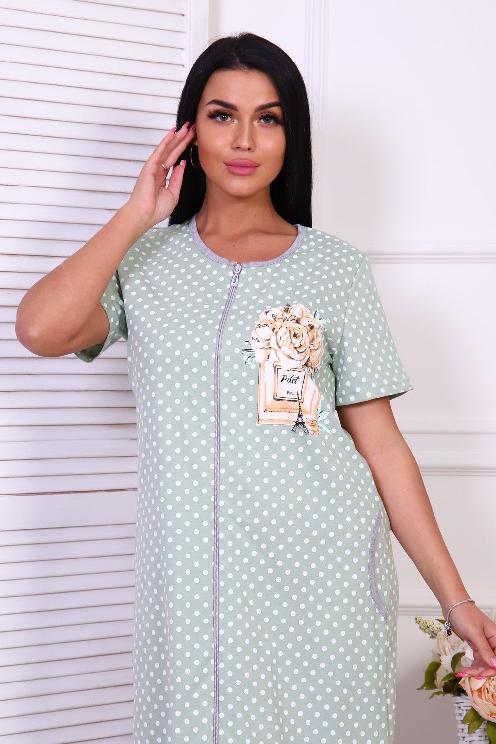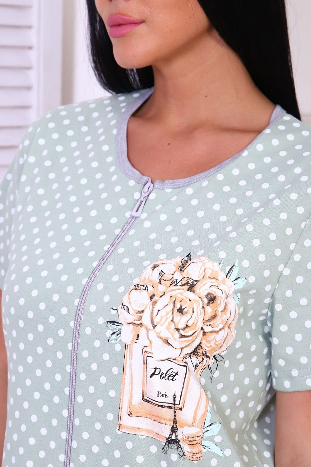 Халат в горошек на молнии, с боковыми карманами с принтом на левой полочке.
