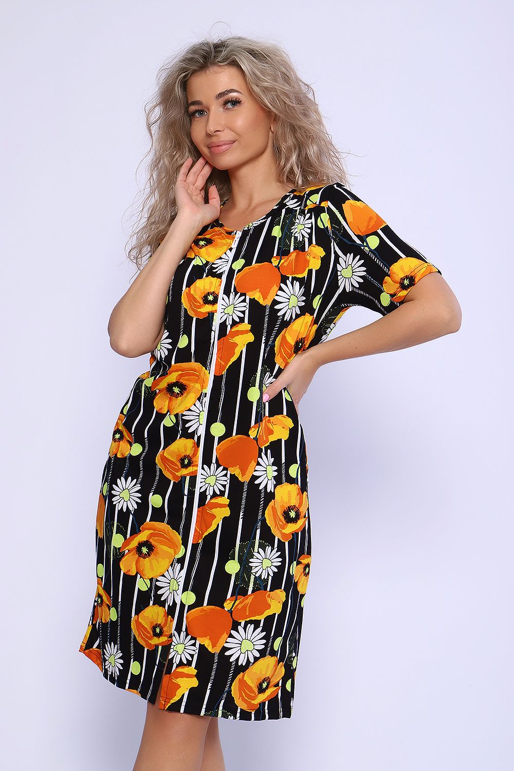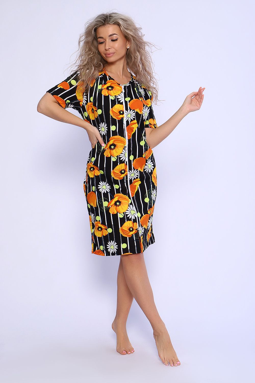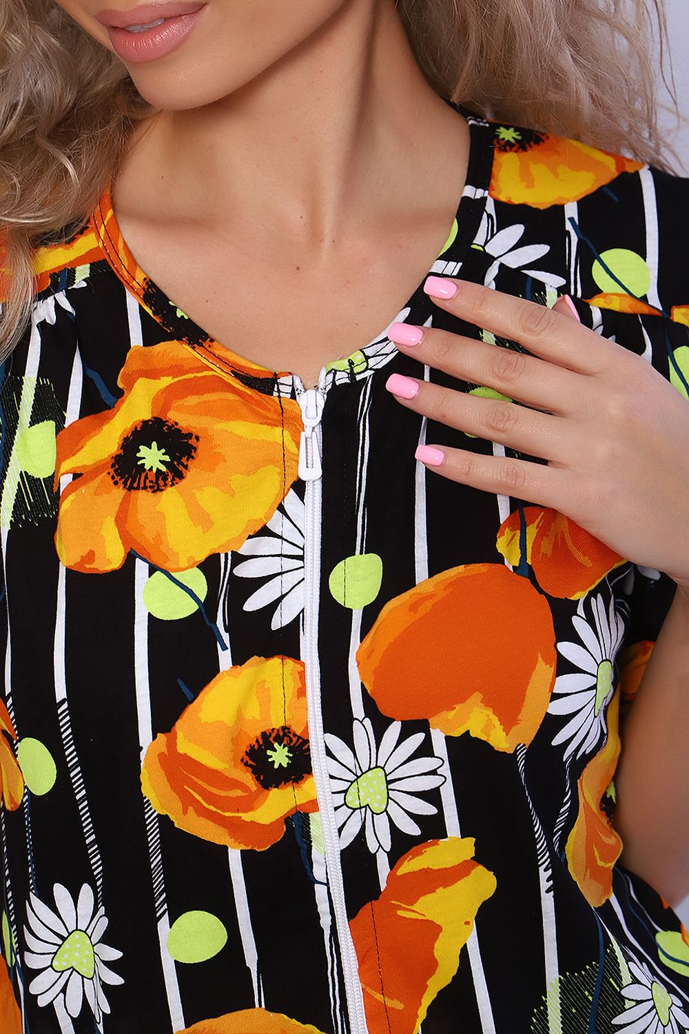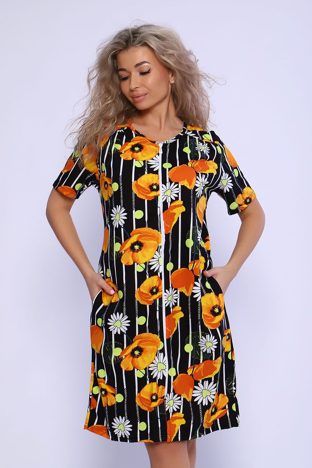 Халат на молнии свободного силуэта с короткими рукавами. Полочка и спинка на кокетках и со сборкой. Карманы в боковых швах. Комфортен для повседневной носки.