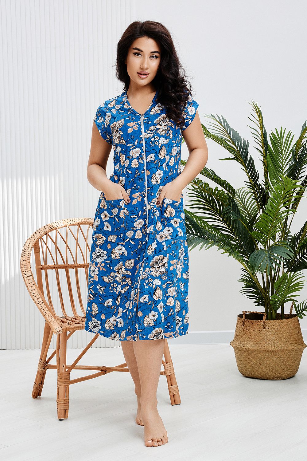 Халат женский на молнии оригинальной расцветки с коротким рукавом выполнен из 100% хлопка. Горловина имеет V-образный вырез, обработана узким кантом, рукава и карманы подшиты. Модель очень легкая, идеально подойдет для повседневной носки и отдыха.