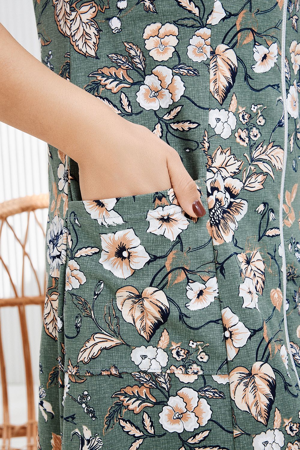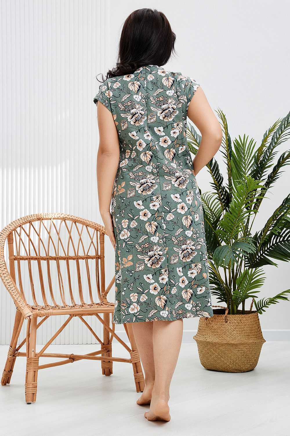 Халат женский на молнии оригинальной расцветки с коротким рукавом выполнен из 100% хлопка. Горловина имеет V-образный вырез, обработана узким кантом, рукава и карманы подшиты. Модель очень легкая, идеально подойдет для повседневной носки и отдыха.