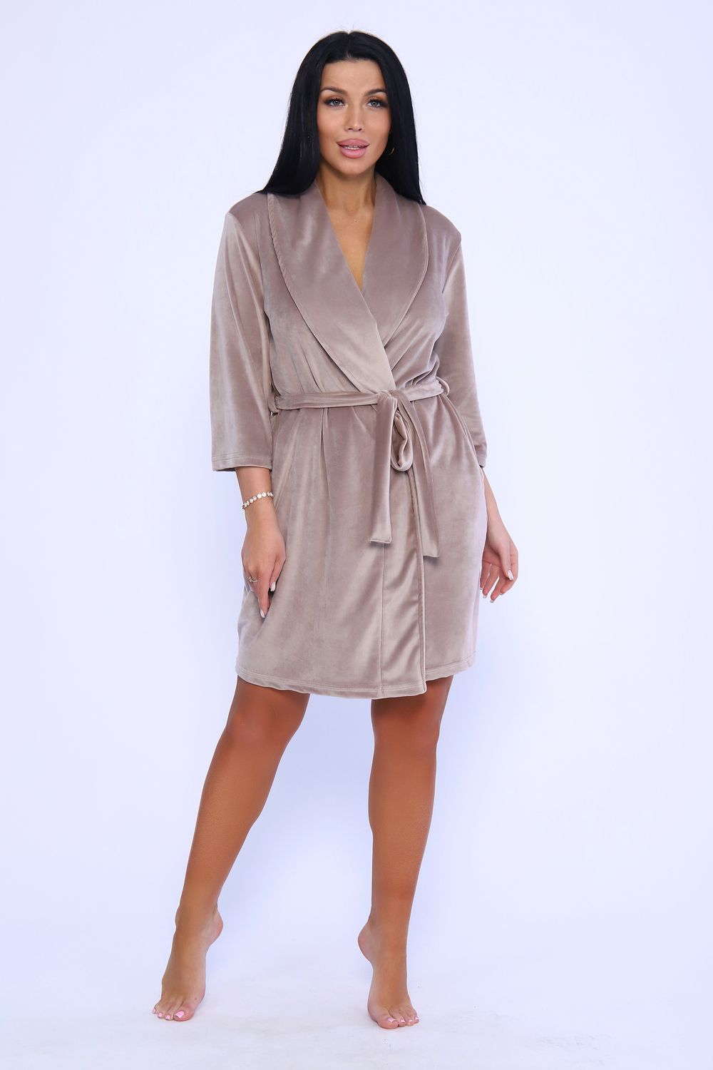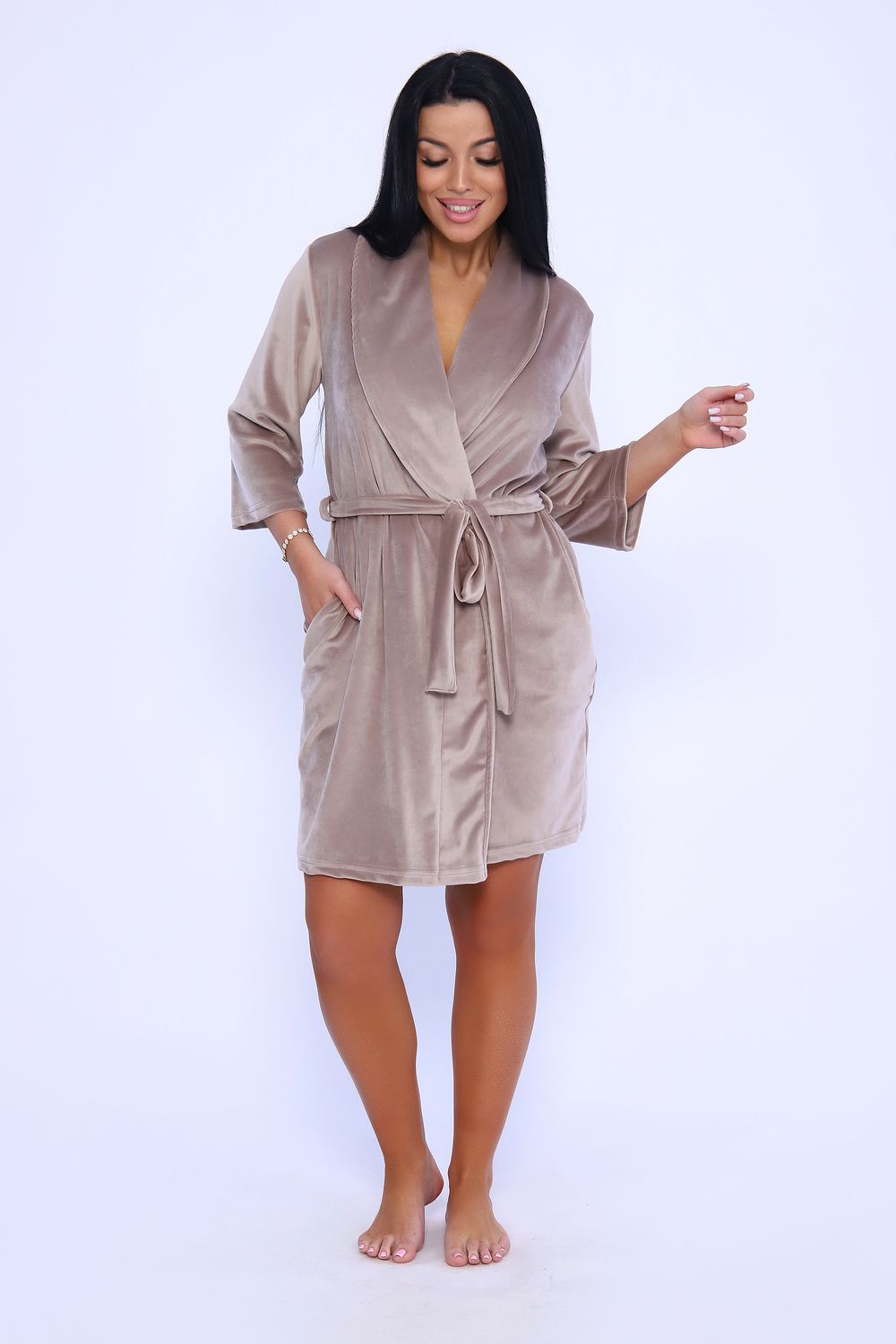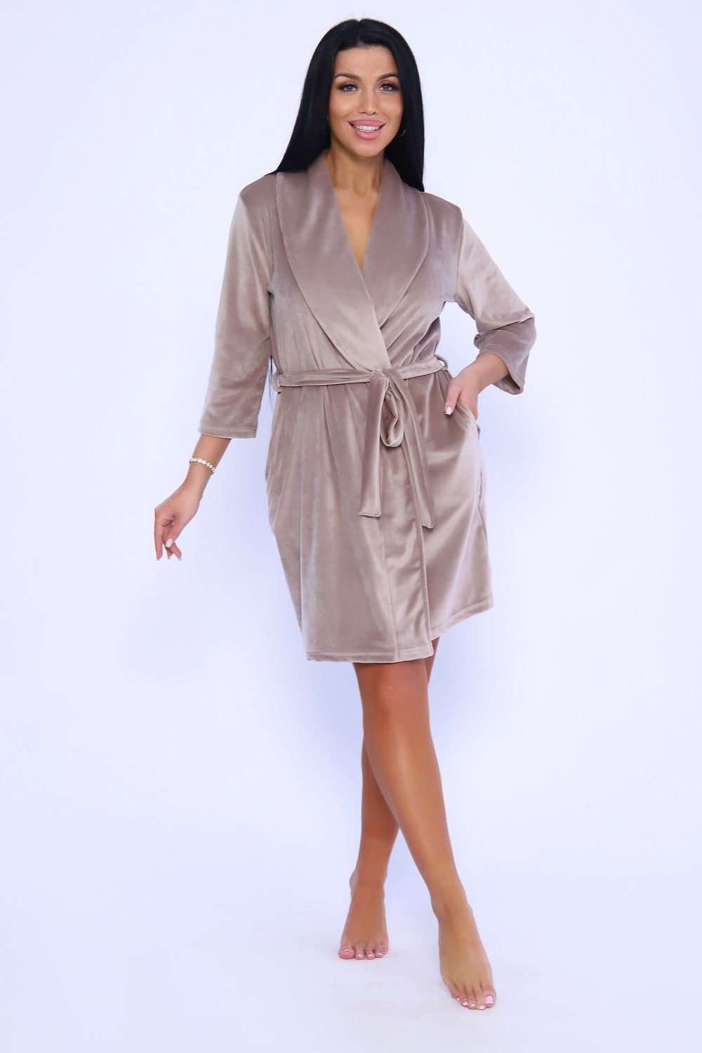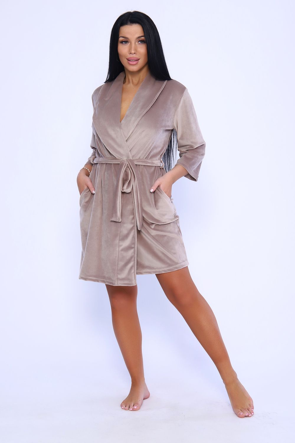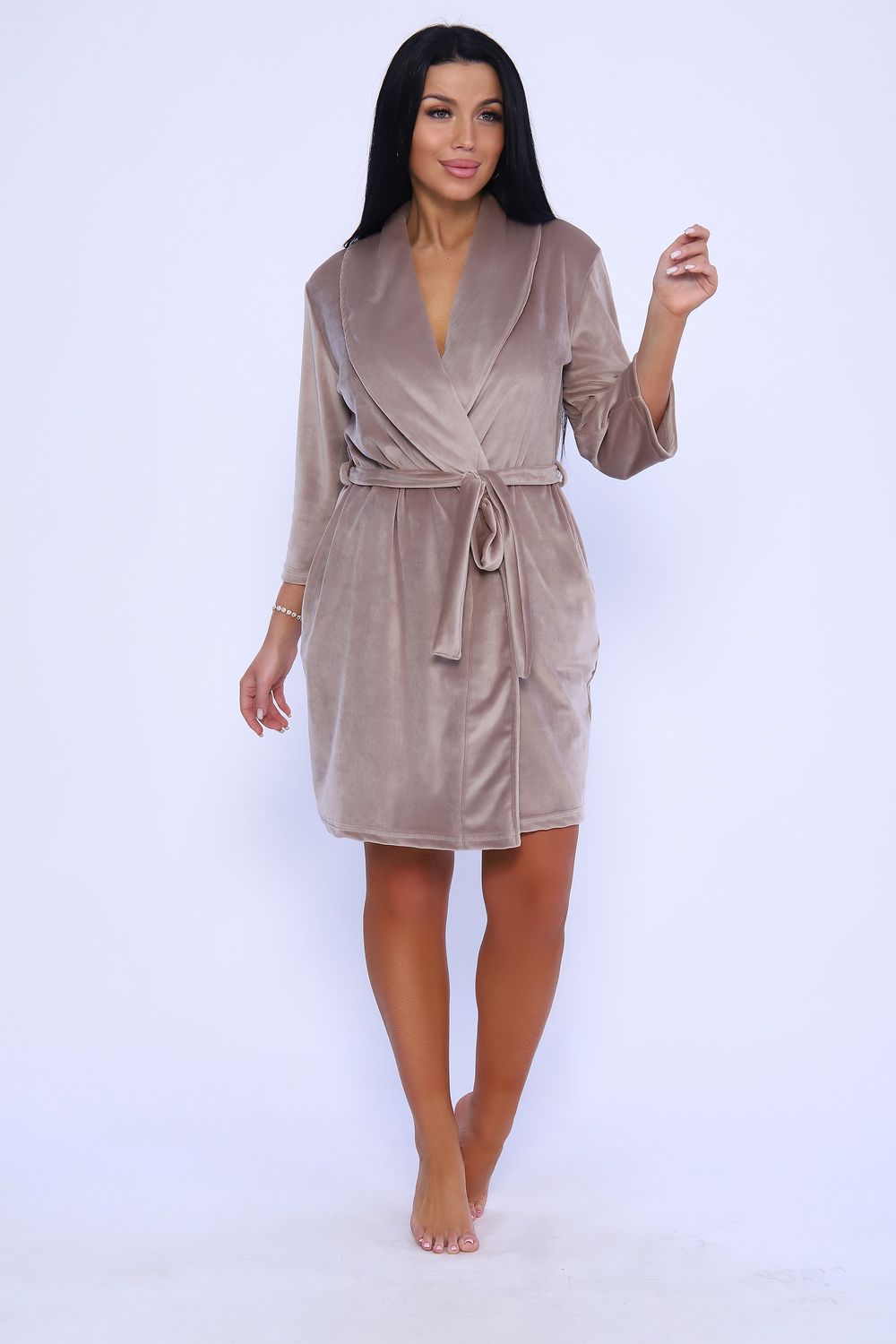 Женственный халатик на запах с поясом полуприлегающего силуэта длиной чуть выше колена с воротником - шалькой. Выполнен из нежной бархатной ткани приятных оттенков - велюра, которая очень приятна к телу, в меру теплая и практически не мнется, что делает ношение вещи удобнее. Халат оснащен внутренним поясом. По краю борта декоративная отстрочка шириной 0,5 см. Рукав втачной длиной 3/4. Укороченная длина рукава удобна для ношения на кухне. Два кармана с фигурным входом расположены в боковых швах. На уровне талии две петли для пояса. Низ изделия и рукава подогнуты на плоскошовной машине, длина пояса 170 см. Халат на запах - незаменимая вещь в гардеробе каждой женщины, комфортна в ношении и может быть прекрасным подарком для любимых.