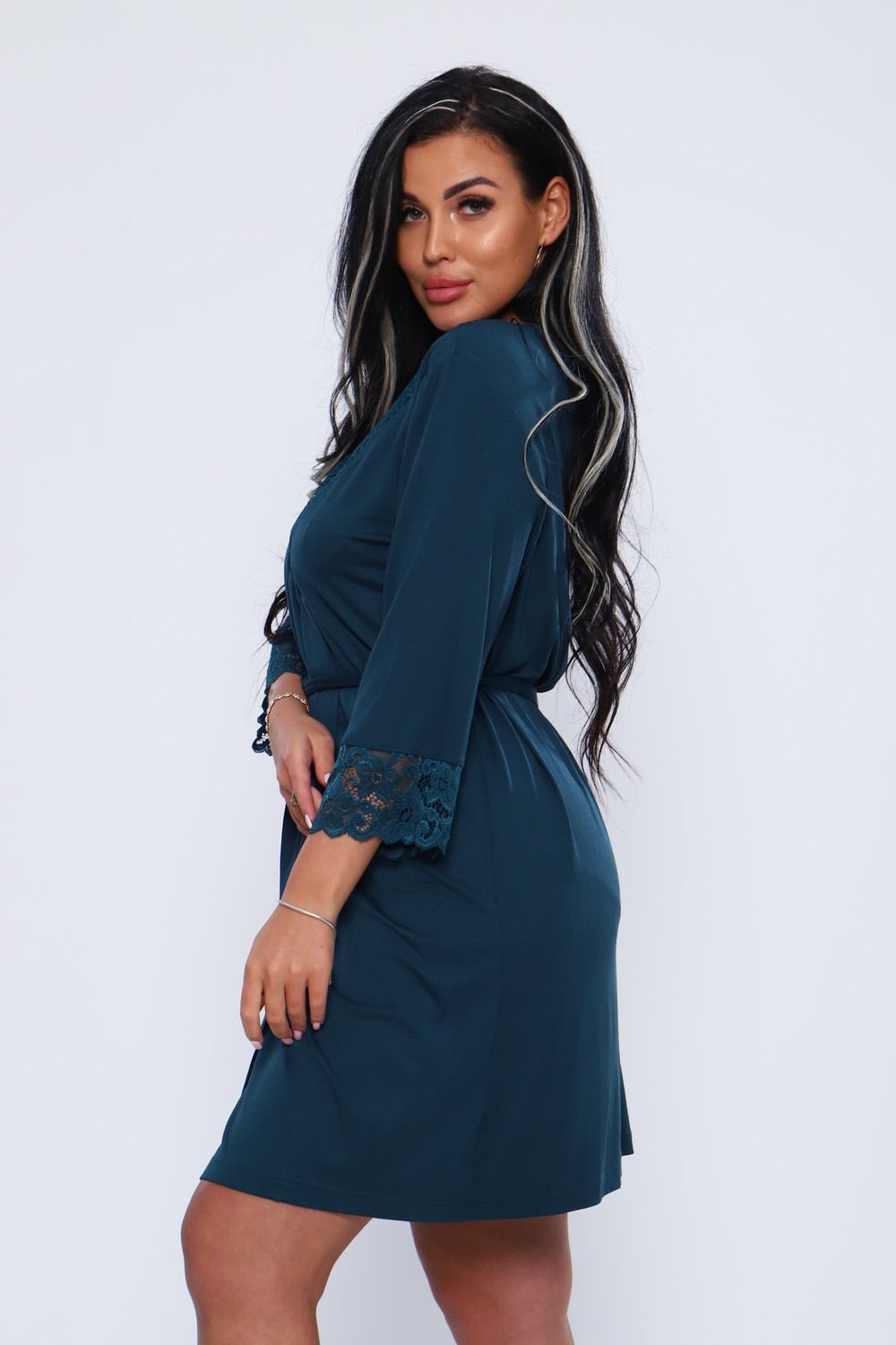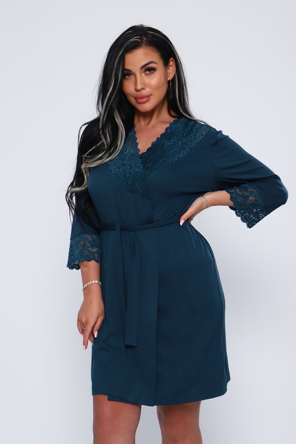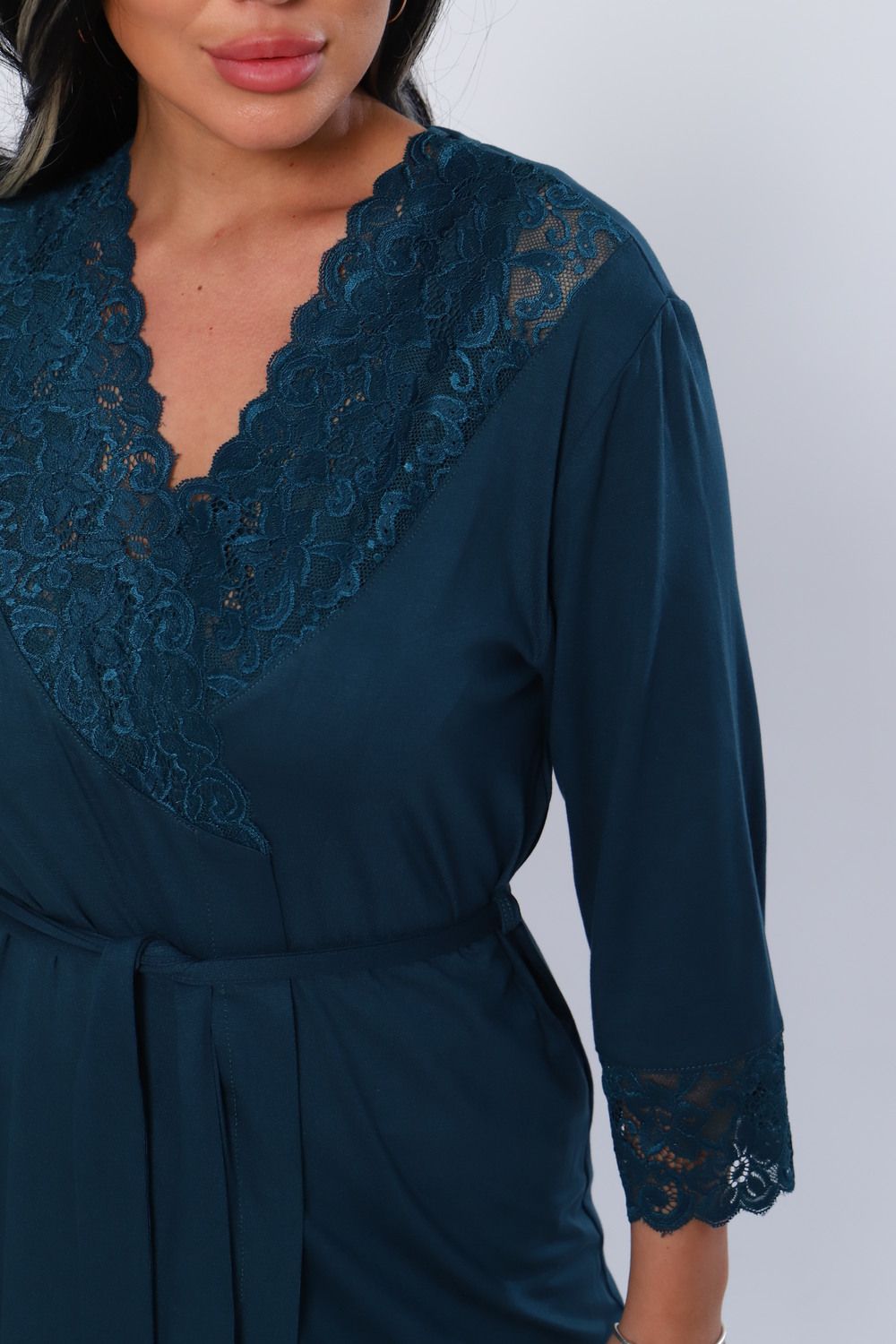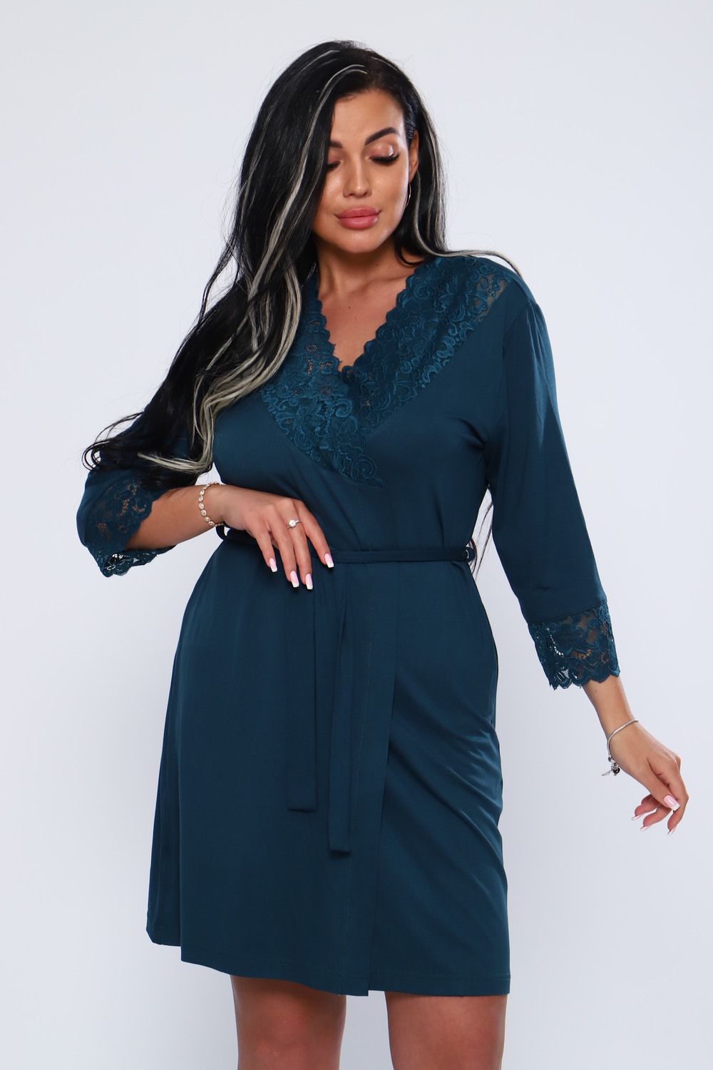 Халат женский из вискозы с кружевом. Мягкая, нежная, шелковистая ткань и соблазнительное декольте, придаст вам удовольствие. Халат до колен, рукав 34 с кружевом. Очень приятный к телу. На модели 48 размер. Идеально подойдет к модели 78519. Будьте соблазнительны и любимы.