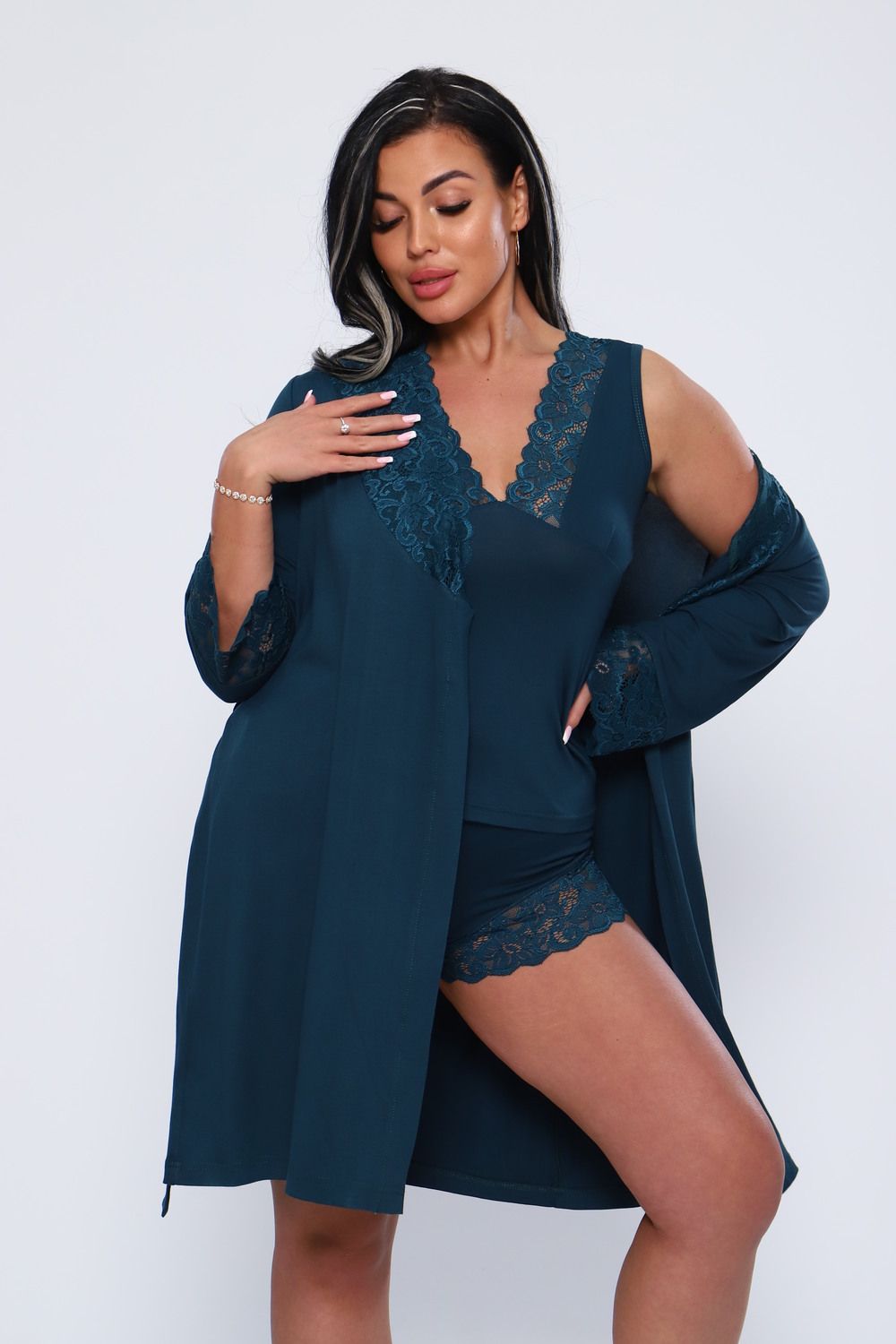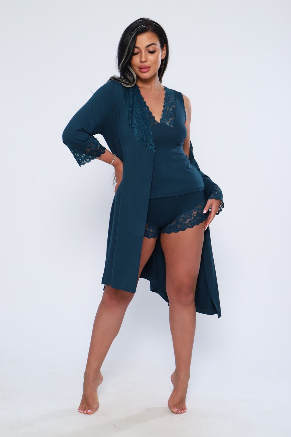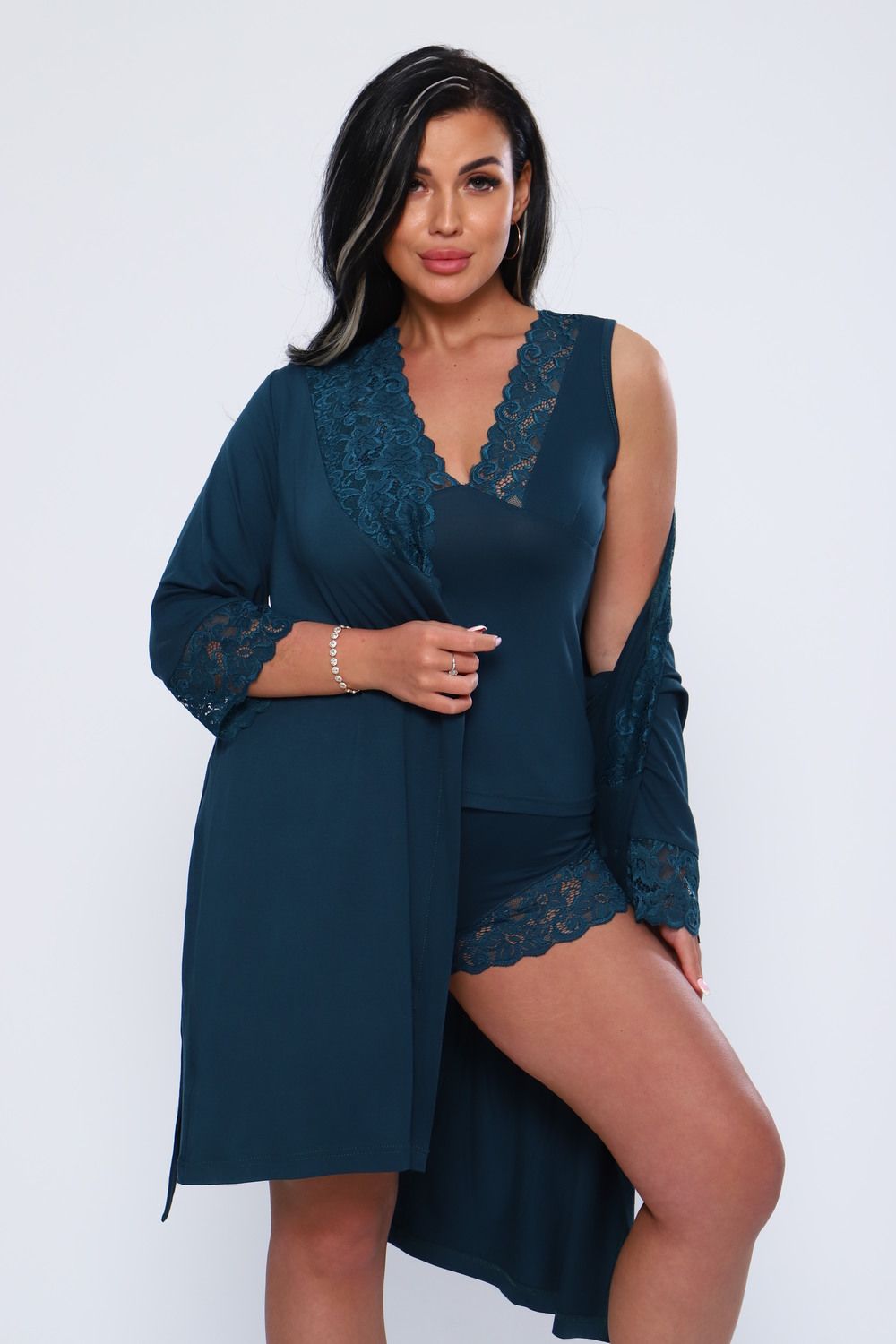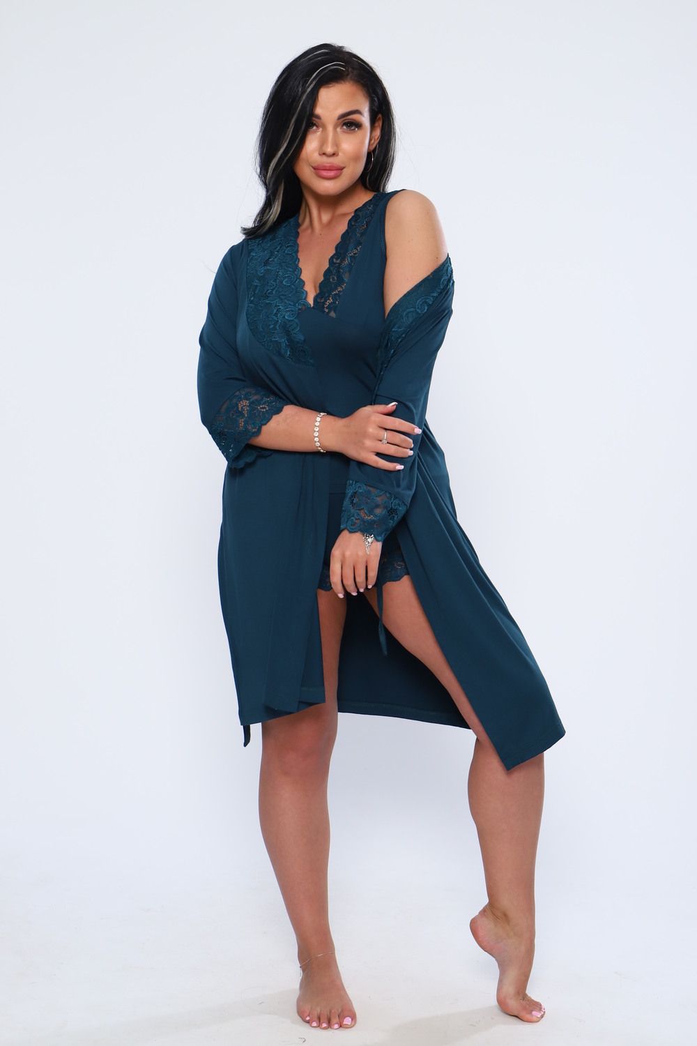 Халат женский из вискозы с кружевом. Мягкая, нежная, шелковистая ткань и соблазнительное декольте, придаст вам удовольствие. Халат до колен, рукав 34 с кружевом. Очень приятный к телу. На модели 48 размер. Идеально подойдет к модели 78519. Будьте соблазнительны и любимы.