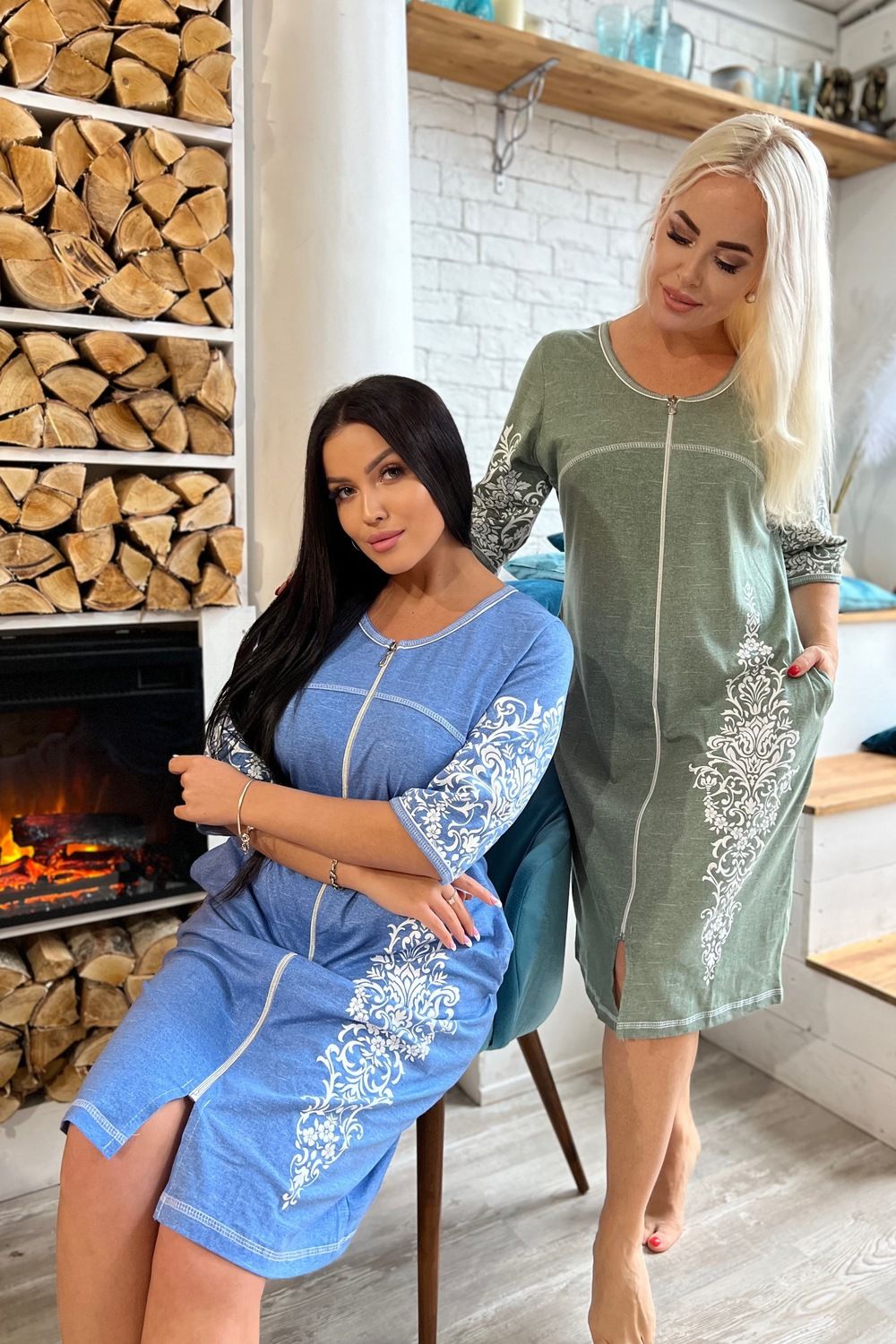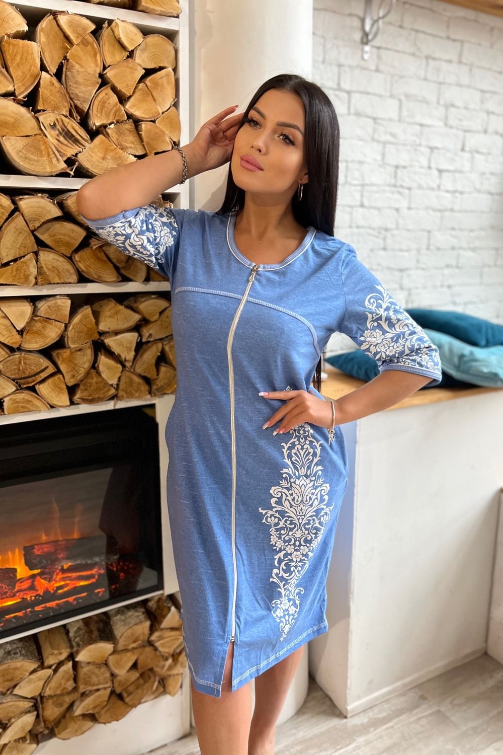 Халат на молнии, полуприлегающего силуэта, длиной ниже колена, с округлой горловиной, с карманами в боковом шве. Рукав втачной, длиной 3/4. В верхней части полочки и спинки расположены фигурные кокетки. Горловина и низ рукавов обработаны бейкой из основного полотна.