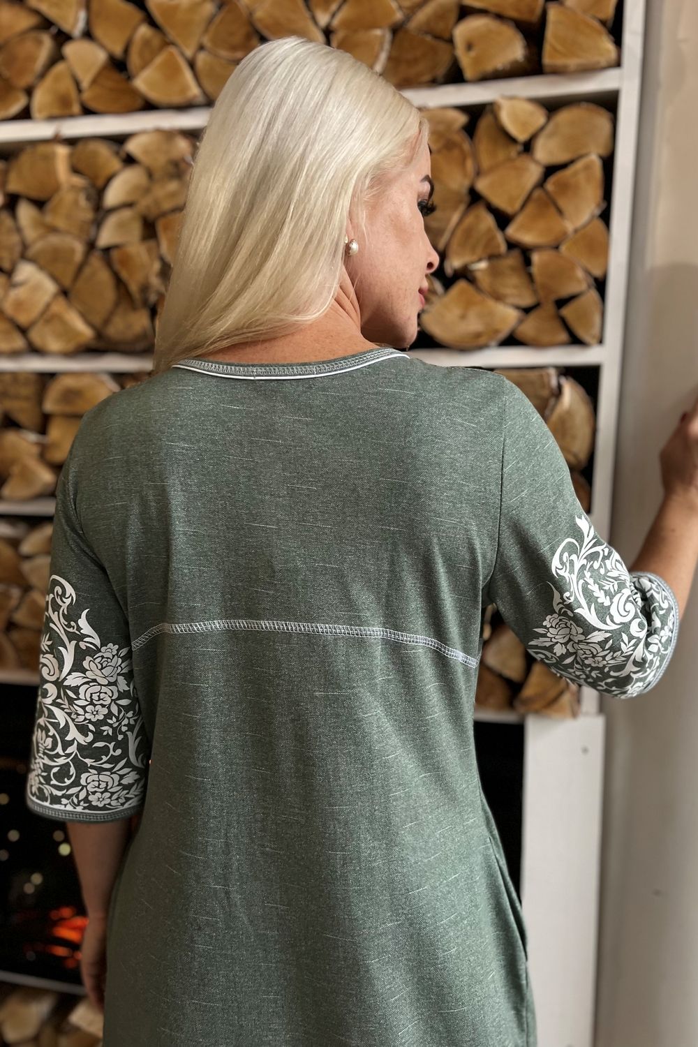 Халат на молнии, полуприлегающего силуэта, длиной ниже колена, с округлой горловиной, с карманами в боковом шве. Рукав втачной, длиной 3/4. В верхней части полочки и спинки расположены фигурные кокетки. Горловина и низ рукавов обработаны бейкой из основного полотна.