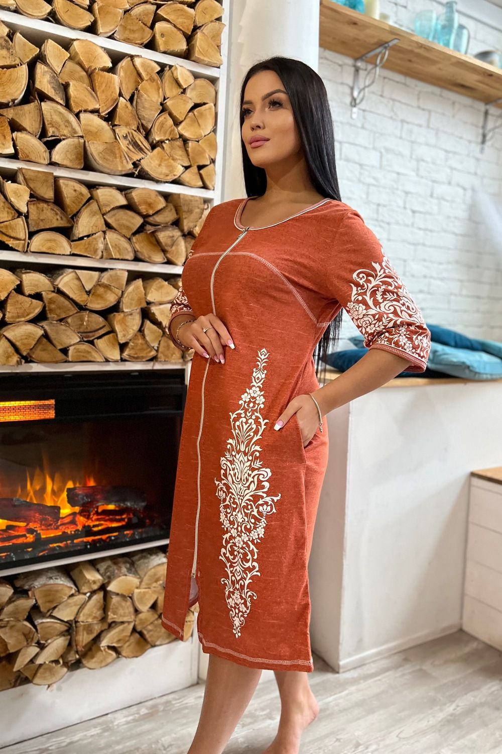 Халат на молнии, полуприлегающего силуэта, длиной ниже колена, с округлой горловиной, с карманами в боковом шве. Рукав втачной, длиной 3/4. В верхней части полочки и спинки расположены фигурные кокетки. Горловина и низ рукавов обработаны бейкой из основного полотна.