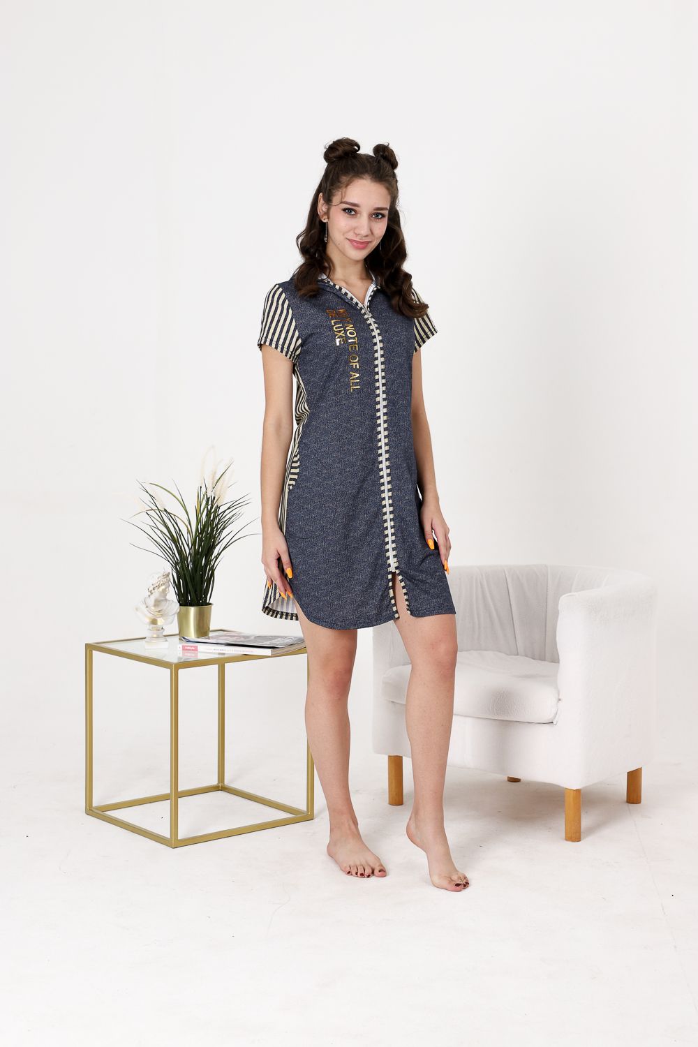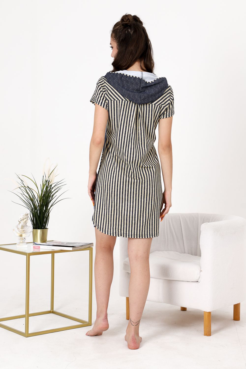 Халат на молнии, полуприлегающего силуэта, длиной выше колена, с капюшоном, с фигурной линией низа, на молнии. Рукав втачной, короткий, из отделочного полотна. На полочке расположены боковые карманы. Спинка с кокеткой, выполнена из отделочного полотна. Вход в карман, борта и капюшон обработаны бейкой из отделочного полотна.