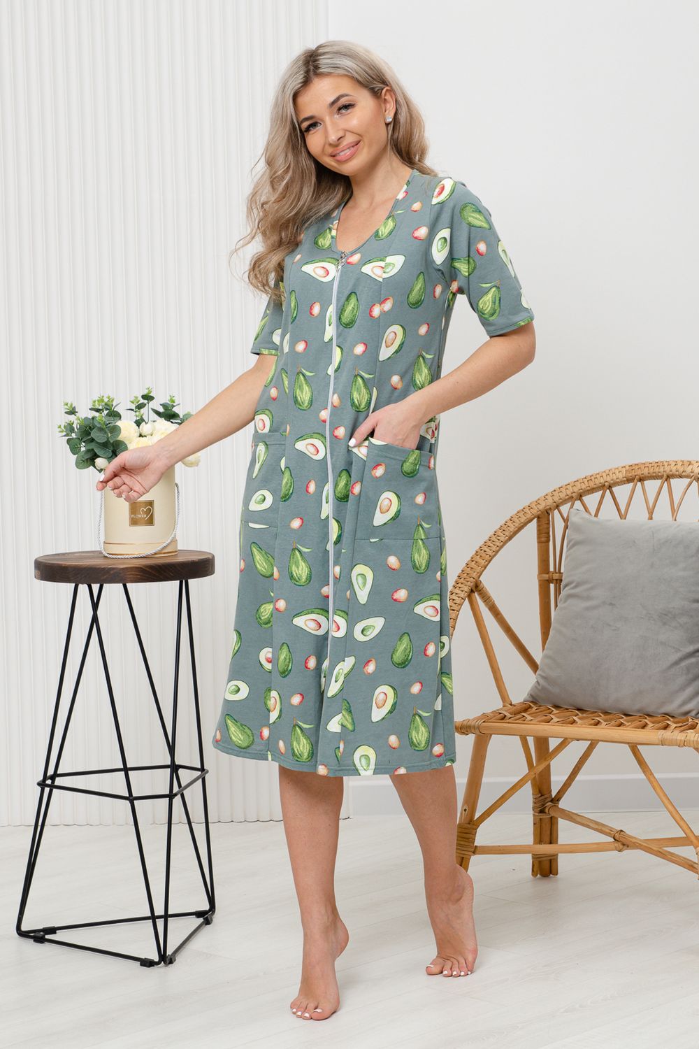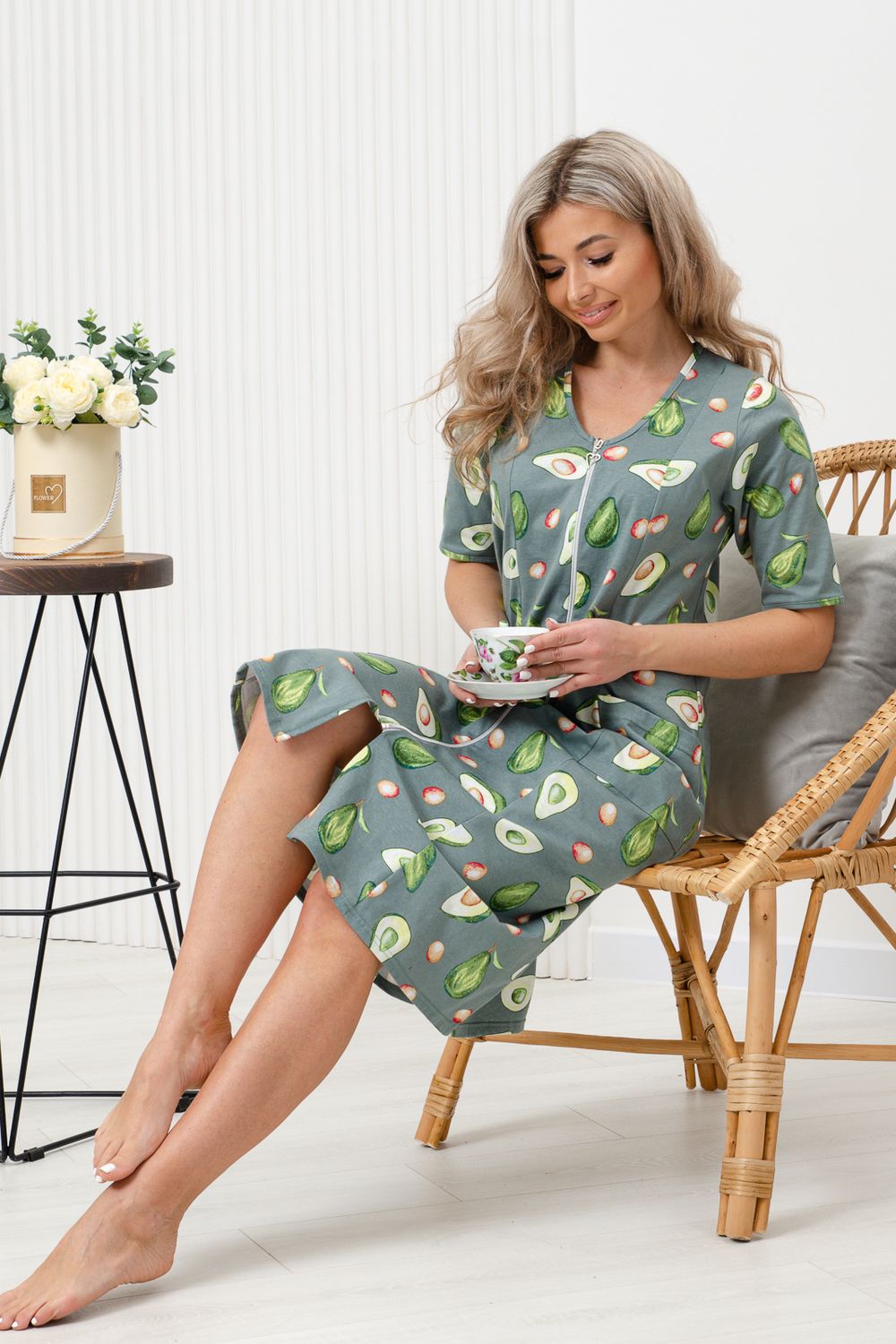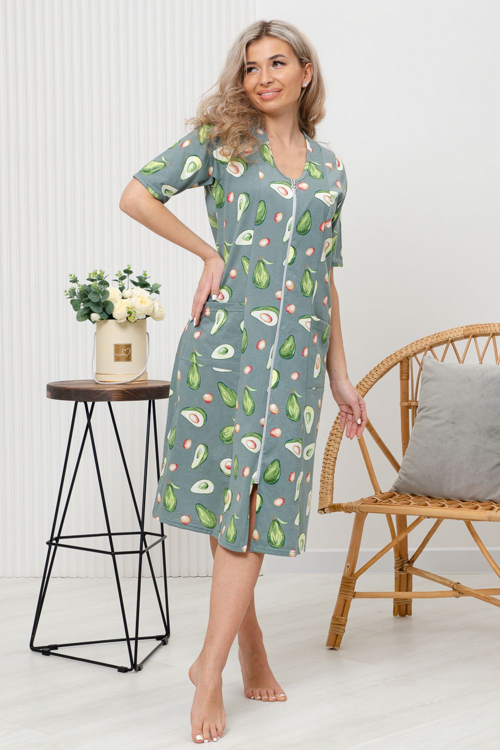 Халат женский оригинальной расцветки выполнен из 100% хлопка. Горловина имеет V-образный вырез, рукав короткий. Халат на молнии средней длины. подойдет для повседневной носки и отдыха.