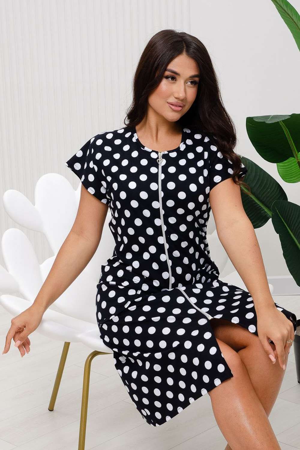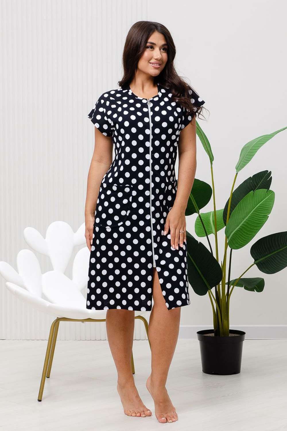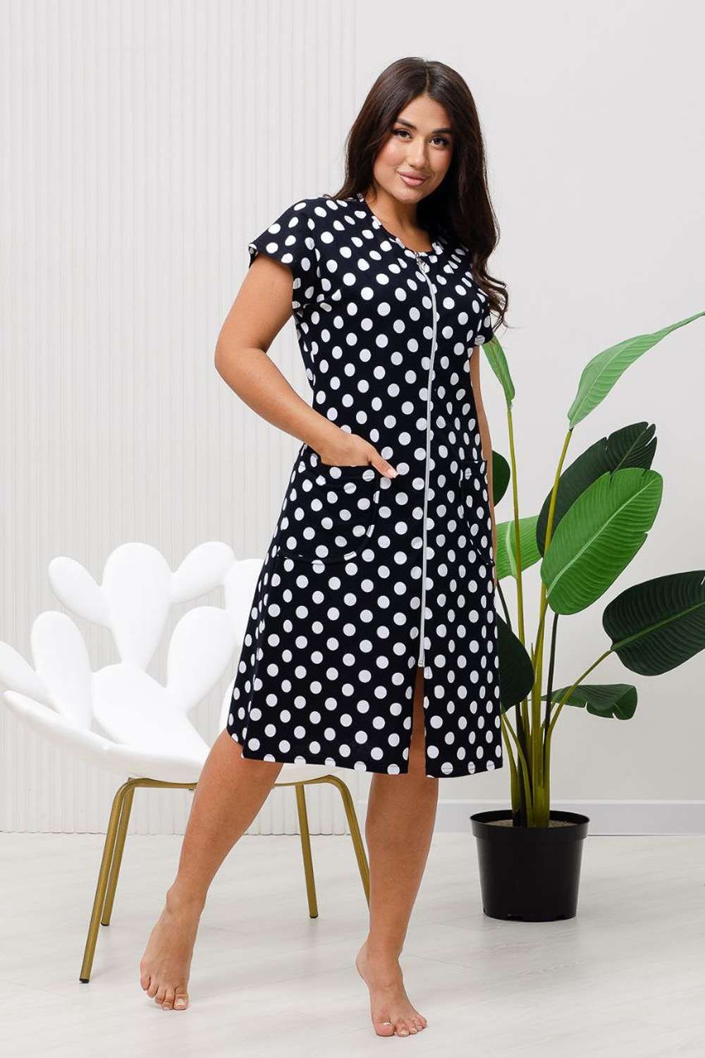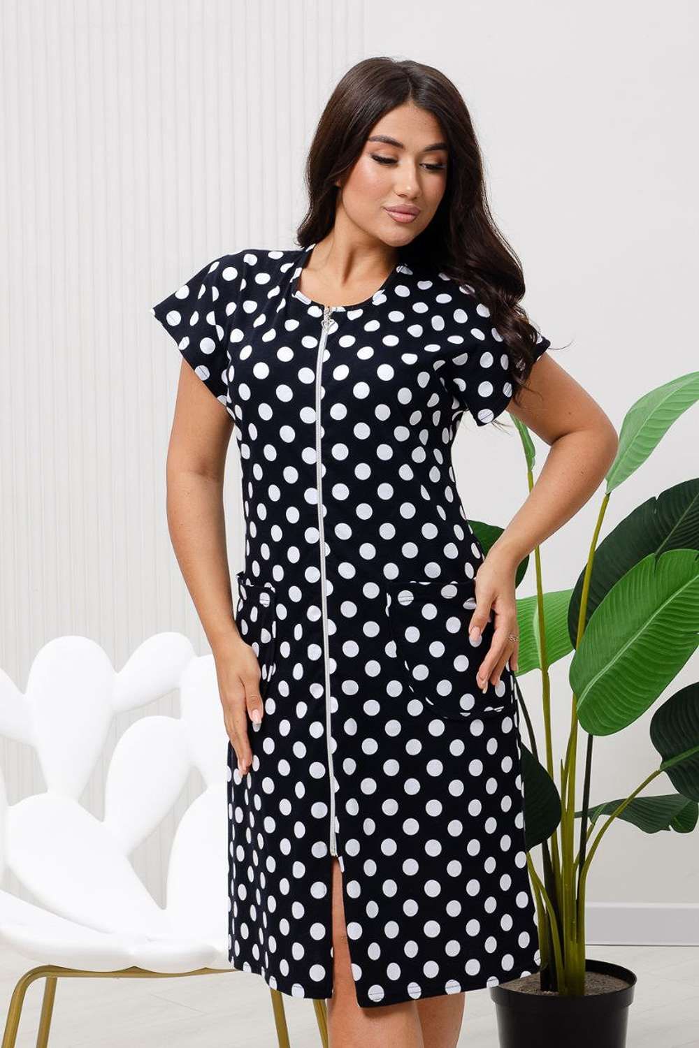 Халат женский на молнии оригинальной яркой расцветки Горох выполнен из кулирки 100% хлопок. Халат со спущенным рукавом, карман закругленной формы. Рукав подшит, горловина и карман окантованы узким кантом из основной ткани. Халат идеально подойдет для повседневной носки и отдыха.