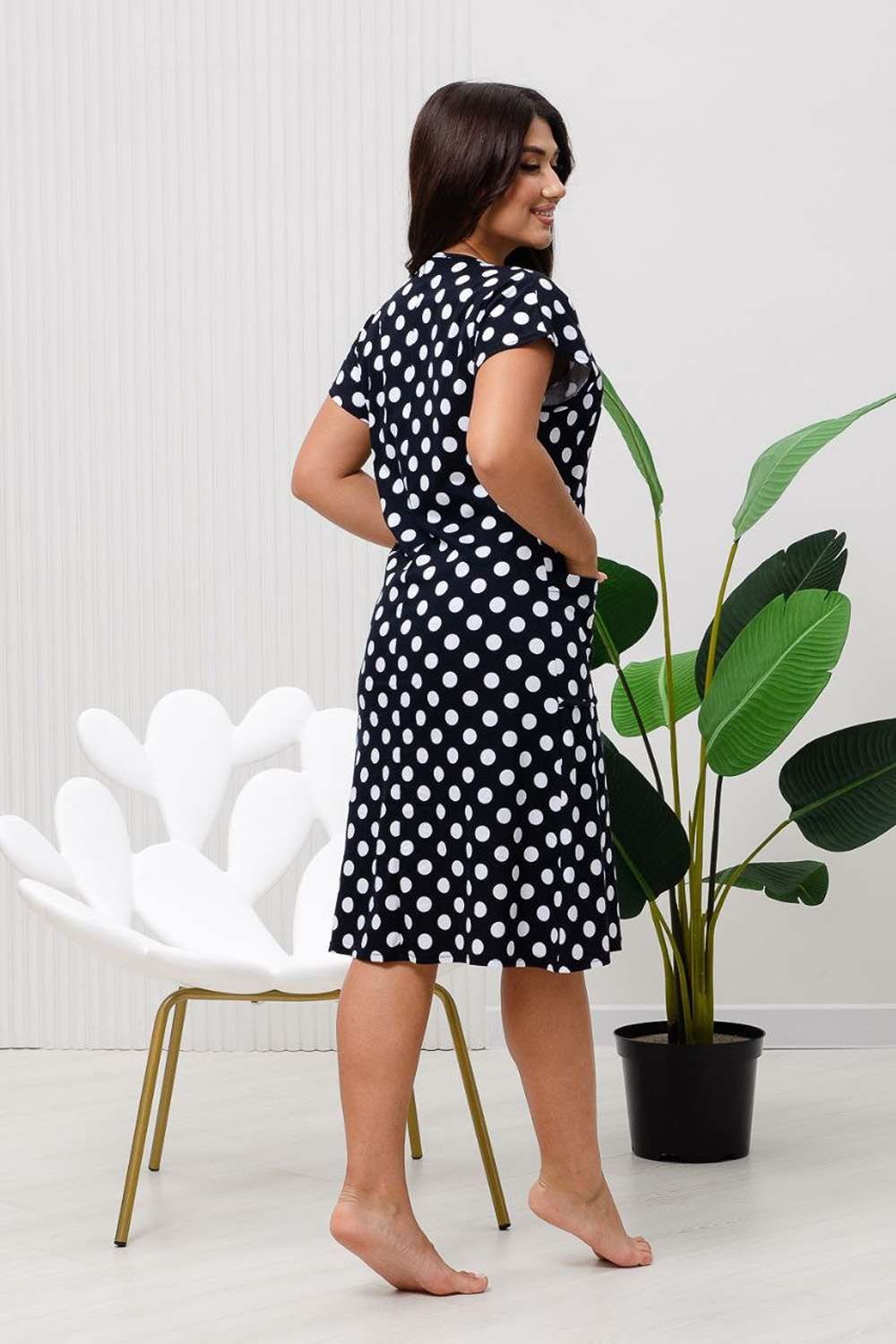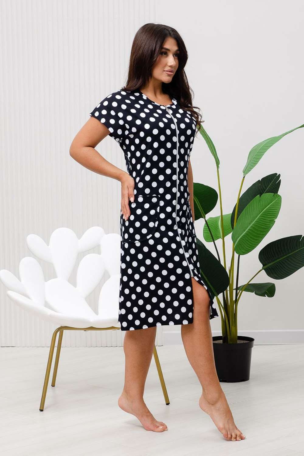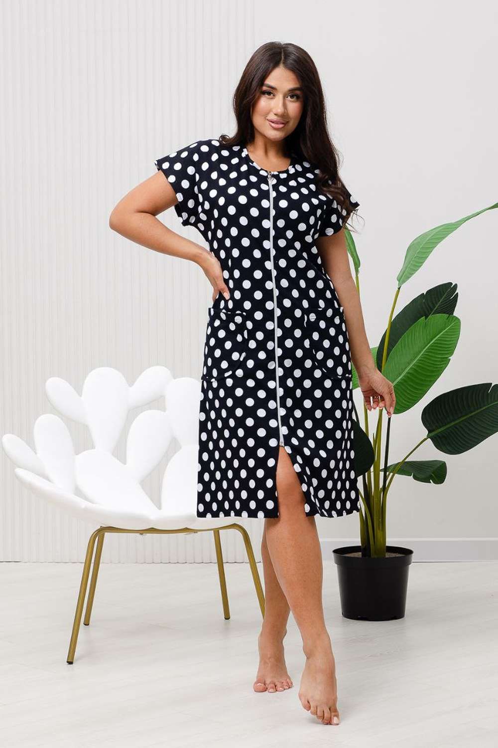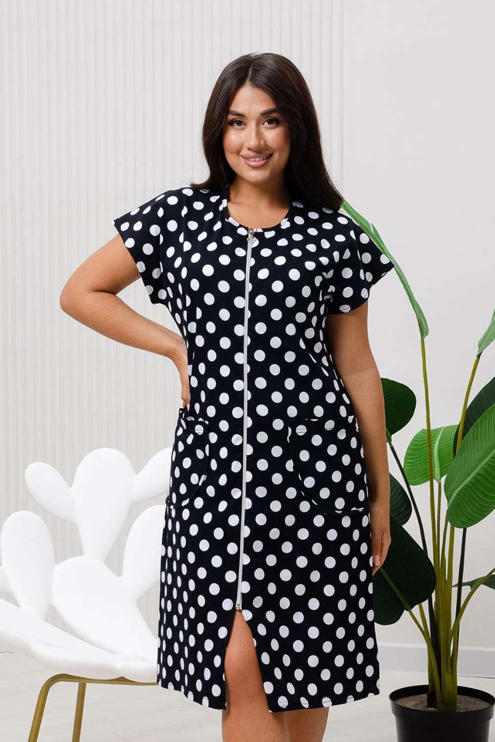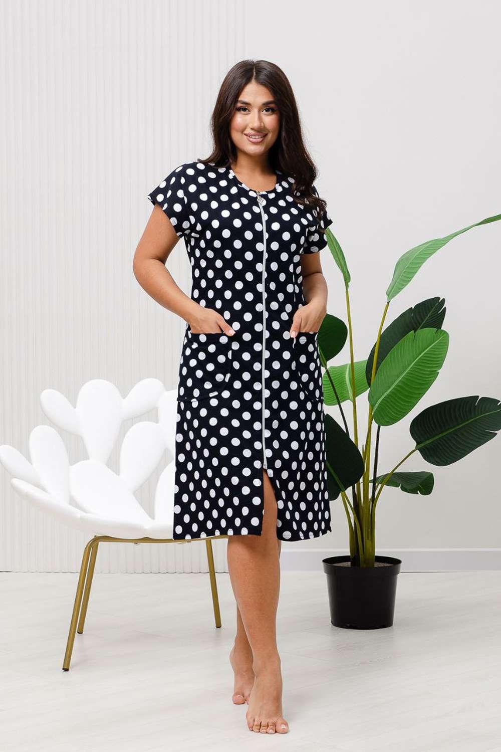 Халат женский на молнии оригинальной яркой расцветки Горох выполнен из кулирки 100% хлопок. Халат со спущенным рукавом, карман закругленной формы. Рукав подшит, горловина и карман окантованы узким кантом из основной ткани. Халат идеально подойдет для повседневной носки и отдыха.