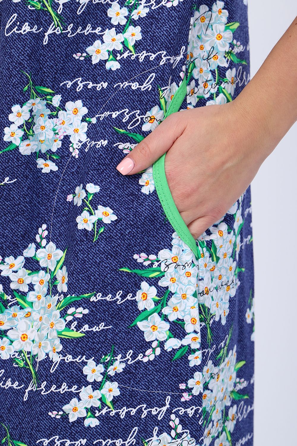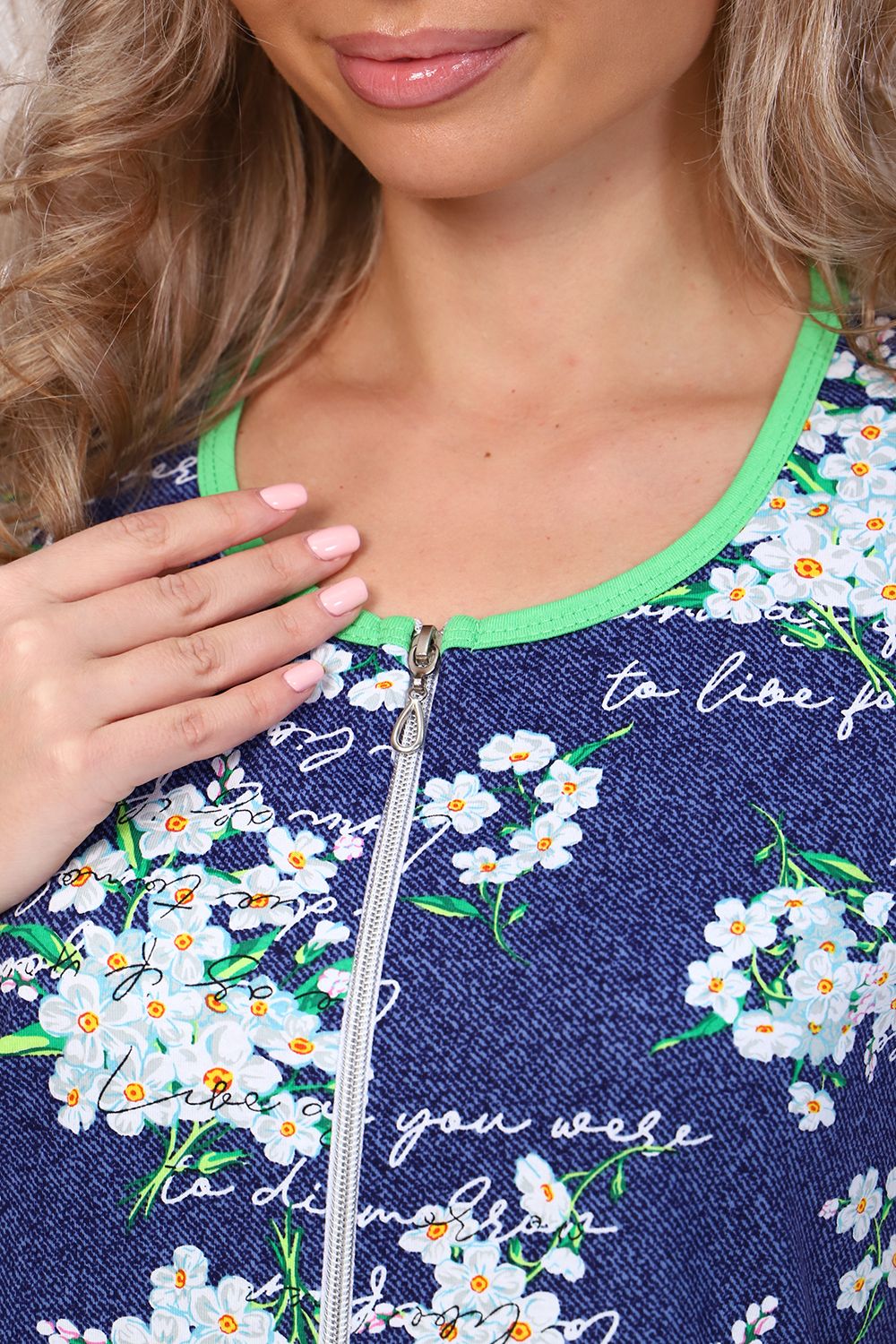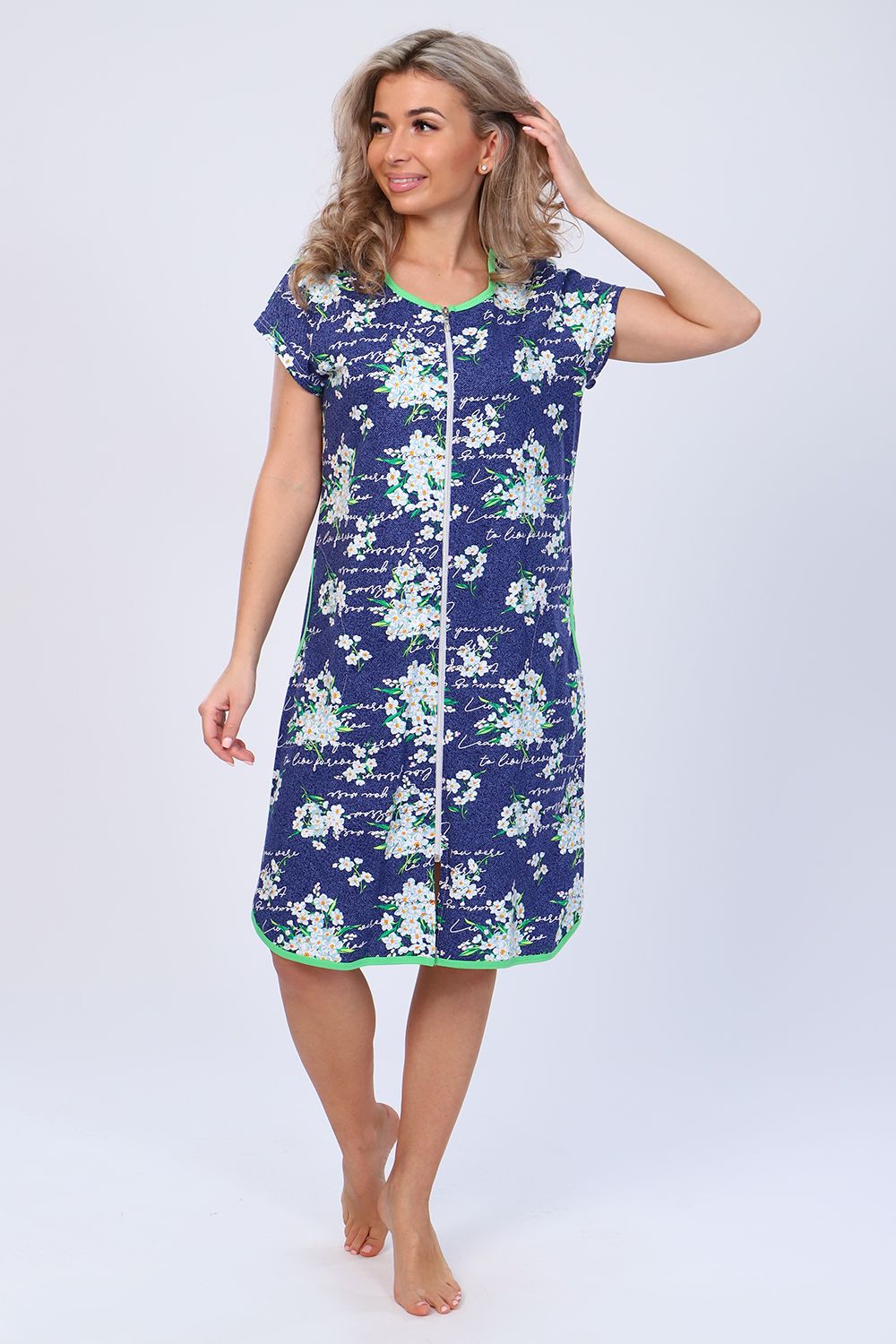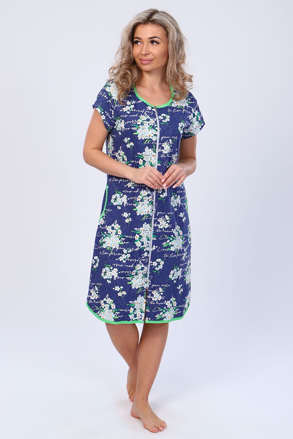 Халат - привлекательная и нужная вещь в гардеробе каждой женщины. Халат на молнии, короткий рукав. Горловина, карман и низ изделия обработан яркой бейкой. Данная модель прекрасно подойдёт для дома, дачи и отдыха, и поднимет весеннее настроение!