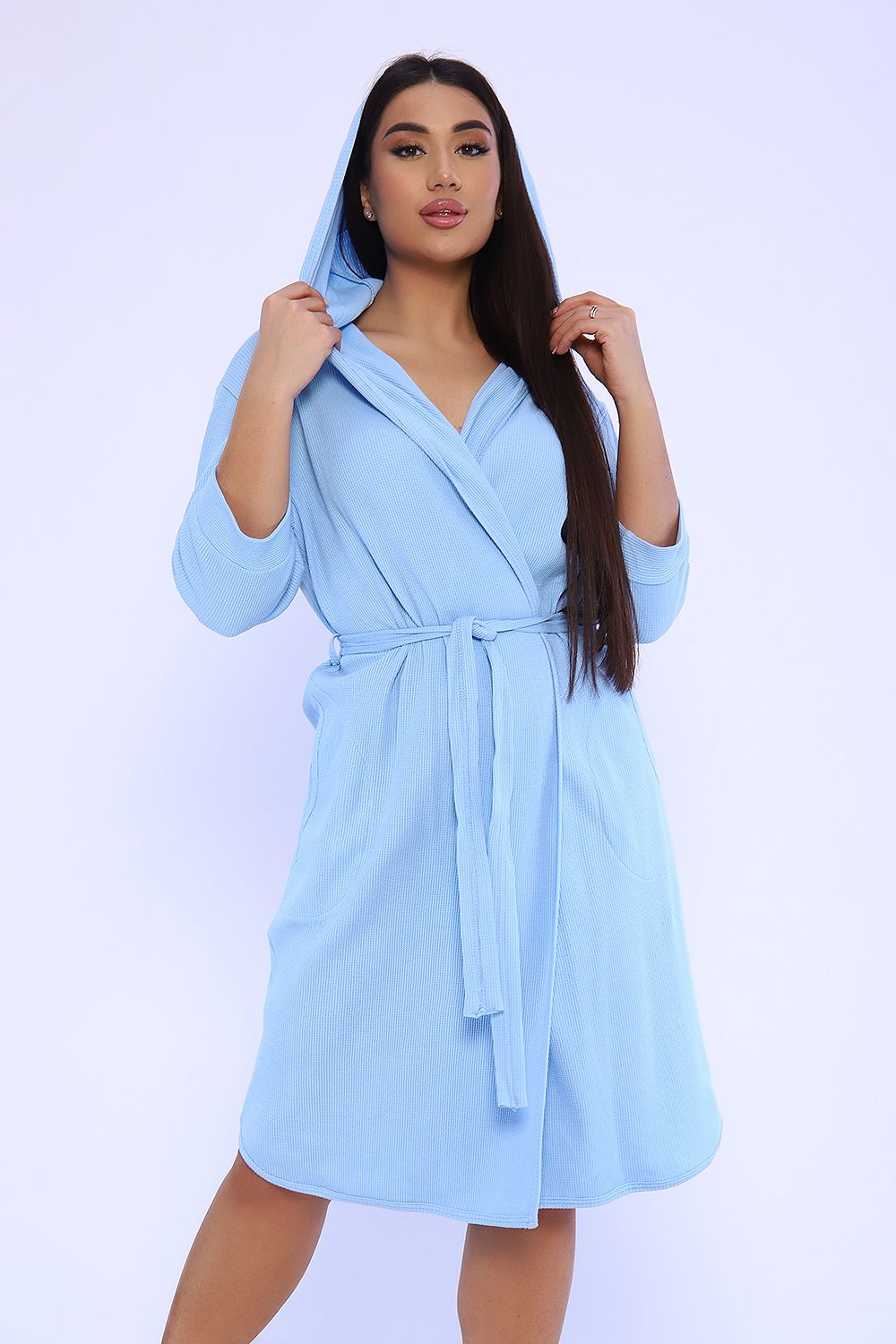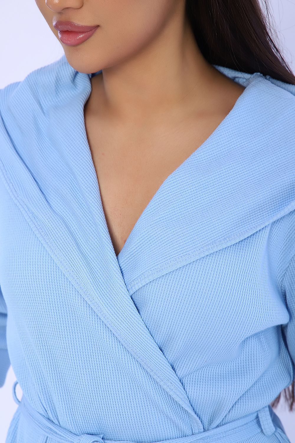 Женский халат из вафельного трикотажного полотна. Халат на запах с цельнокроеным капюшоном. Пояс на шлевках. На полочках карманы в боковом шве. Рукав 2/3 на манжете. Низ изделия закруглен к боковому шву. Халат отлично подойдет для дома, бани, сауны, SPA процедур и фитнес - клуба.