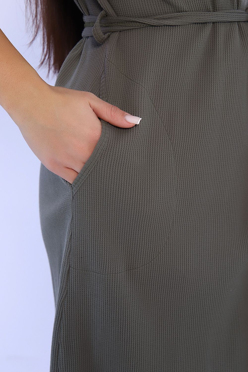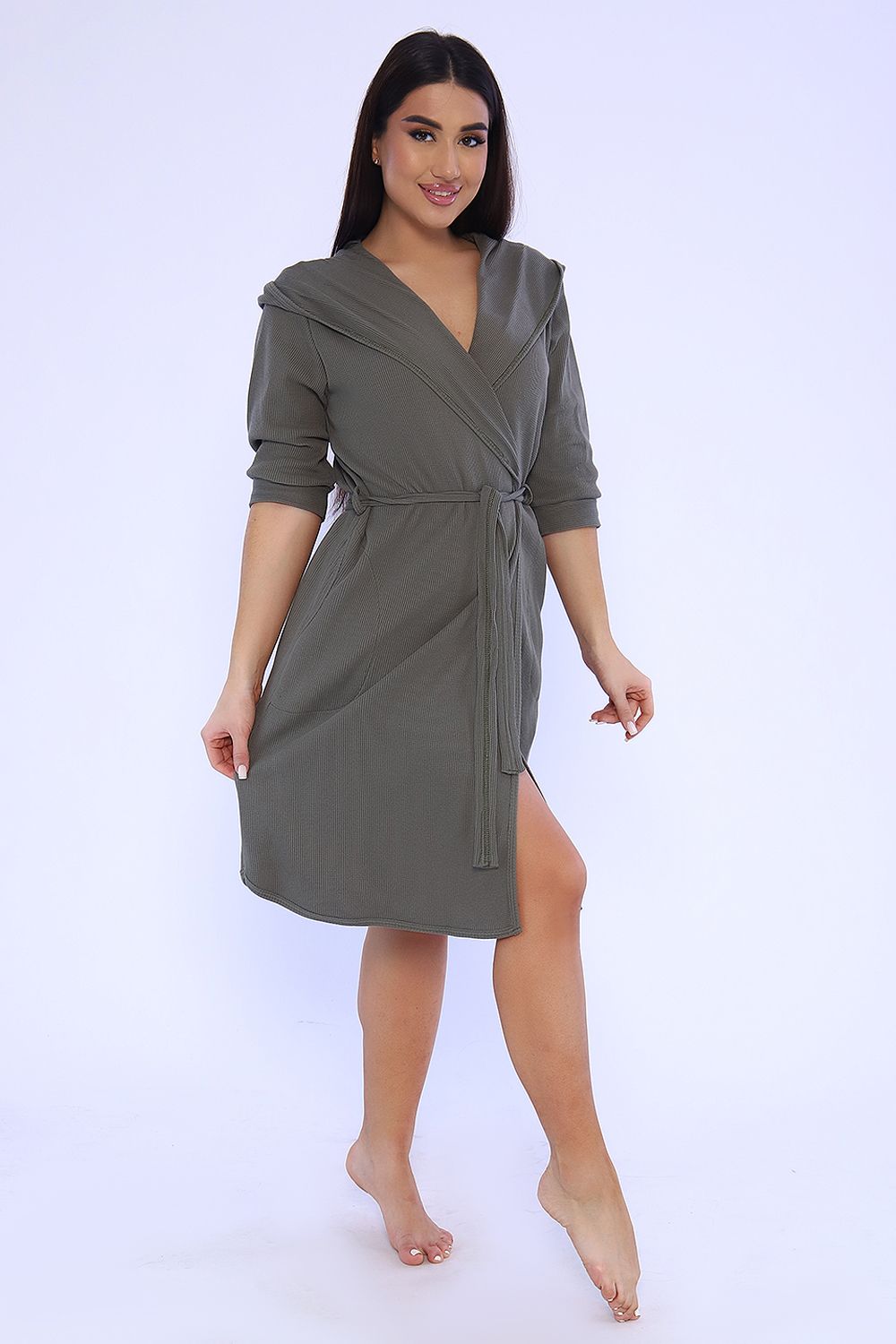 Женский халат из вафельного трикотажного полотна. Халат на запах с цельнокроеным капюшоном. Пояс на шлевках. На полочках карманы в боковом шве. Рукав 2/3 на манжете. Низ изделия закруглен к боковому шву. Халат отлично подойдет для дома, бани, сауны, SPA процедур и фитнес - клуба.